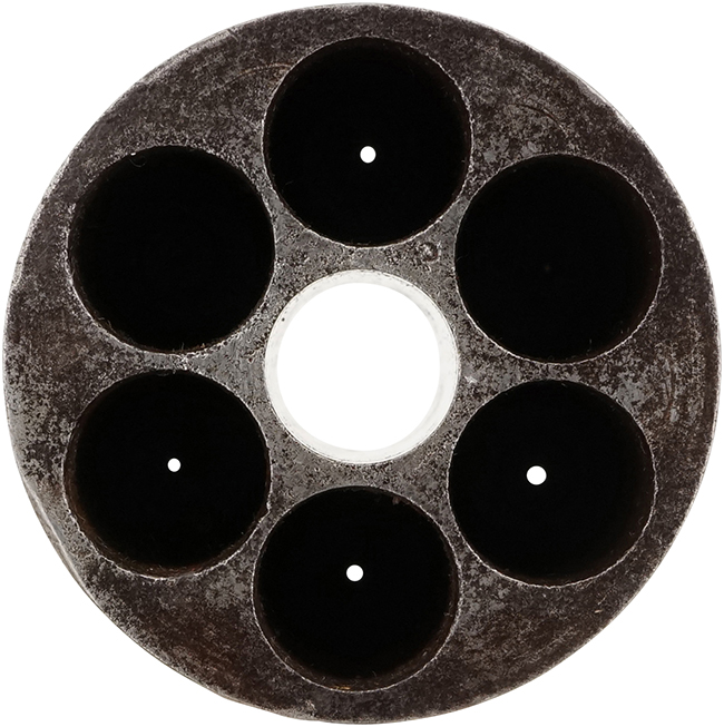 作動については完全で、ハンマーを起こした際のハーフ/フル・コックはしっかりと掛かり、シリンダーも正常に回転します。 フル・コック位置でトリガーを引くと、ハンマーがスムーズかつ力強く落ちます。 銃身内は銃口から銃身後部まで完全に抜けて (通って) おり、若干の表面錆は見られるものの、ライフリングも比較的はっきりと確認出来ます。 コルト系リボルバーの持病とも言える、銃身とフレームの取り付けのがたつきについては、現状殆ど見られません。 尚、シリンダーは前後に若干の遊びが見られますが、十分許容レベルです。 ローディング・レバーは左右に若干の遊びは見られるものの、機能については問題なく、前方に折り畳んだ際のキャッチもしっかりと掛かります。 シリンダーのパーカッション・ニップルについては、やや時代錆や若干の打ち傷は見られるものの、現状目立った欠けや変形等は見られず、概ねしっかりとした状態が保たれています。