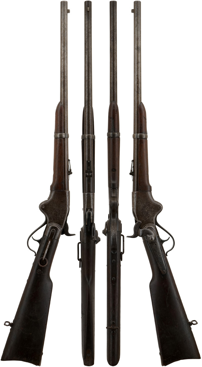 スペンサー連発銃(Spencer repeating Rifle)はクリストファー・スペンサー(Christopher Miner Spencer、1833年6月20日-1922年1月14日)が開発した後装内火式の7連発レバー・アクション ライフルで1860年から1869年の間に生産されました。 レバーを下方に引くことによってブリーチ・ブロックが下がりバット・ストック内の管状弾倉(Tube Magazine)から弾丸を薬室に送り込むと同時に空薬莢を上部から排莢します。 当時スペンサー ライフルに対抗できる連発銃はヘンリー ライフルのみでしたが、ヘンリー弾は.44RFという拳銃弾程度の威力しかなく、軍用としてのストッピング・パワーではスペンサーがヘンリーに勝っていました。 しかしながら13連発という装弾数と同じレバー操作ながら、ハンマーも同時に起すことのできるヘンリー ライフルの方に軍配があがりました。 スペンサーはレバー操作とは別にハンマーを親指で起す必要がありました。