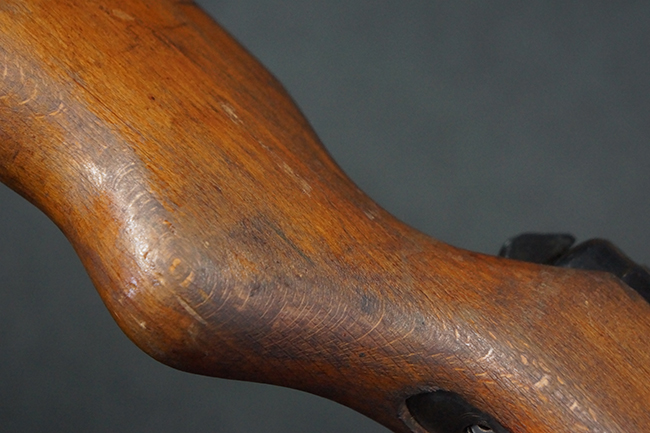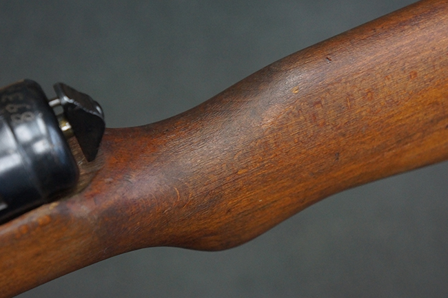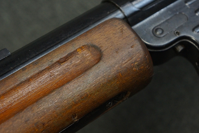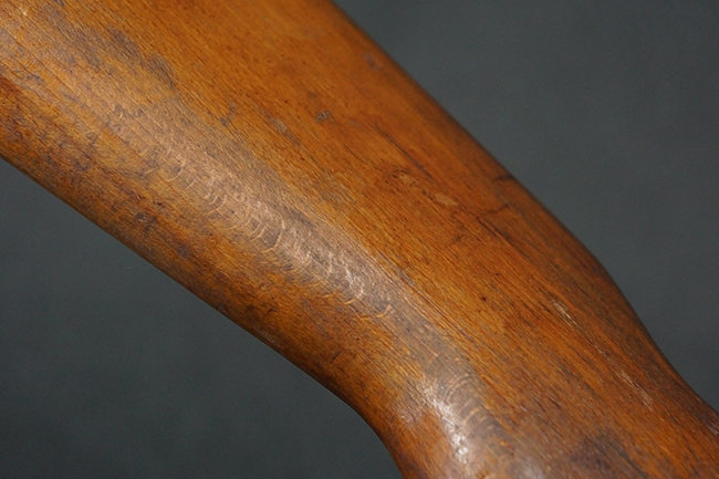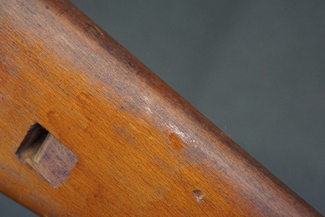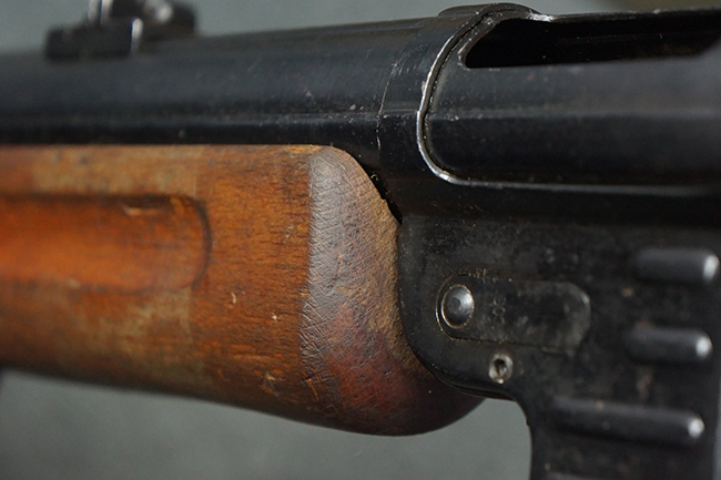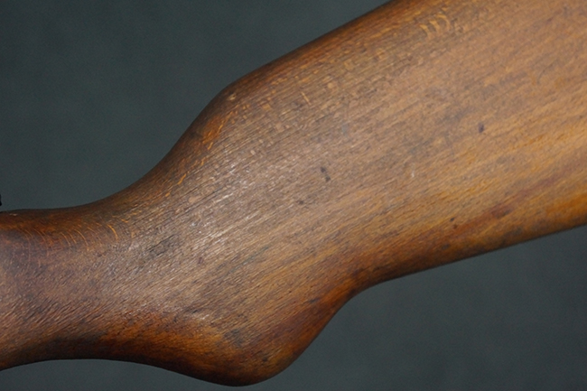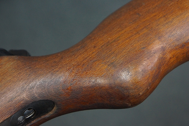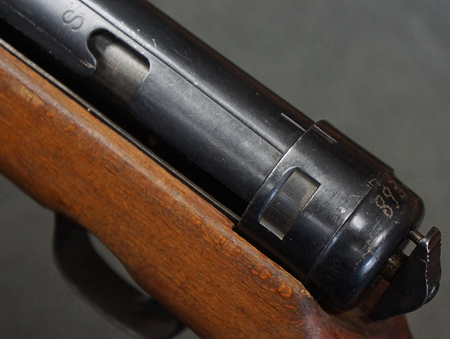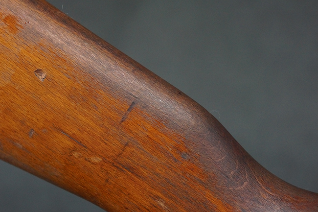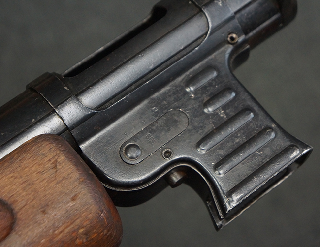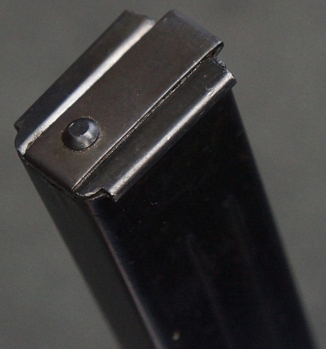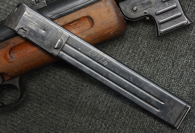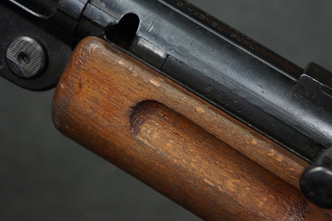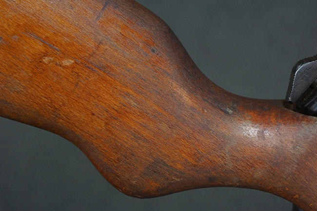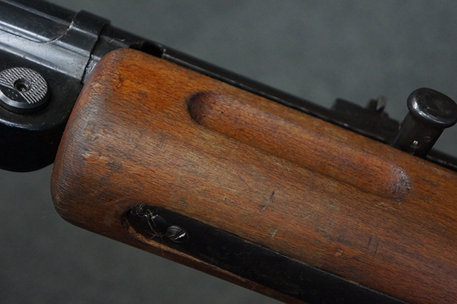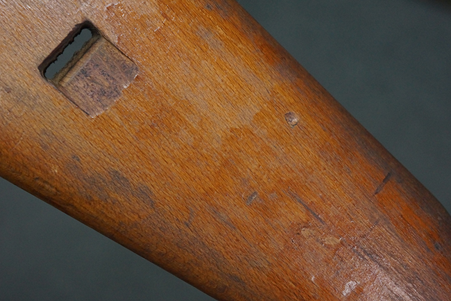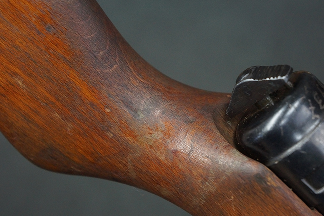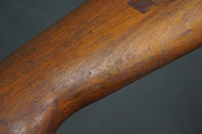 本品は全体にやや使用感が見受けられ、銃身や機関部、トリガー・ガードといった金属部は、やや打ち傷や擦れ、経年による褪色の他、やや表面錆痕が見られますが、大きな欠損等は見られず、オリジナルの表面仕上げも比較的残っています。 尚、フロント・サイト・ガードは取り付けにやや遊びが見られます。 木製銃床についても、やや打ち傷や線傷の他、銃床右側面のレシーバー周辺に一部表面的な欠けが見られるものの、大きな破損等は見られず、各部の取り付けもがたつきもなくしっかりとしています。 バット・プレートについては、やや打ち傷や時代錆が見られますが、こちらも目立った変形等は見られず、銃床への取り付けにもがたつきは見られません。 リア・サイトの切り替えやマガジンの着脱については問題なく行う事が可能です。 セレクターの切り替えも可能ですが、トリガーとの連動等は有りません。 付属のマガジンには、「M.P.41 PATENT SCHMEISSER」のパテント刻印に加えて、ハーネル社のロゴが打刻されている他、20526の番号が電気ペンにより入っています。 マガジンについてもやや使用感が見受けられ、若干の打ち傷や擦れ、表面錆痕の他、一部僅かな凹みが見られるものの、現状大きな変形や欠損等は見られません。 尚、マガジン・スプリングは入っています。