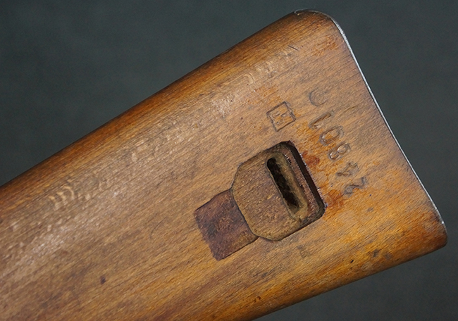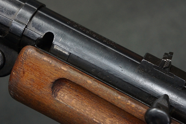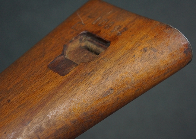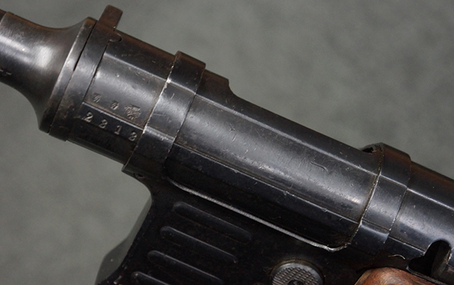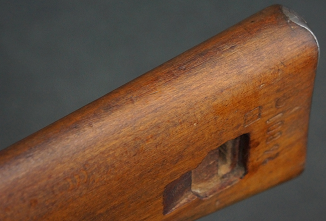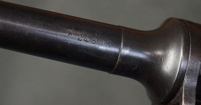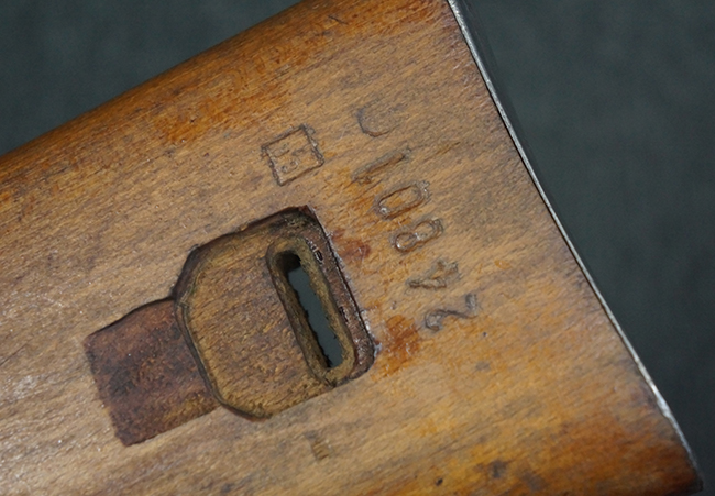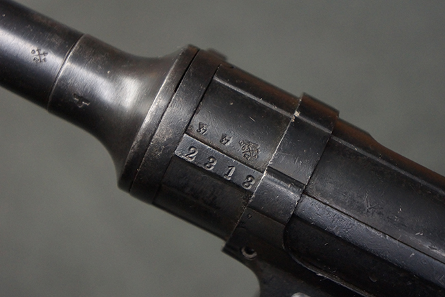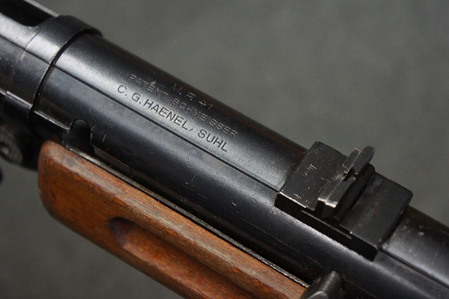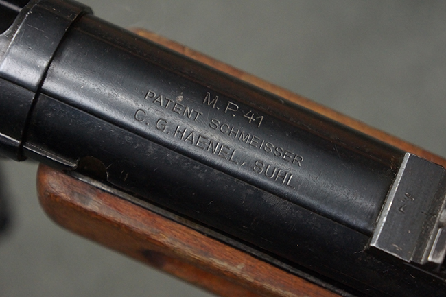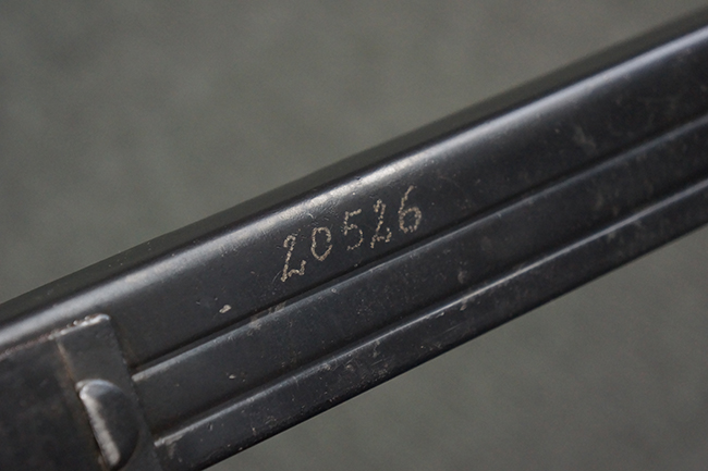 本品のレシーバー上面には、「M.P.41 PATENT SCHMEISSER C.G.HANEL, SUHL」の刻印がはっきりと確認出来ます。 シリアルNo.は、レシーバーが2313、銃身が2480B、バット・ストックが24801、ボルトが6903となっており、レシーバー・エンド・キャップには8937の番号が電気ペンにより入っています。 その他、各部にヴァッフェン・アムト刻印が確認出来ます。