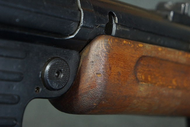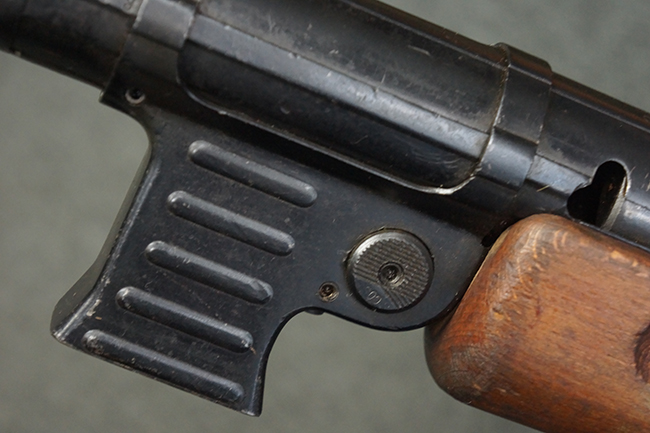 MP40からの変更点として、ハンドガード及びグリップ部分が木製の曲銃床に変更されている他、MP40の銃身下部のバレル・レストが省略されました。 トリガー・メカニズムの構造についてはMP28IIからの流用となっており、セミ/フル・オートマチック射撃の切り替えボタンがトリガー上部に追加されています。 尚、MP40では本体下部に設けられていた通常分解用のロッキング・ラッチは、MP41ではレシーバー後端のエンド・キャップへと移設されています。 このエンド・キャップに設けられたロッキング・ノブを押し込みながら、時計回りに回転させることによりエンド・キャップが外れ、リコイル・スプリング・アッセンブリーの取り外しが可能となります。