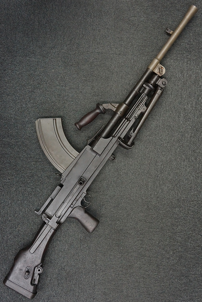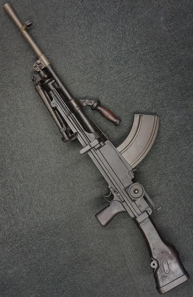 第二次世界大戦で使用された英軍の主要軽機関銃です。 第一次世界大戦後の1920年代、英軍はそれまでの主力軽機関銃であったルイス軽機関銃に代わる新たな軽機関銃のトライアルを開始しました。 1930年代に入るとチェコ製のZB Vz.26の改良型であるZB Vz.27軽機関銃 (後に更なる改良型のZB Vz.30軽機関銃) を新たに候補に加えてトライアルが続けられ、最終的にはこのZB系軽機関銃に改良を加えた物がブレン軽機関銃 (ブレンガン) として英軍に制式採用されました。 ブレン (BREN) の名称は、チェコのブルーノ (Brno) 造兵廠と英国のエンフィールド (Enfield) 造兵廠の名称を組み合わせた物です。 ブレン軽機関銃では.303ブリティッシュ弾を使用する事から、マガジンはバナナ型の形状に変更されています。