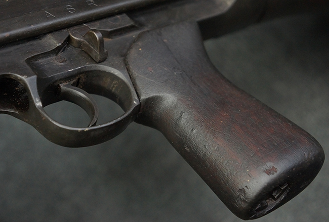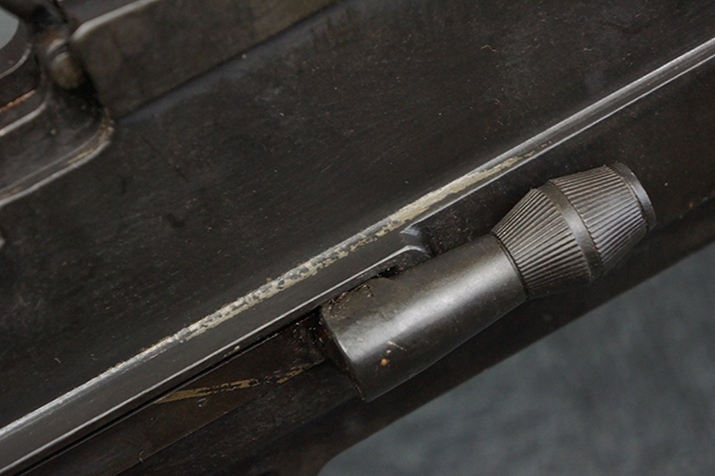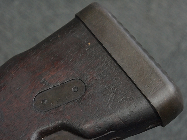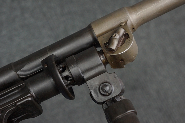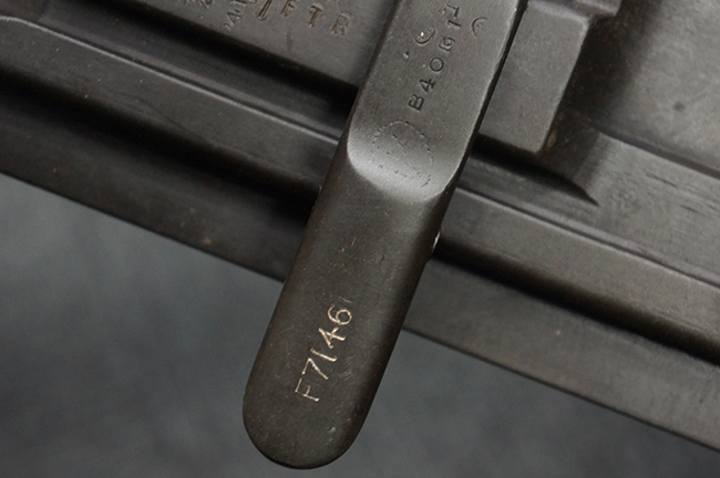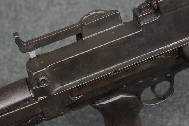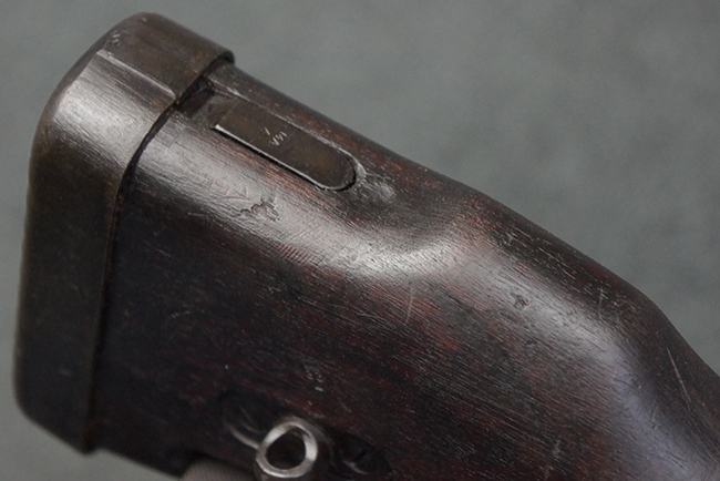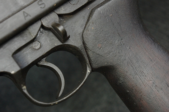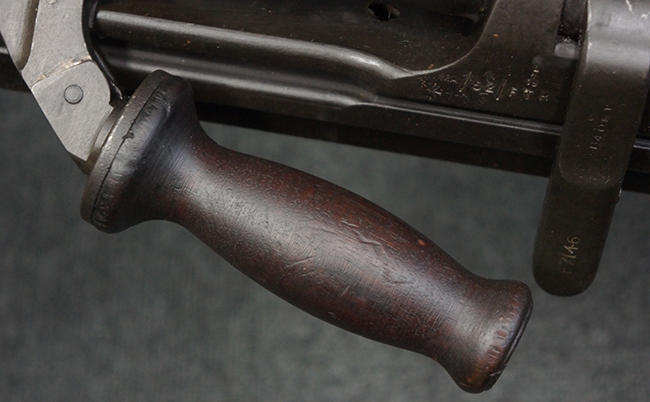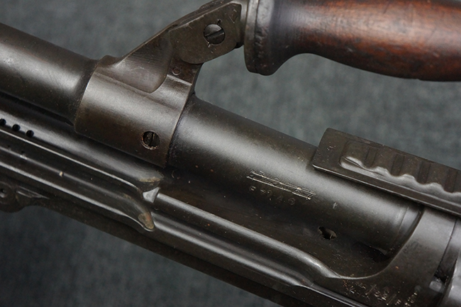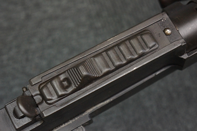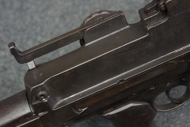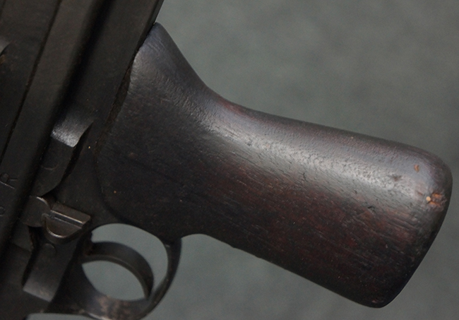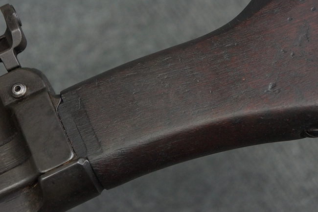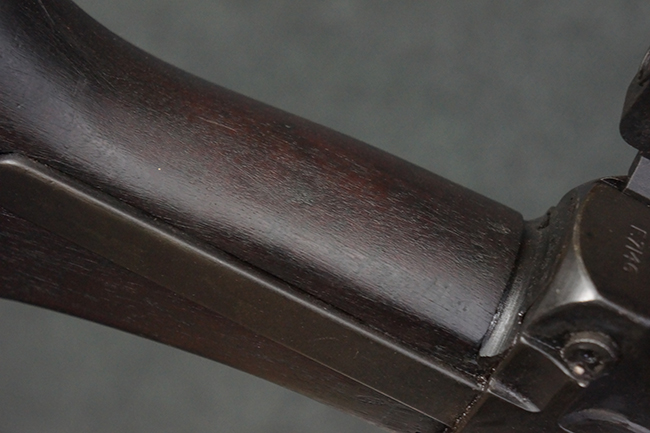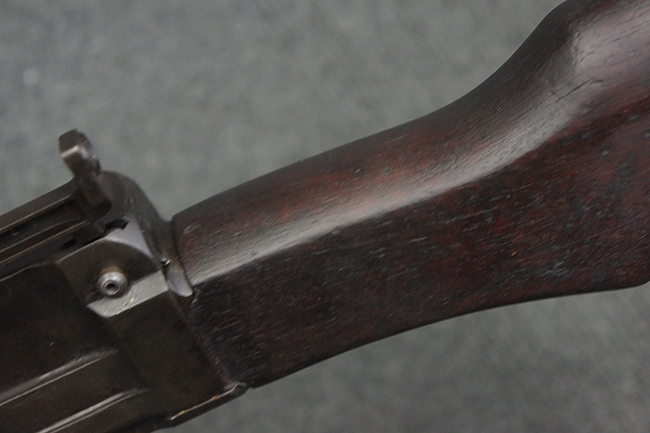 本品の銃身や機関部といった金属部は、やや打ち傷や擦れは見られるものの、目立った欠損等は見られず、表面仕上げも比較的良好に残っています。 グリップやキャリング・ハンドル、バット・ストックといった木部についても、色味はほぼ揃っており、やや打ち傷や線傷、一部僅かな欠けは見られるものの、全体としては大きな破損等は見られず、比較的しっかりとした状態が保たれています。 グリップ左側面前部に一部ヘアライン・クラックが見られますが、強度的には影響のないレベルのものです。