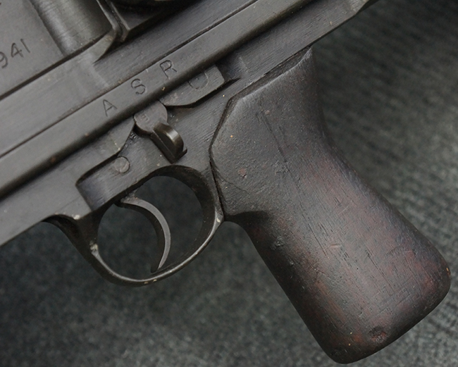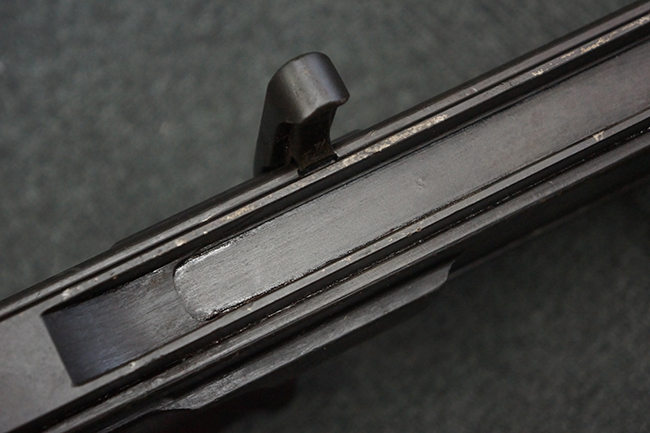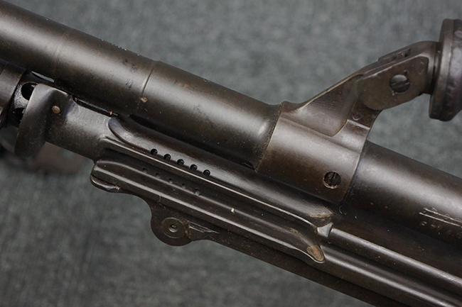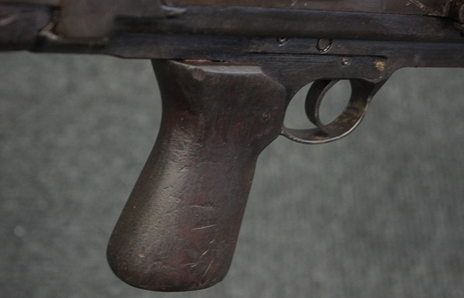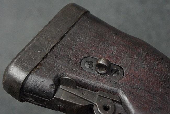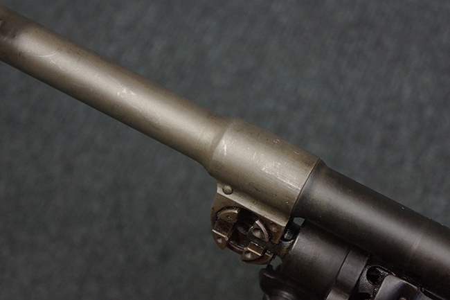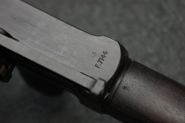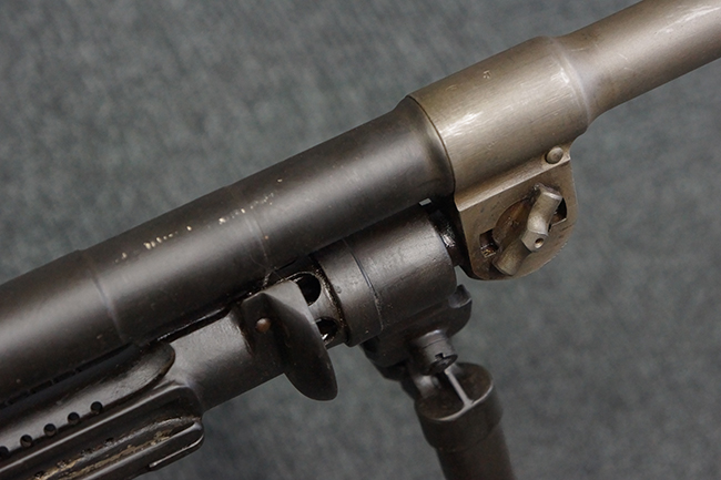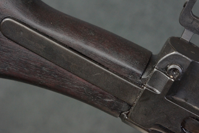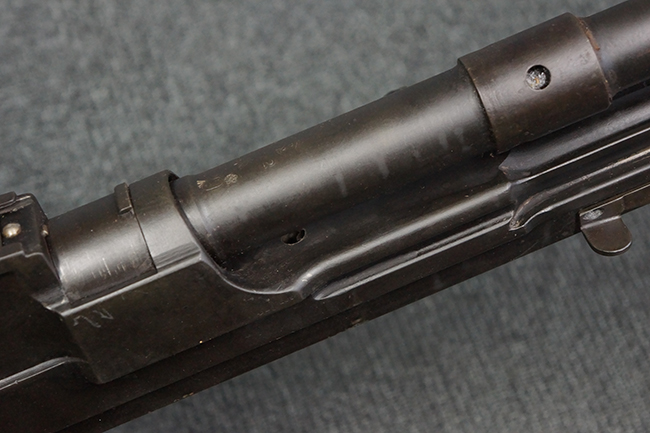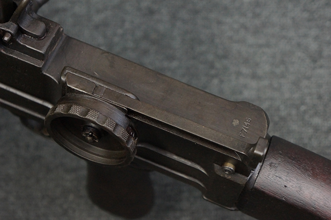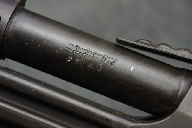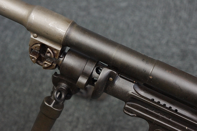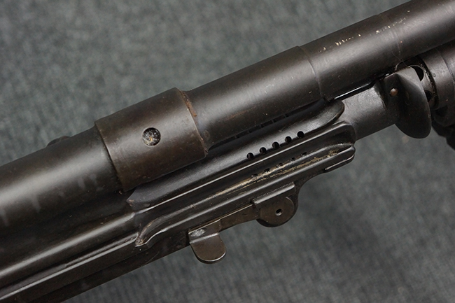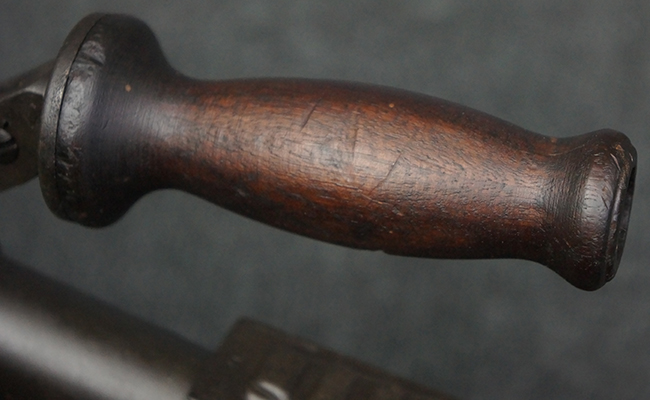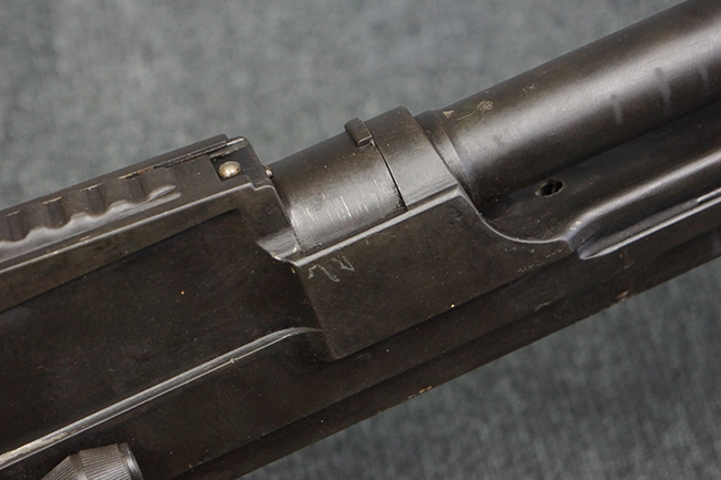 本品の銃身や機関部といった金属部は、やや打ち傷や擦れは見られるものの、目立った欠損等は見られず、表面仕上げも比較的良好に残っています。 グリップやキャリング・ハンドル、バット・ストックといった木部についても、色味はほぼ揃っており、やや打ち傷や線傷、一部僅かな欠けは見られるものの、全体としては大きな破損等は見られず、比較的しっかりとした状態が保たれています。 グリップ左側面前部に一部ヘアライン・クラックが見られますが、強度的には影響のないレベルのものです。
