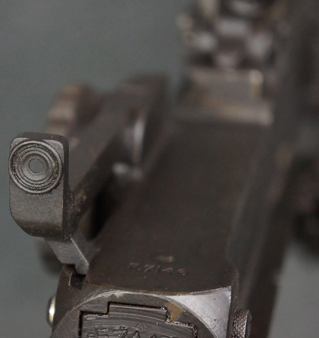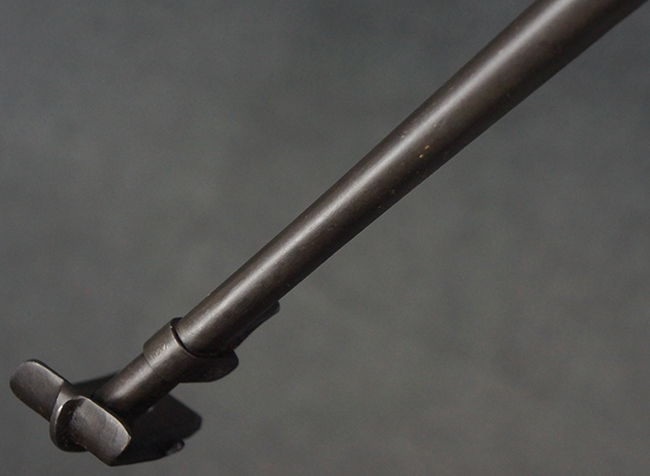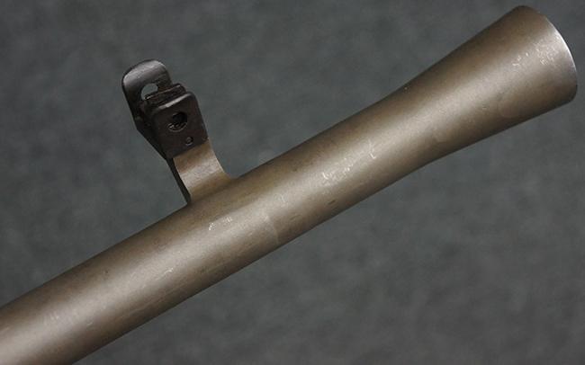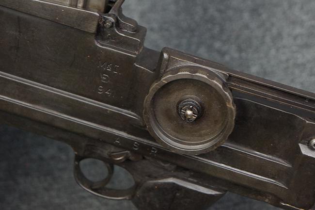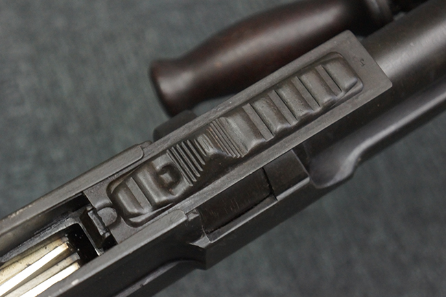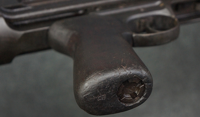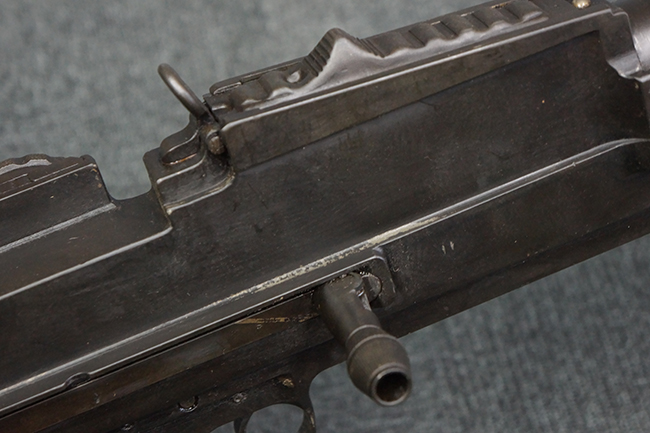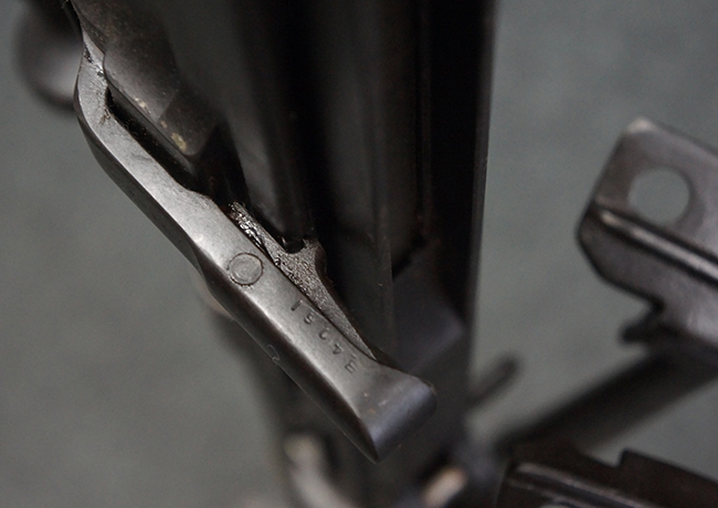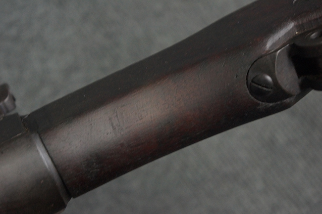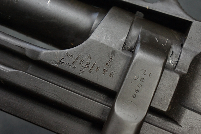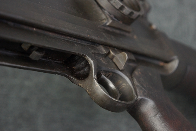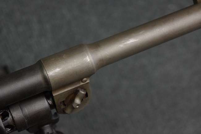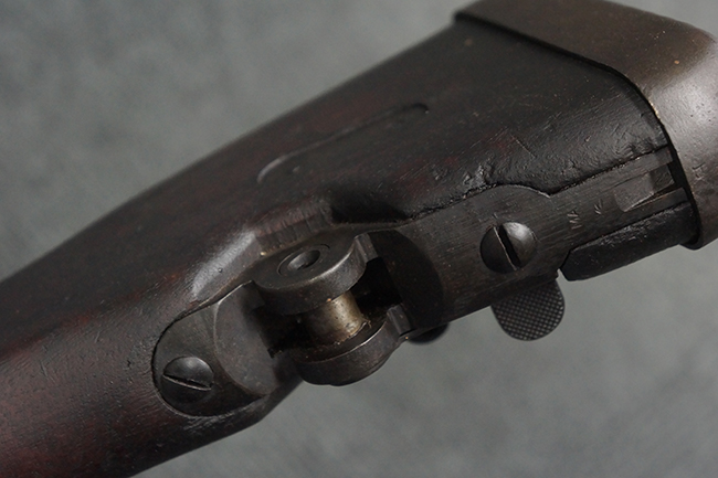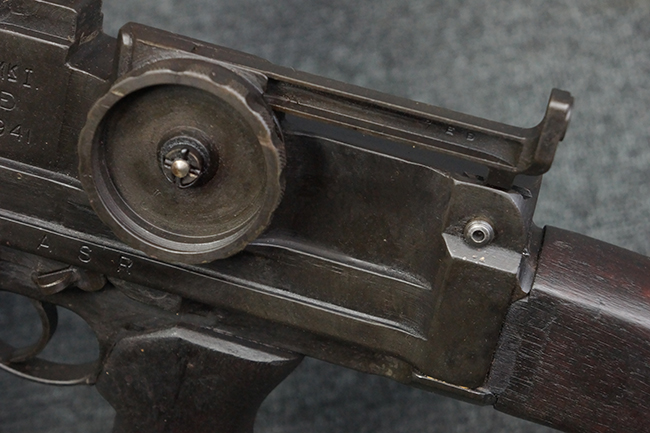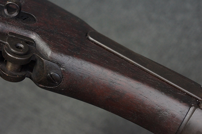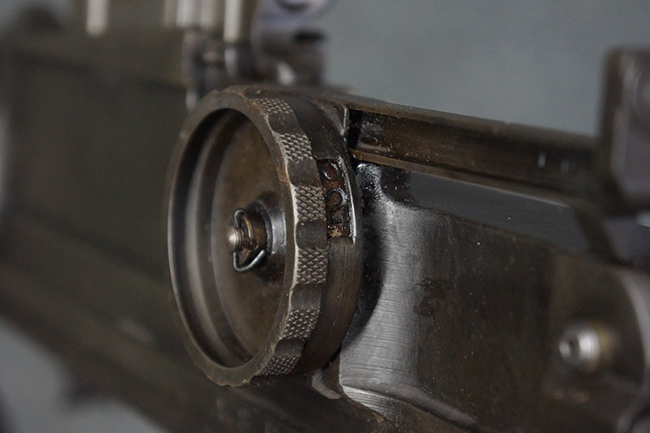 本品の銃身や機関部といった金属部は、やや打ち傷や擦れは見られるものの、目立った欠損等は見られず、表面仕上げも比較的良好に残っています。 グリップやキャリング・ハンドル、バット・ストックといった木部についても、色味はほぼ揃っており、やや打ち傷や線傷、一部僅かな欠けは見られるものの、全体としては大きな破損等は見られず、比較的しっかりとした状態が保たれています。 グリップ左側面前部に一部ヘアライン・クラックが見られますが、強度的には影響のないレベルのものです。