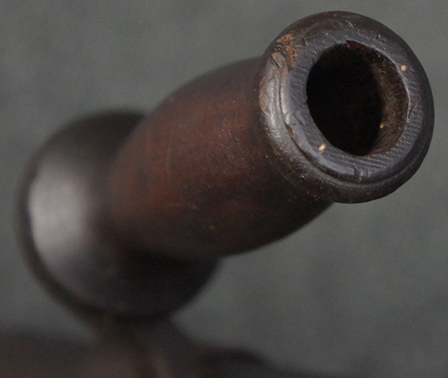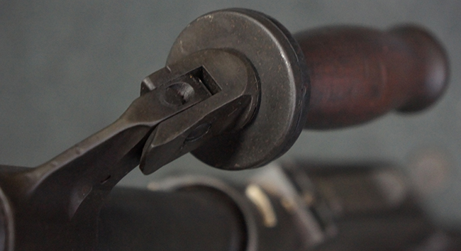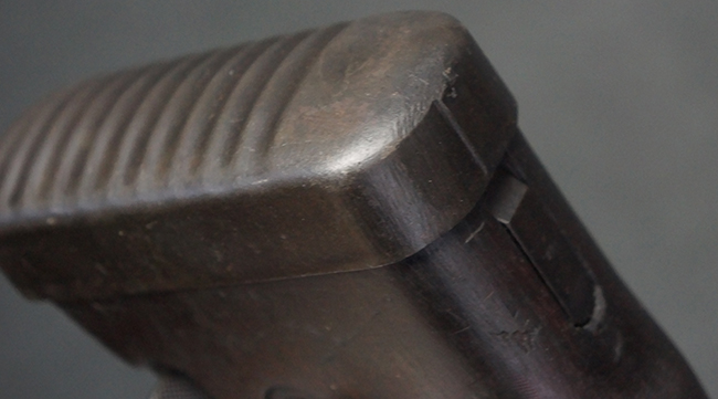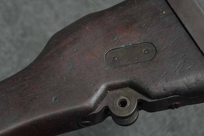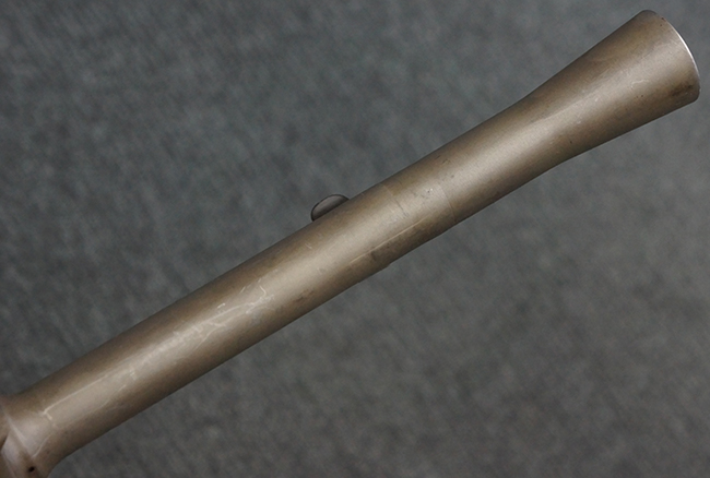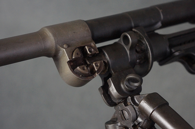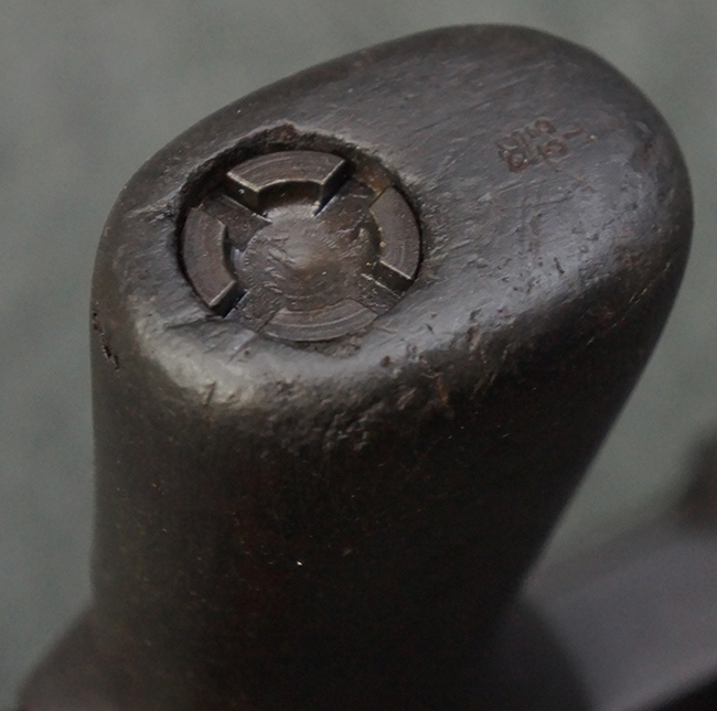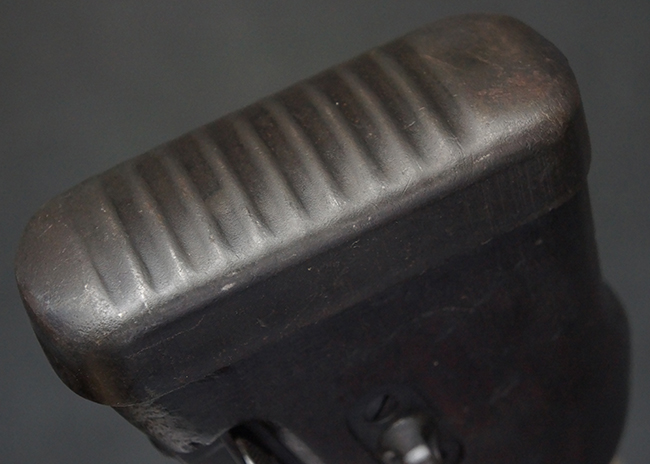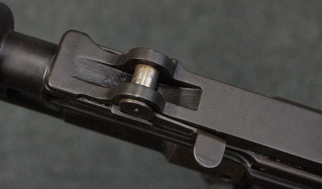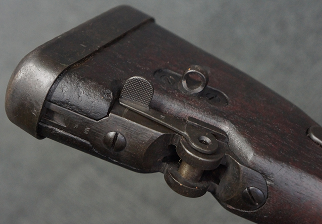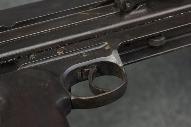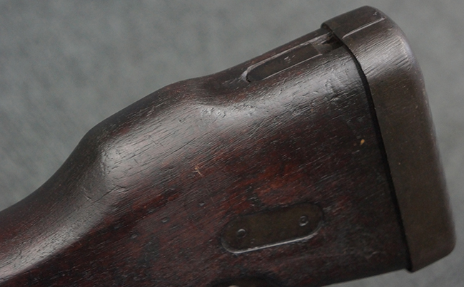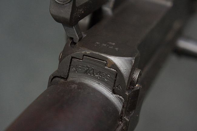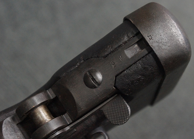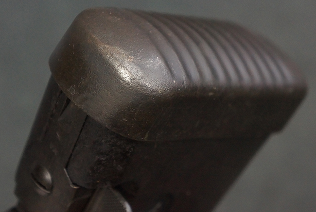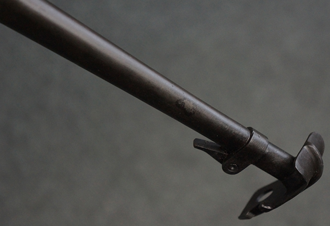 本品の銃身や機関部といった金属部は、やや打ち傷や擦れは見られるものの、目立った欠損等は見られず、表面仕上げも比較的良好に残っています。 グリップやキャリング・ハンドル、バット・ストックといった木部についても、色味はほぼ揃っており、やや打ち傷や線傷、一部僅かな欠けは見られるものの、全体としては大きな破損等は見られず、比較的しっかりとした状態が保たれています。 グリップ左側面前部に一部ヘアライン・クラックが見られますが、強度的には影響のないレベルのものです。