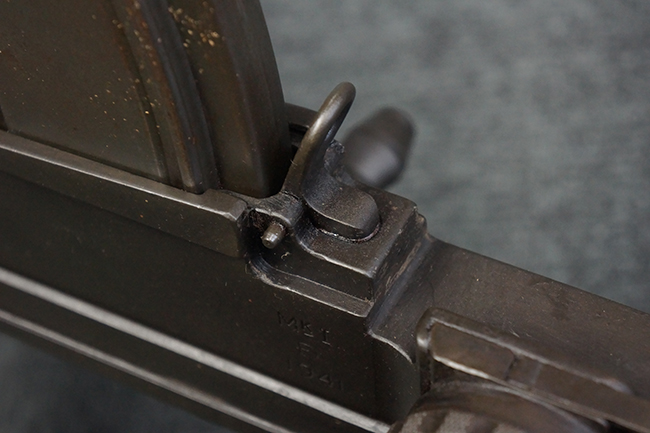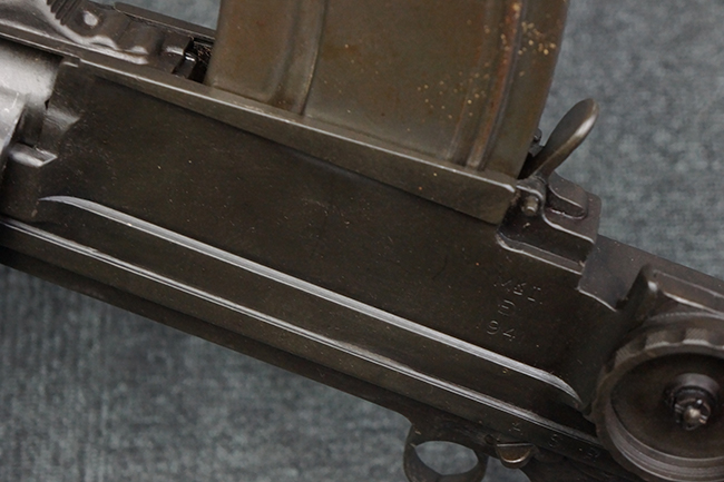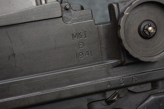 本品のアッパー・レシーバー左側面には「MKI」のモデル名の他、エンフィールド造兵廠 (RSAF=Royal Small Arms Factory, Enfield) を示す「E」と「D」の文字を組み合わせたモノグラムや製造年を示す「1941」の刻印が打刻されています。 本品はバット・ストックにサポート・ハンドルが取付け可能ですが、ショルダー・レストがない戦時型Mk Iタイプです。 銃身は銃口部のハイダー部分が初期型のブレン Mk Iに比べて短くなったタイプで、製造年代とマッチしています。 二脚は伸縮式のMk Iタイプで、石突部分にはカナダのJohn Inglis社を示す「JI」の刻印が入っています。 本品は銃身交換用レバー前方の本体左側面に「MA/52/FTR」の刻印が入っている事から、本個体がオーストラリアのリスゴー造兵廠 (MA=Munitions Australia) において1952年に各部品の強度検査や摩耗した部品等の正規の交換修理であるFTR (Factory Through Repair) を受けた事が窺えます。 アッパー・レシーバー及び銃身交換用レバーにはシリアルNo.F7146が入っており、ロア・レシーバーと銃身のシリアルNo.も打ち直しによりマッチしています。 他にも各部にブロード・アロー刻印が確認出来ます。