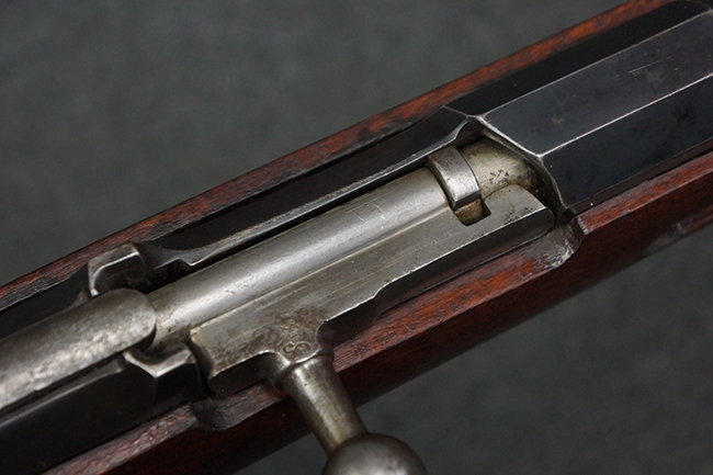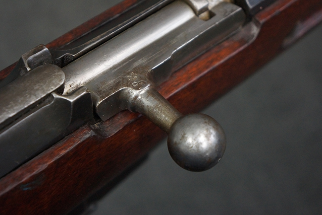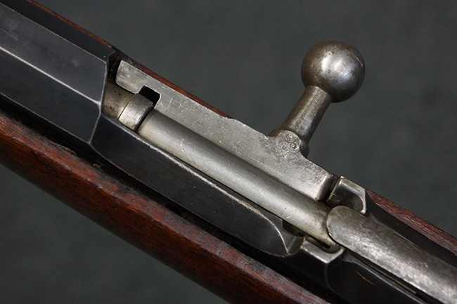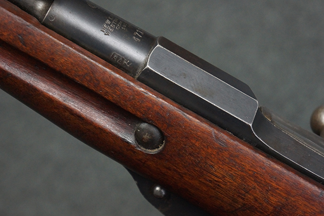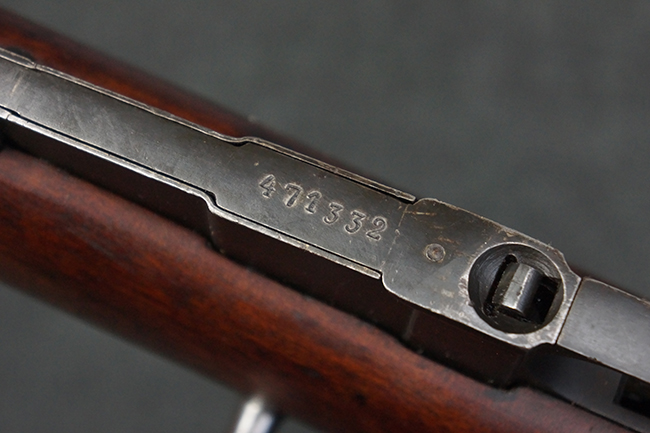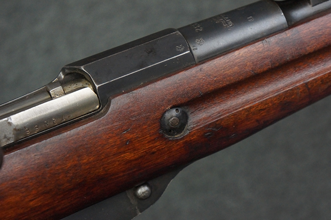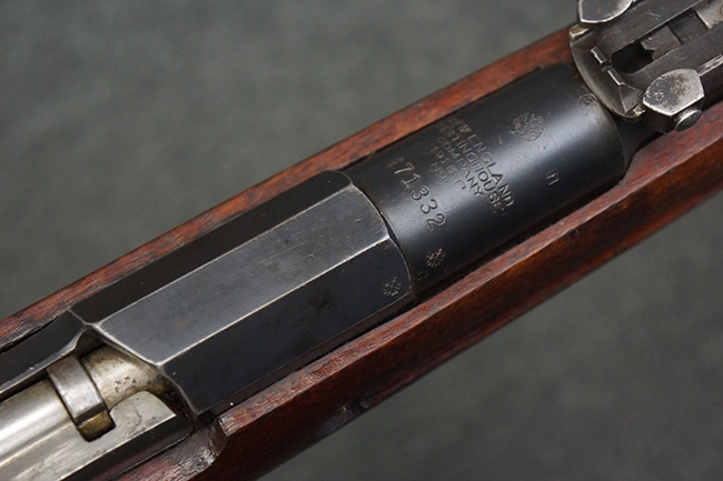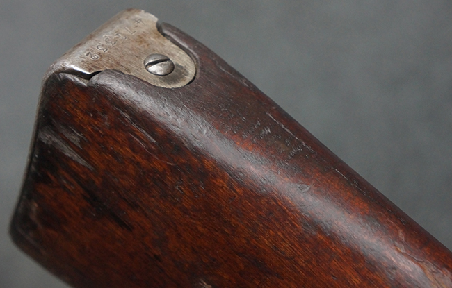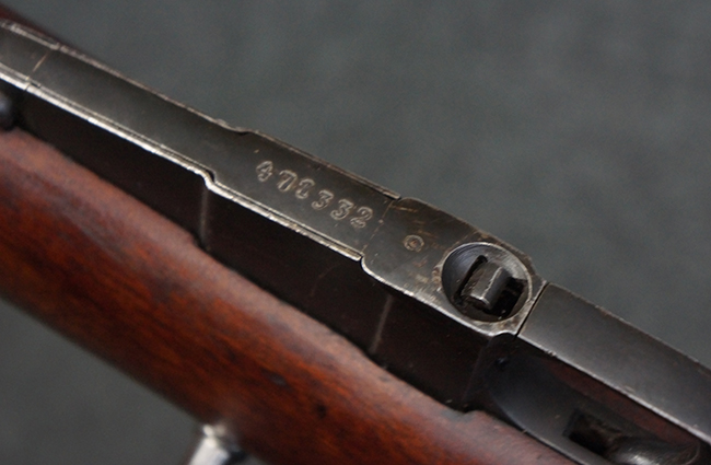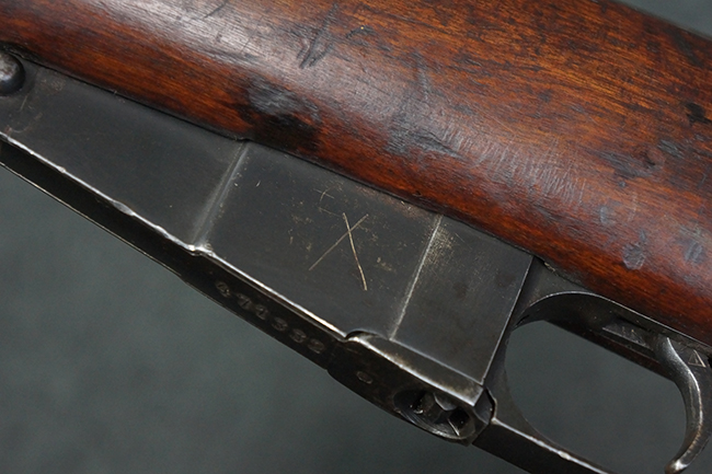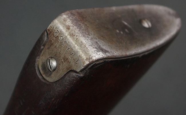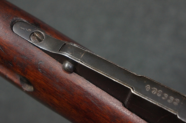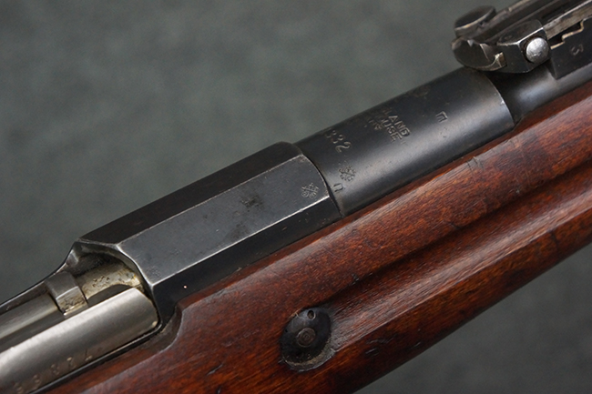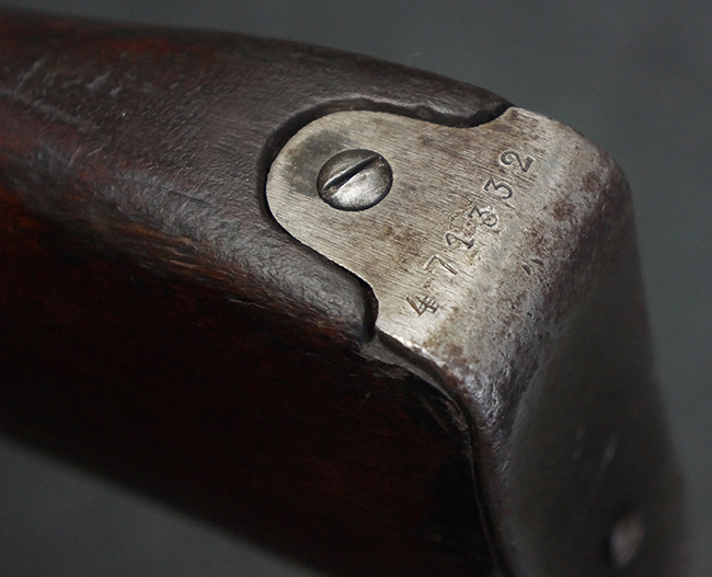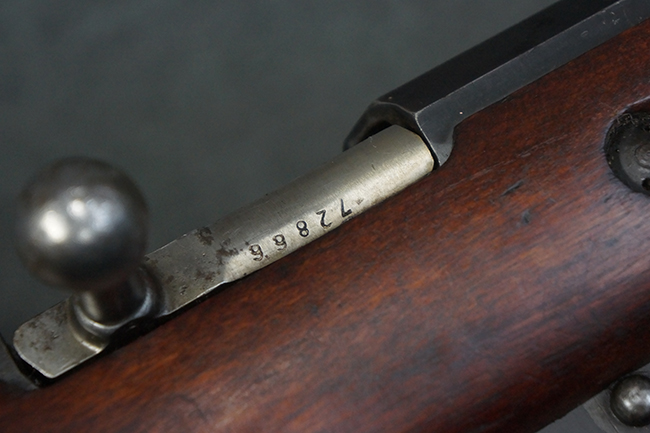 本個体の薬室上面には、シリアルNo.471332の他、「NEW ENGLAND WESTINGHOUSE COMPANY 1915G」の刻印が入っています。 また、帝政ロシアの双頭の鷲国章刻印も見られる事から、帝政ロシア輸出用として製造された事も窺えます。 薬室左側面にはフィンランド軍を示す「SA」の刻印が見られます。 シリアルNo.は弾倉底板及びバット・プレートが471332で薬室のシリアルNo.とマッチしており、ボルトのシリアルNo.は72866となっています。