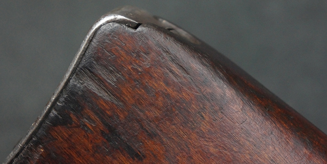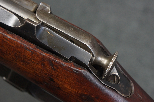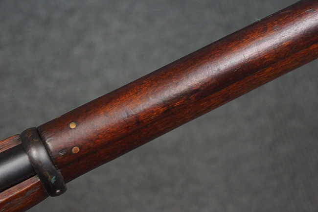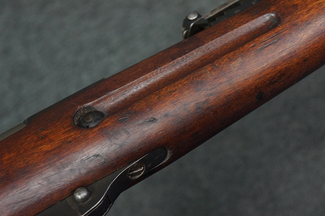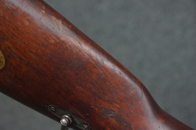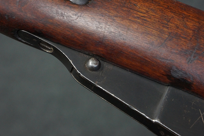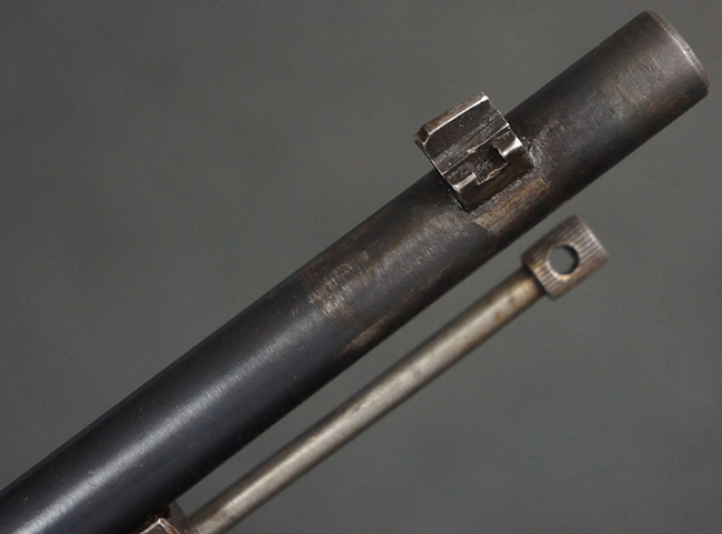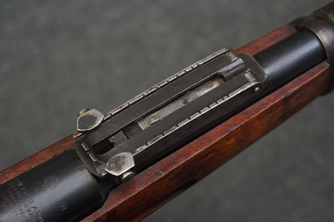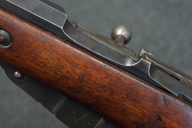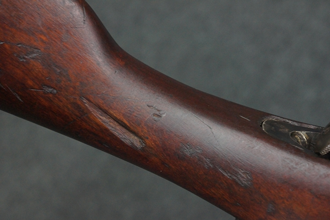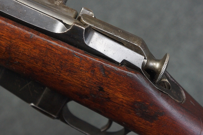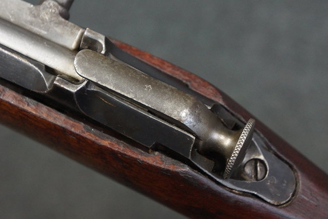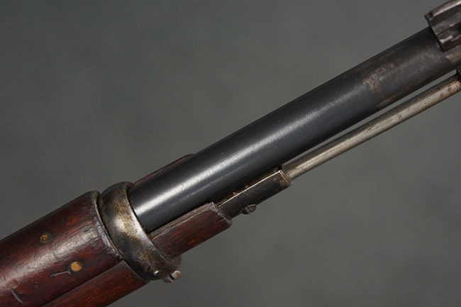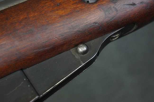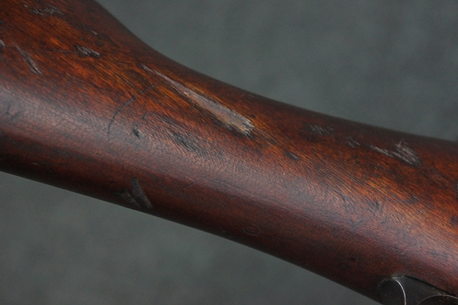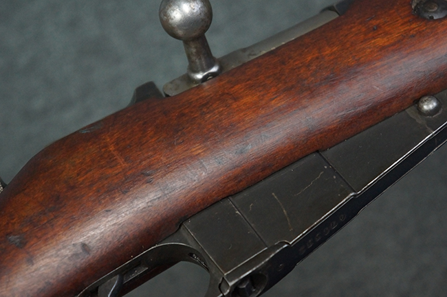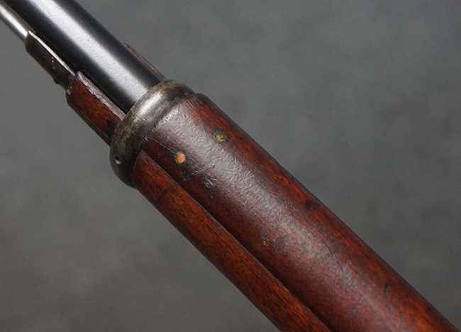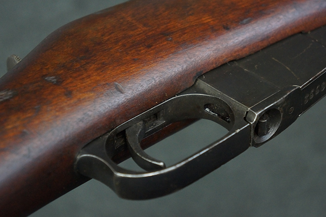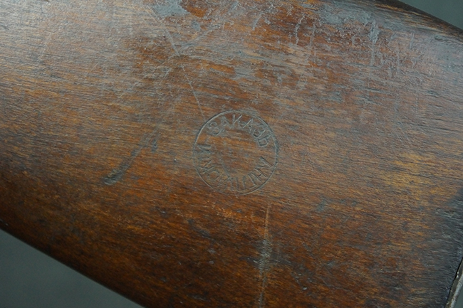本品の機関部や銃身といった金属部は、やや打ち傷や経年による褪色が見られますが、大きな欠損等は見られず、概ねしっかりとした状態が保たれています。 ボルト・ハンドルやコッキング・ピースにはやや表面錆痕が見られますが、こちらも現状目立った破損や欠損等は見受けられません。 木製銃床についても、やや打ち傷や線傷が見受けられ、ハンドガード上部や銃把右側面及び下部にやや深い打ち傷が見られますが、全体としては比較的しっかりとした状態が保たれており、各部の取り付けにも目立ったがたつき等は見られません。 傷み易いバット・プレート部については、やや打ち傷や擦れの他、全体的に仕上げが落ちて一部時代錆や表面錆が見られるものの、現状大きな変形等は見られず、銃床への取り付けについてもがたつきもなくしっかりとしています。 リア・サイトの調整や弾倉底板の開閉については問題なく行う事が可能です。 尚、弾倉内のフォロワー及びスプリングは入っていません。
