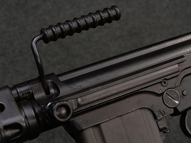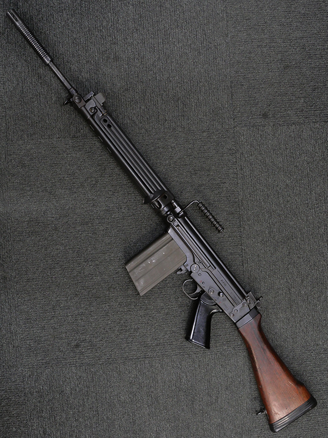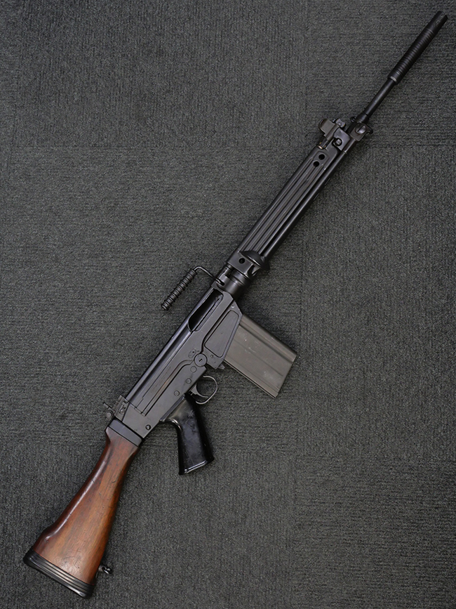 ベルギー FN社のFAL自動小銃を元に、オーストリアで改良・開発された自動小銃で、1958年に行われたトライアルでスペインのセトメ自動小銃及び米国のAR10自動小銃を破ってオーストリア陸軍に制式採用となりました。 FAL自動小銃からの主な変更点として、プレス製のメタル・ハンドガード及び折り畳み式の二脚が装備されているのが特徴です。 このため外観が西ドイツのGew.1自動小銃に酷似していますが、銃口部にチューブ径22mmのグレネード・ランチャーとして機能するサプレッサーが装備されている点が異なります。 このサプレッサーにはSTRIMやMECARといったライフル・グレネードを装着する事が可能でした。 また、このサプレッサーの先端には4本の溝が設けられており、内部にはワイヤーを捉えるためのネジが切られています。 このサプレッサー先端部分でワイヤーを捉えて銃を発射する事により、ワイヤー・カッターとして使用する事も可能となっています。 StG.58自動小銃の内、最初に納入された2万挺はベルギーのFN社で生産された品を輸入した物でしたが、その後オーストリアのステアー・ダイムラー・プフ社でライセンス生産が行われました。 初期生産品の銃床は木製の物が装備されていましたが、後に黒色の樹脂製銃床へと変更されています。 また、オーストリアで生産された品のガス・プラグには、取り外しボタンにL字型の板が取り付けられている物も見られます。 尚、StG.58自動小銃にはGew.1自動小銃と同様に銃剣は用意されていませんでした。 StG.58自動小銃は、1977年に後継のステアーAUG自動小銃が制式採用された後も、1980年代半ば頃まで多くの部隊で使用された他、現在でもオーストリア軍の訓練用小銃として使用されています。 (KK)
