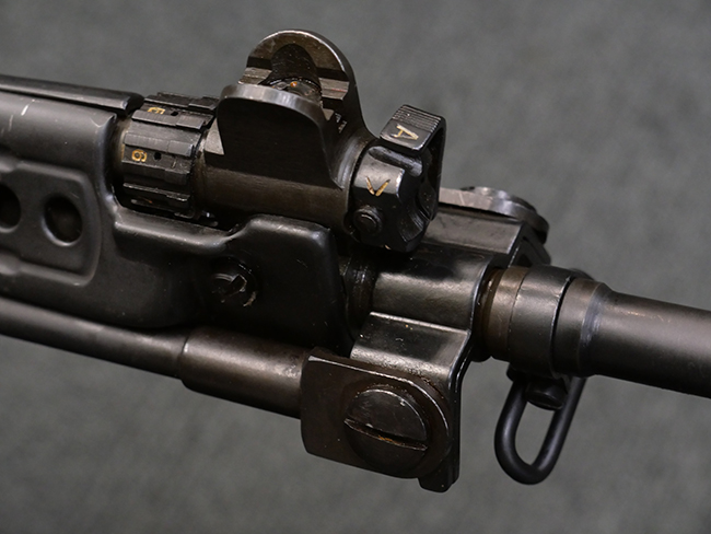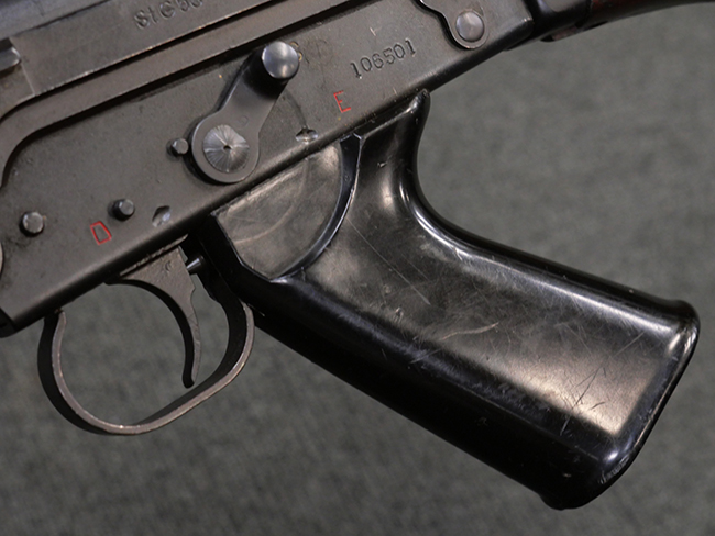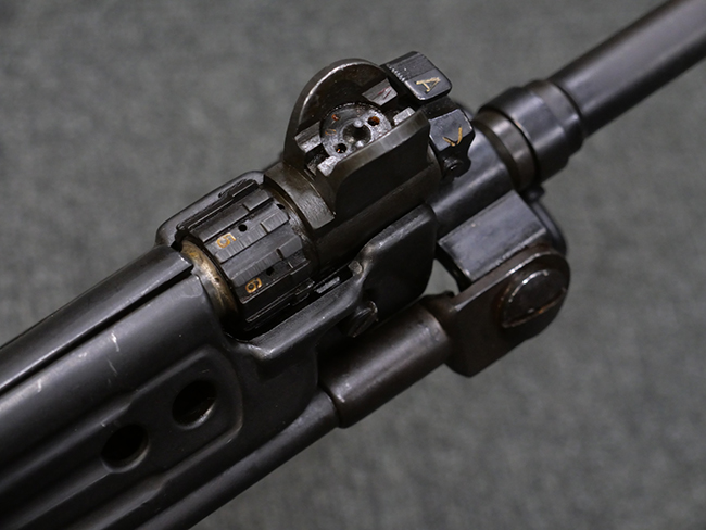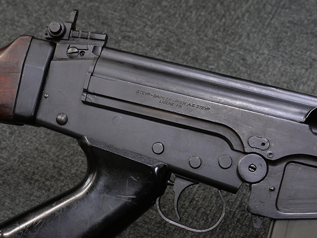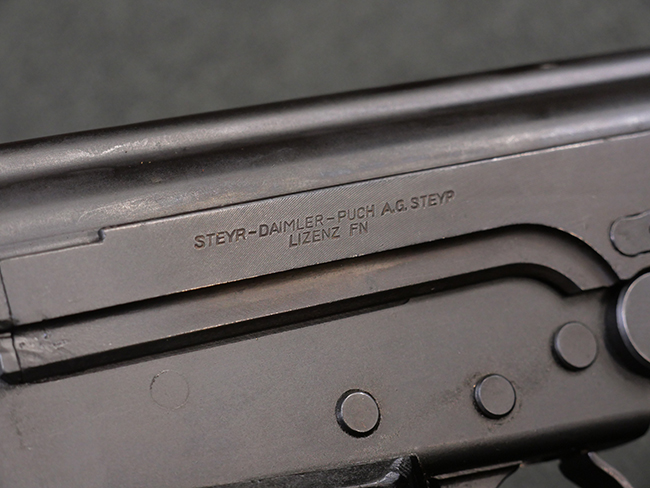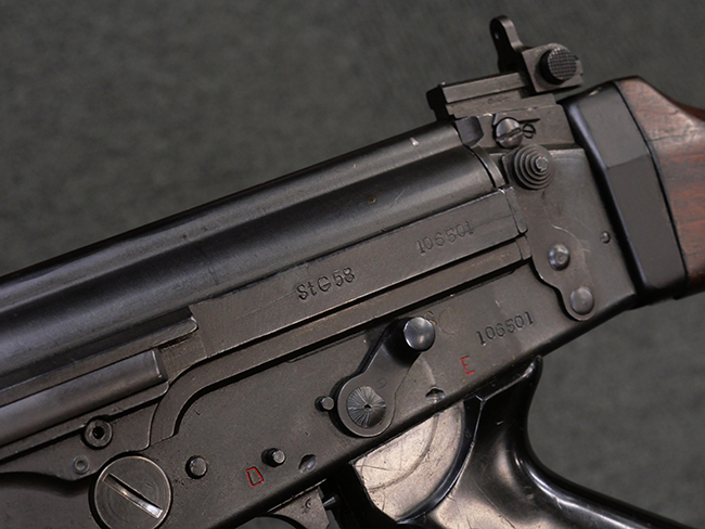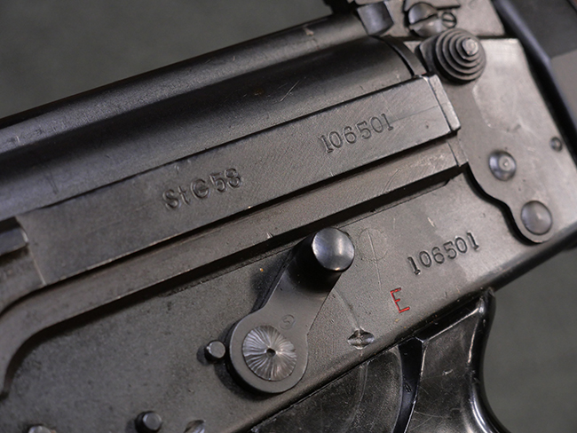 本品はアッパー・レシーバー右側面に「STETR-DAIMLER-PUCH A.G.STEYR LIZENZ FN」のメーカー刻印が打刻されていることから、オーストリアのステアー社製であることが確認出来ます。 レシーバー左側面には「StG 58」のモデル名刻印に加えてシリアルNo.106501が打刻されており、このシリアルNo.はアッパー・レシーバーとロア・レシーバーで一致しております。 セレクターは「S、E、D」の刻印です。