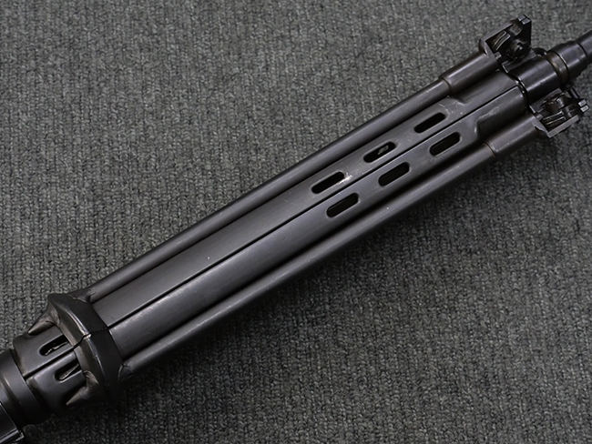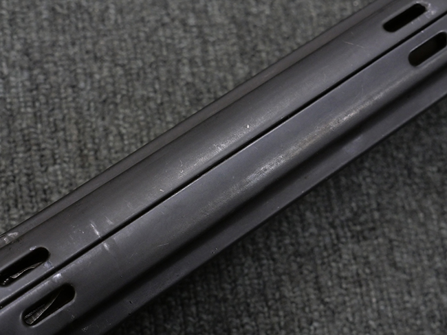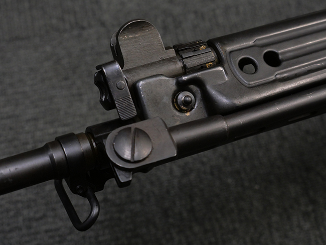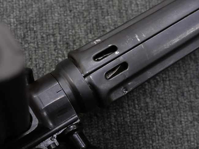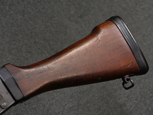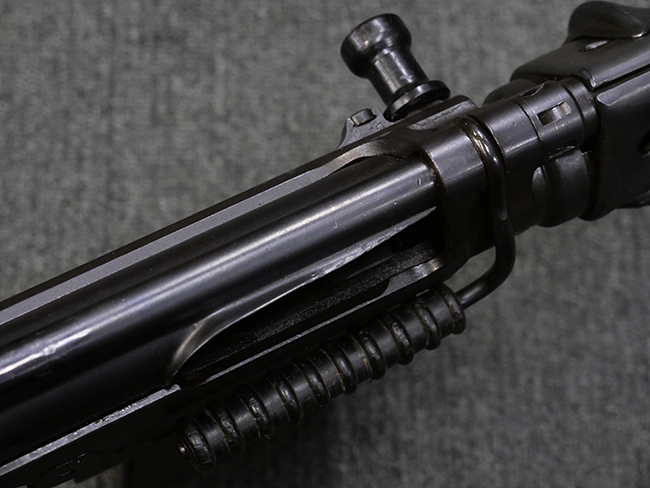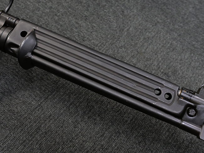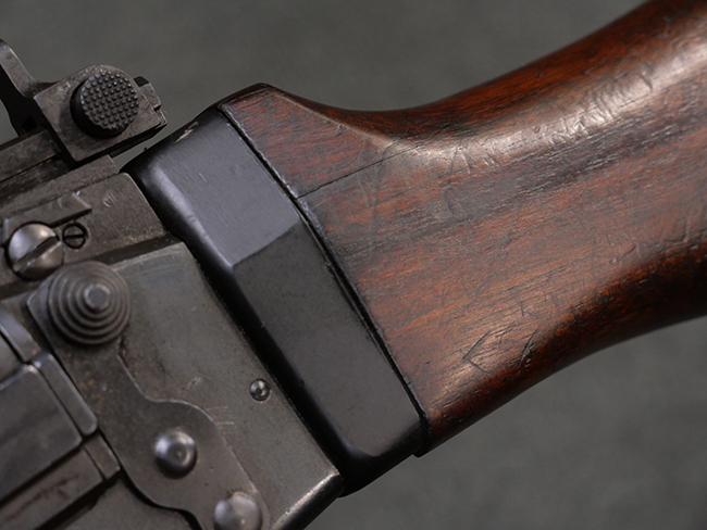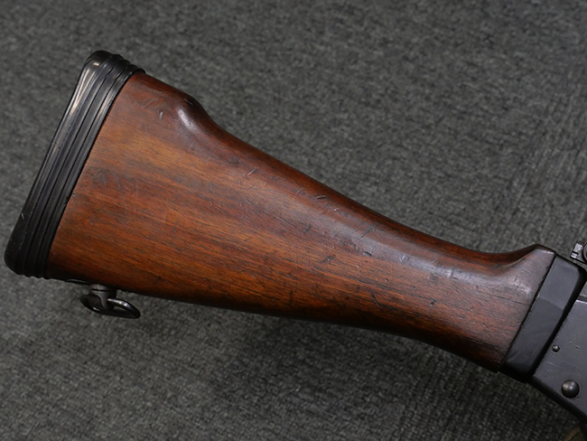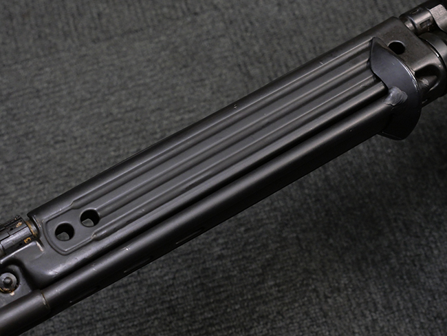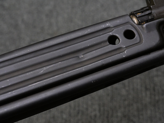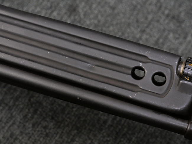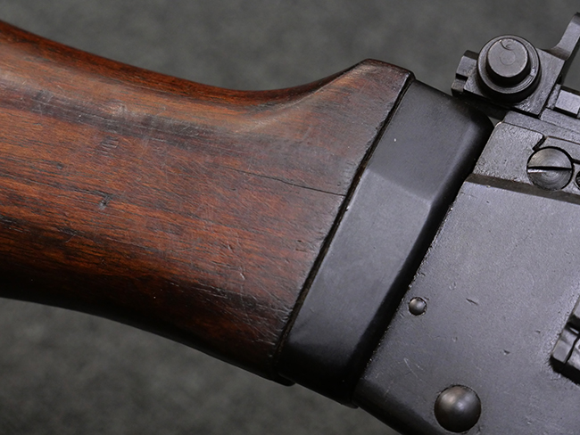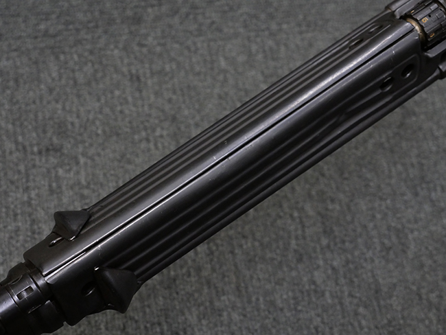 本品の金属部分については適度な使用感があり、角部や可動部などに擦れて地金っぽくなっている箇所が見れるものの、全体的には表面仕上げの残った状態が保たれています。 プレス製ハンド・ガード右面に一か所打ち傷に伴う凹みが見られ、左右のハンド・ガード上面の合わせ目に若干の隙間が空いていますが、ハンド・ガードの取り付けに関してはガタつきは見られません。 ハンド・ガードのその他の箇所に凹みや腐食等は見られず、概ねしっかりとした状態が保たれています。 二脚は僅かな擦れや表面仕上げの剥落が見られるものの、こちらも錆等の腐食もなく全体的に表面仕上げが残った状態が保たれています。 黒色樹脂製のグリップにはやや擦れや線傷が散見されますが、割れやヒビは見られず、概ねしっかりとした状態です。 木製ストックに関しても若干の線傷が見られますが、こちらも欠損は見られません。 ストック両側面のレシーバーとの境目にそれぞれ長さ3cmほどのクラックが見られますが、現状割れが広がっている様子はありません。 硬質ゴム製のバット・プレート部についても僅かな打ち傷や擦れは見受けられるものの、こちらも目立った破損等は見られず、しっかりとした状態が保たれています。 キャリング・ハンドル部は樹脂製の持ち手部分表面にやや摩耗が見られますが、欠けや割れといったダメージは見られません。