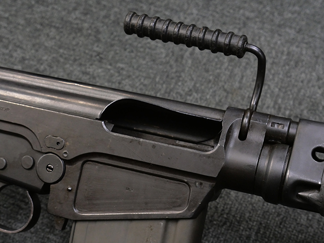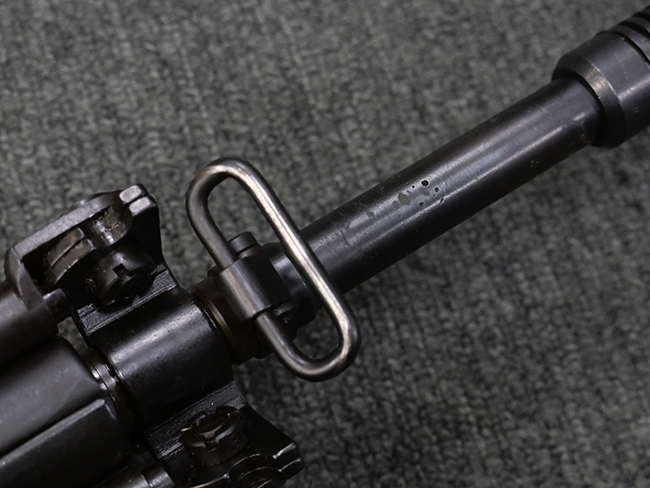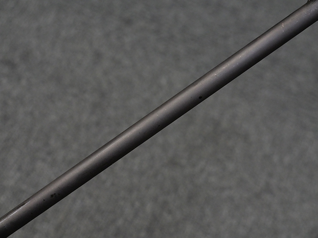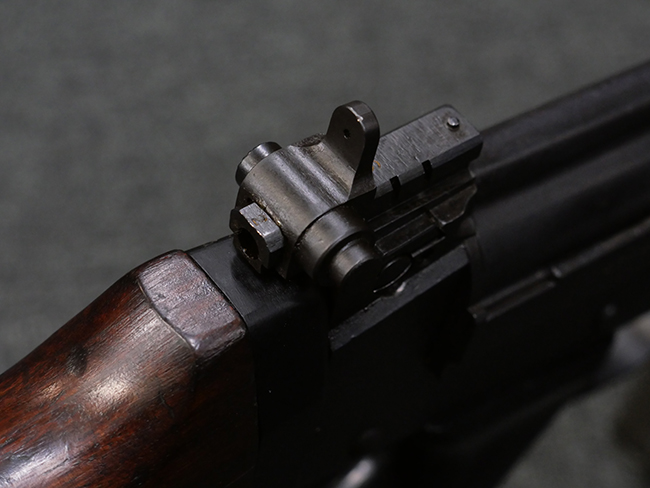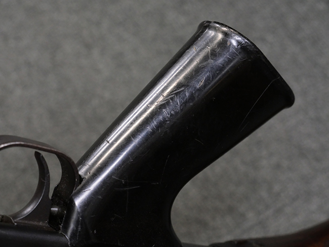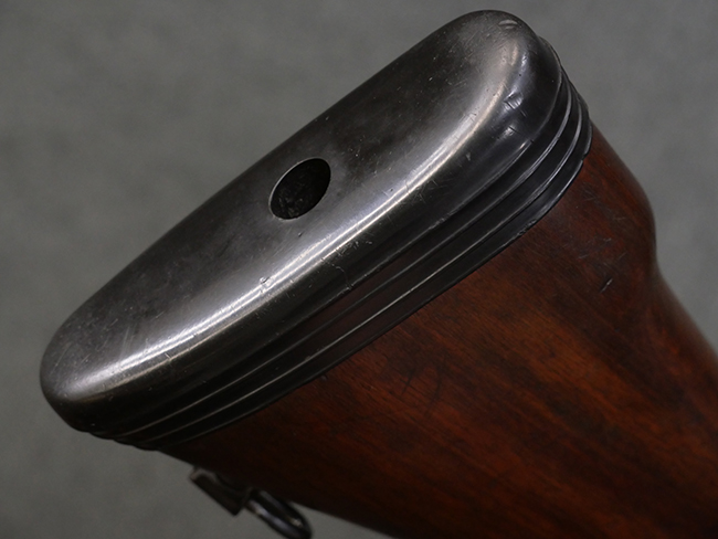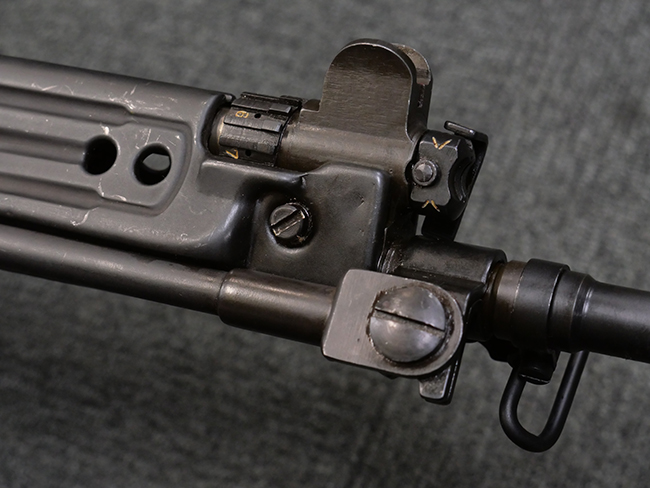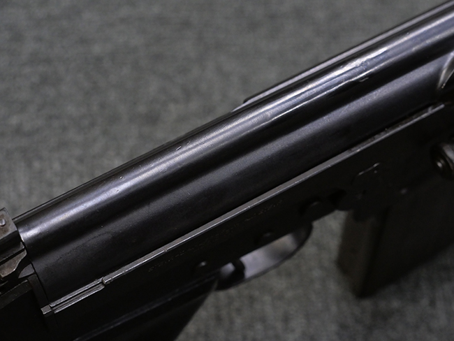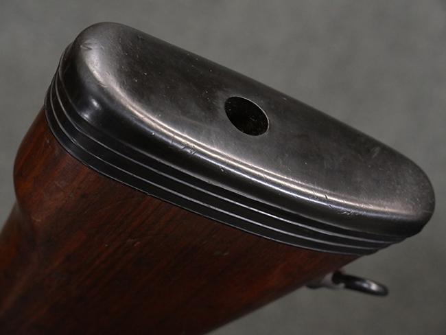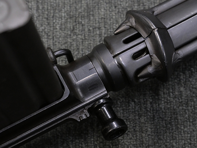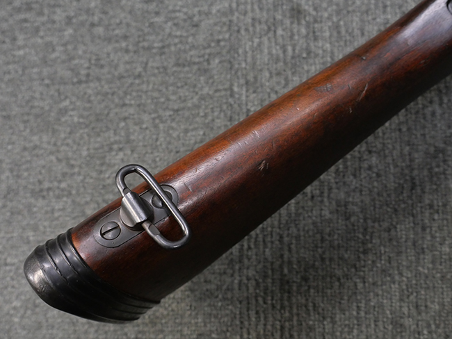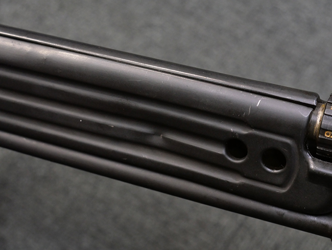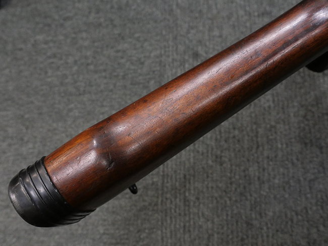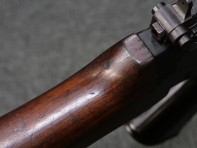 本品の金属部分については適度な使用感があり、角部や可動部などに擦れて地金っぽくなっている箇所が見れるものの、全体的には表面仕上げの残った状態が保たれています。 プレス製ハンド・ガード右面に一か所打ち傷に伴う凹みが見られ、左右のハンド・ガード上面の合わせ目に若干の隙間が空いていますが、ハンド・ガードの取り付けに関してはガタつきは見られません。 ハンド・ガードのその他の箇所に凹みや腐食等は見られず、概ねしっかりとした状態が保たれています。 二脚は僅かな擦れや表面仕上げの剥落が見られるものの、こちらも錆等の腐食もなく全体的に表面仕上げが残った状態が保たれています。 黒色樹脂製のグリップにはやや擦れや線傷が散見されますが、割れやヒビは見られず、概ねしっかりとした状態です。 木製ストックに関しても若干の線傷が見られますが、こちらも欠損は見られません。 ストック両側面のレシーバーとの境目にそれぞれ長さ3cmほどのクラックが見られますが、現状割れが広がっている様子はありません。 硬質ゴム製のバット・プレート部についても僅かな打ち傷や擦れは見受けられるものの、こちらも目立った破損等は見られず、しっかりとした状態が保たれています。 キャリング・ハンドル部は樹脂製の持ち手部分表面にやや摩耗が見られますが、欠けや割れといったダメージは見られません。