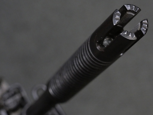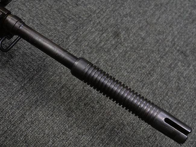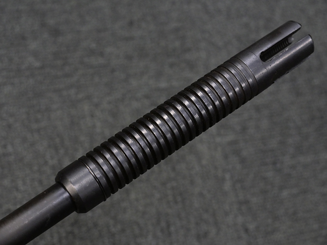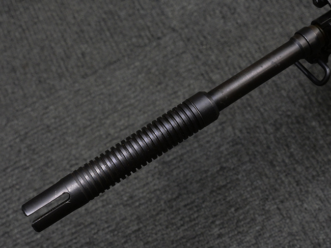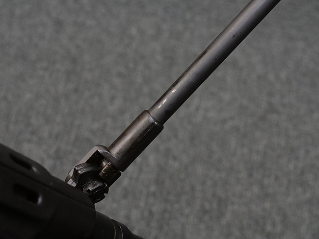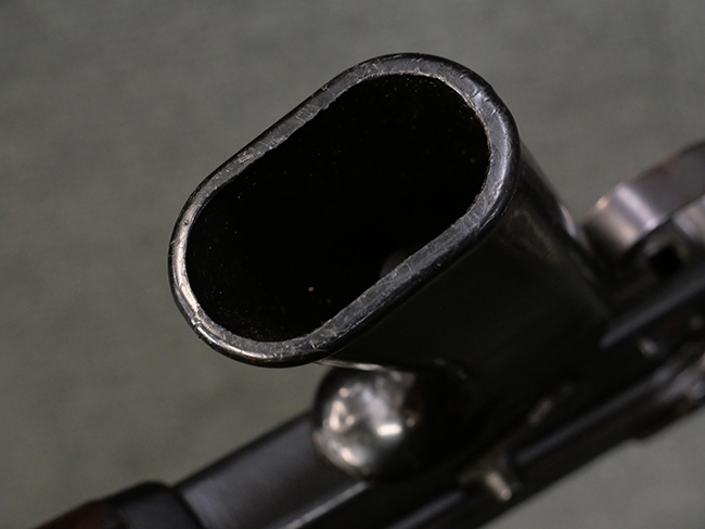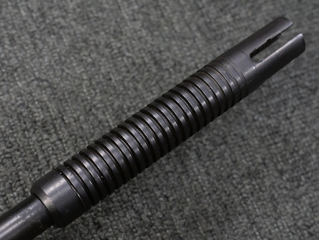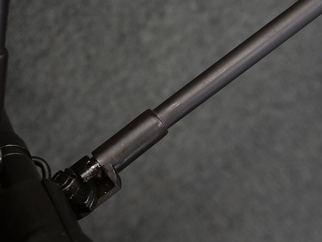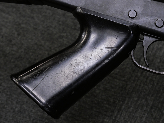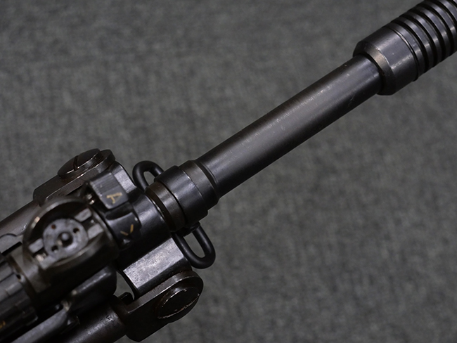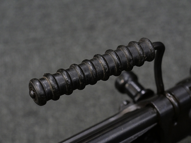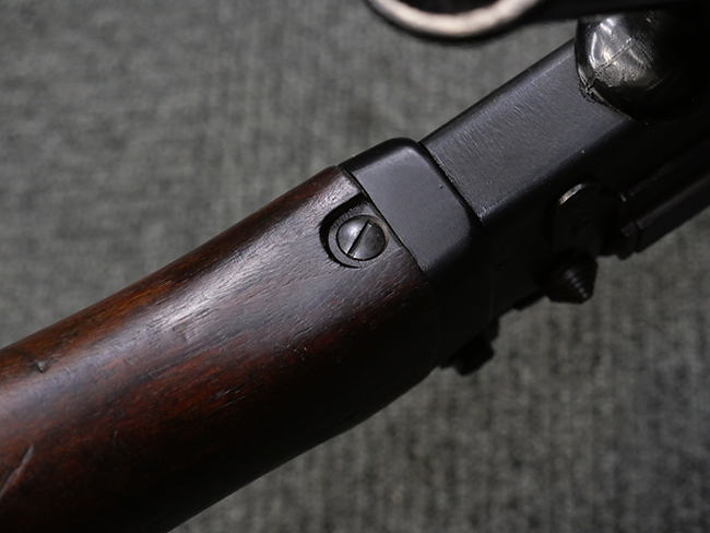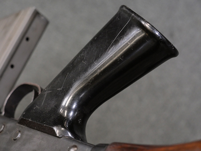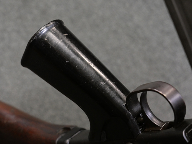本品の金属部分については適度な使用感があり、角部や可動部などに擦れて地金っぽくなっている箇所が見れるものの、全体的には表面仕上げの残った状態が保たれています。 プレス製ハンド・ガード右面に一か所打ち傷に伴う凹みが見られ、左右のハンド・ガード上面の合わせ目に若干の隙間が空いていますが、ハンド・ガードの取り付けに関してはガタつきは見られません。 ハンド・ガードのその他の箇所に凹みや腐食等は見られず、概ねしっかりとした状態が保たれています。 二脚は僅かな擦れや表面仕上げの剥落が見られるものの、こちらも錆等の腐食もなく全体的に表面仕上げが残った状態が保たれています。 黒色樹脂製のグリップにはやや擦れや線傷が散見されますが、割れやヒビは見られず、概ねしっかりとした状態です。 木製ストックに関しても若干の線傷が見られますが、こちらも欠損は見られません。 ストック両側面のレシーバーとの境目にそれぞれ長さ3cmほどのクラックが見られますが、現状割れが広がっている様子はありません。 硬質ゴム製のバット・プレート部についても僅かな打ち傷や擦れは見受けられるものの、こちらも目立った破損等は見られず、しっかりとした状態が保たれています。 キャリング・ハンドル部は樹脂製の持ち手部分表面にやや摩耗が見られますが、欠けや割れといったダメージは見られません。
