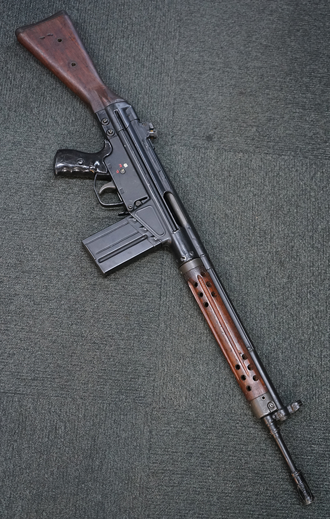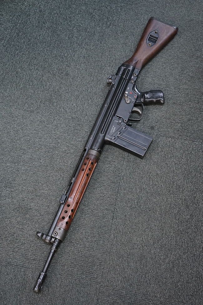Gew.3自動小銃は、スペインで開発されたセトメ自動小銃の発展型で、1959年に西ドイツ連邦軍の制式小銃として採用された自動小銃です。 ローラー・ディレイド・ブローバック・システム等、多くの特徴的な機構を備え、西側を代表するアサルト・ライフルの一つとされています。 最初期生産モデルのGew.3自動小銃は、シート・メタル製のハンド・ガードや起倒式のリア・サイトが装備されていましたが、その後ハンドガードが木製に変更された他、リア・サイトについても1960年にドラム式に変更となりました。 Gew.3自動小銃はその後も更に改良が続けられ、1962年6月採用のGew.3A2では、ハンドガードやストックが樹脂製に変更となりました。