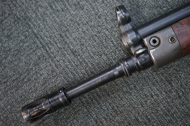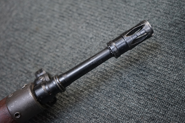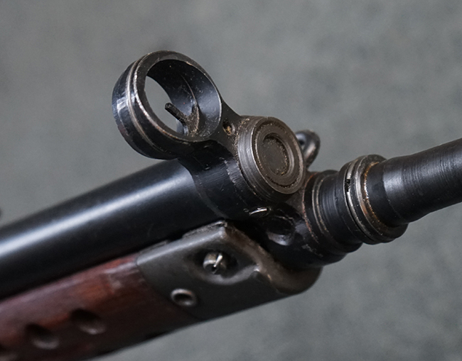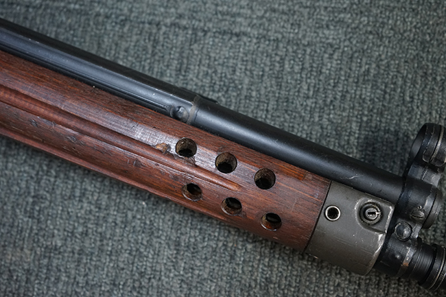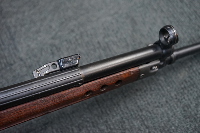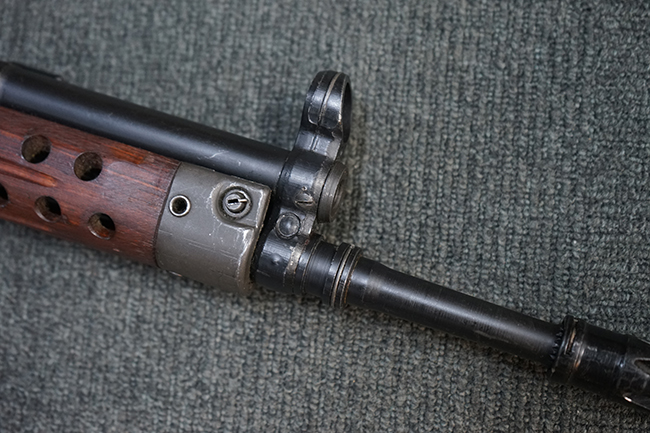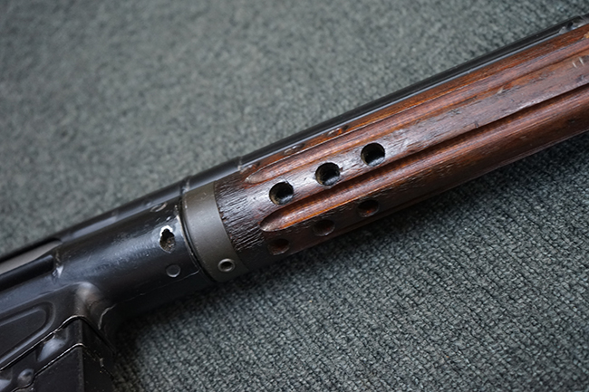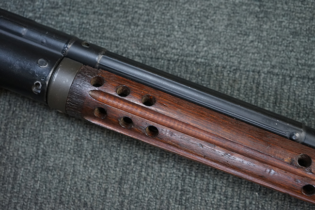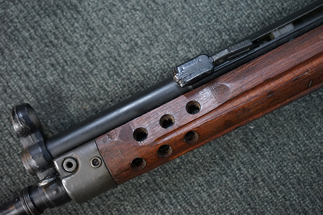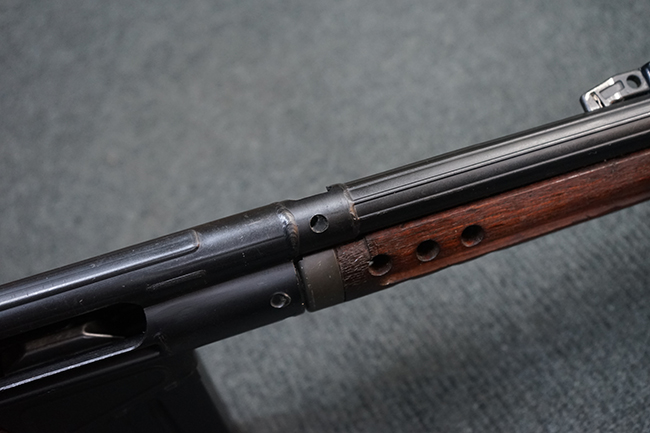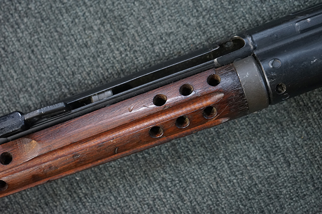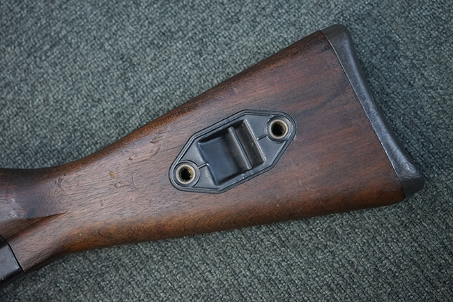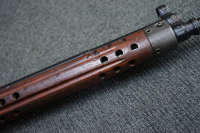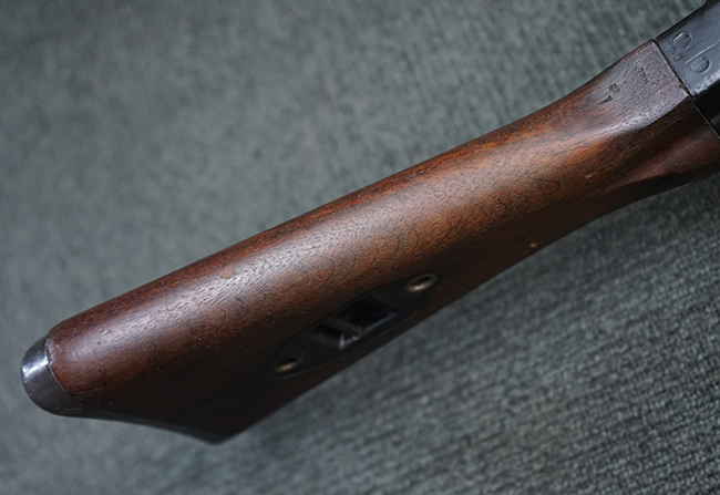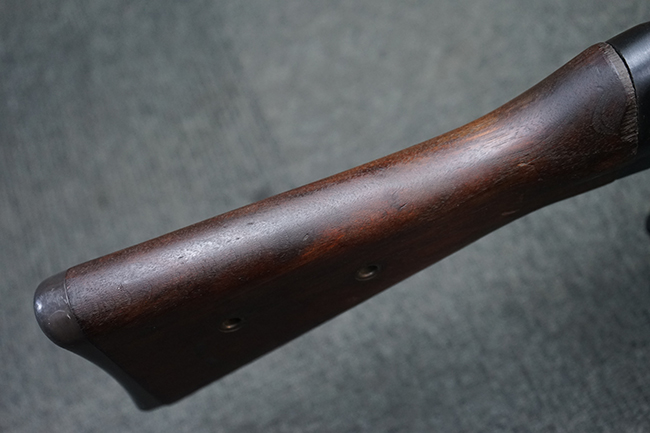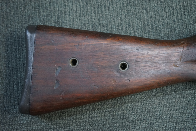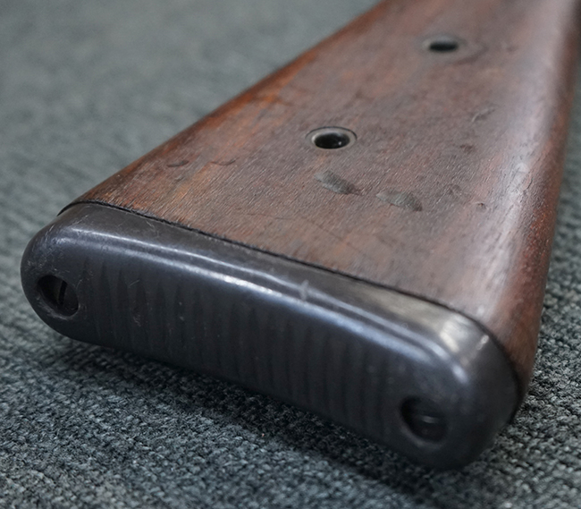本品は全体に適度な使用感が見受けられ、金属部分はやや打ち傷や擦れは見受けられるものの、黒色の表面仕上げも比較的良好に残っています。 木製ハンドガードやバット・ストック、樹脂製グリップについても、やや打ち傷や線傷は見られるものの、大きな破損等は見受けられず、各部の取り付けもがたつきもなくしっかりとしています。 木製ストック下面に一カ所ヘアラインクラックが見られるものの、現状広がっている様子はなく強度的な影響は少ないものと思われます。 傷み易いバット・プレートについても、やや打ち傷や若干の摩耗は見られますが、大きな割れ等は見られず、滑り止めの溝も比較的はっきりと残っています。