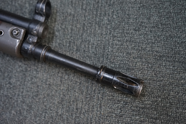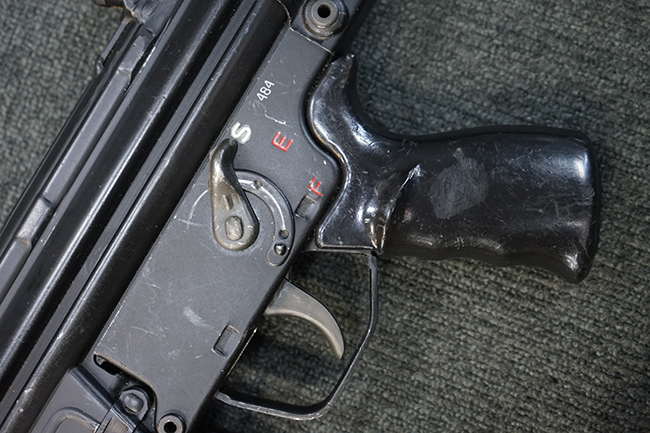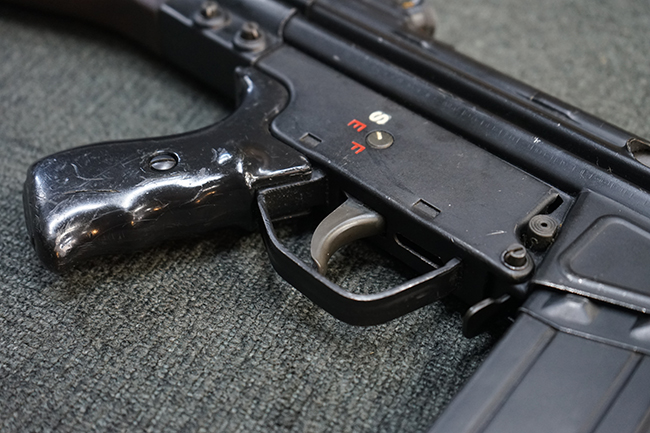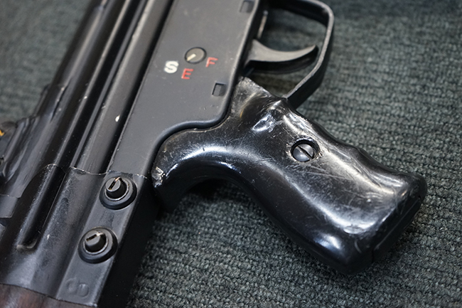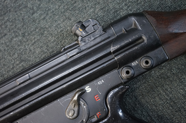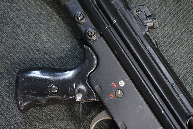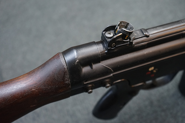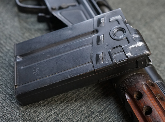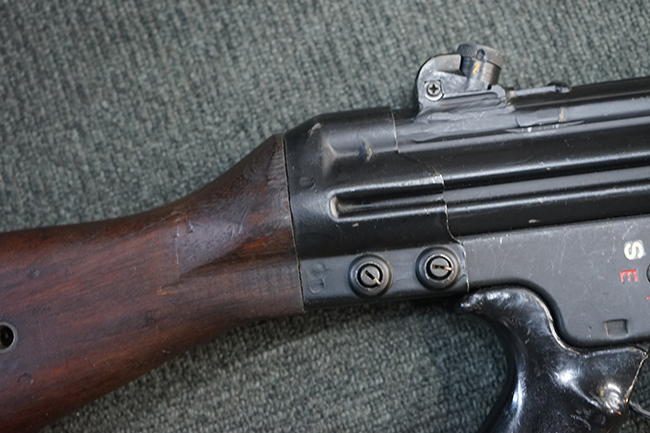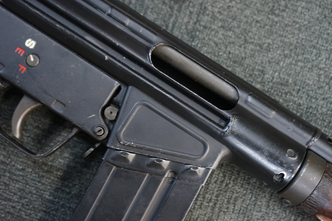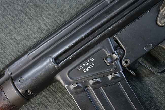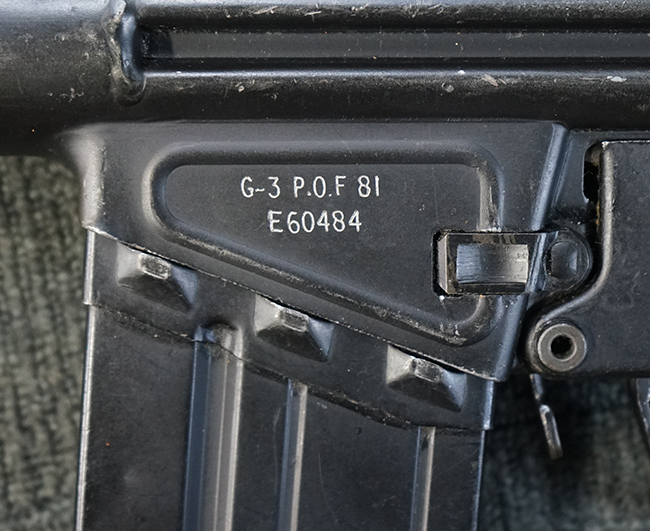 本品はパキスタンPOF製のGew.3A2 自動小銃で、マガジン・ハウジング左側面には「G-3 P.O.F 81」の刻印の他、シリアルNo.刻印が見られます。 アッパー・レシーバー、ロア・レシーバー、ストック基部のシリアルNo.は全てマッチしています。 セレクター表示は「S (安全位置)-E (単射)-F (連射)」のアルファベット表記となっています。 本品のハンドガード及びバット・ストックは木製で、グリップは樹脂製となっています。