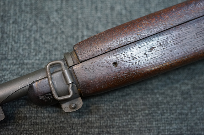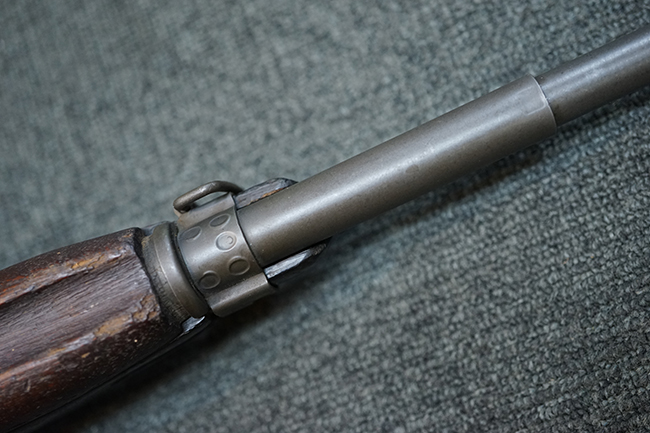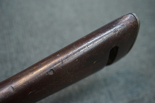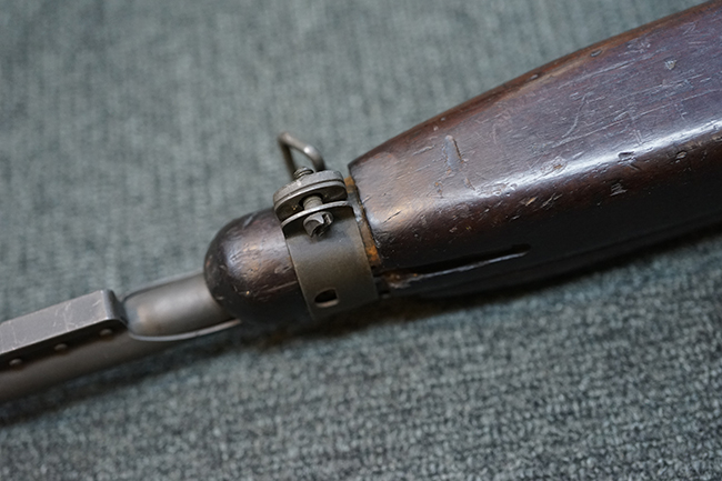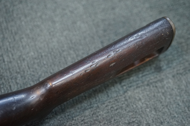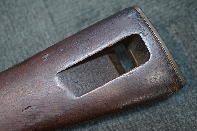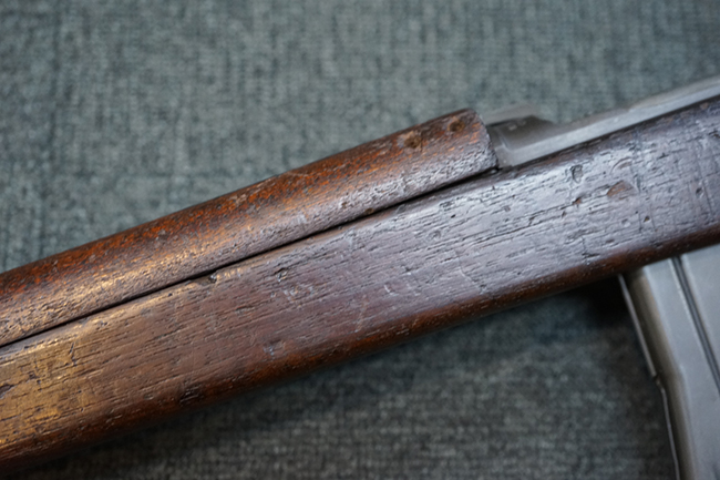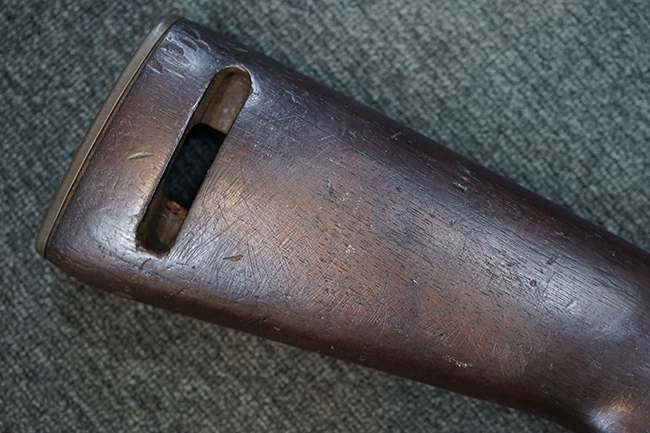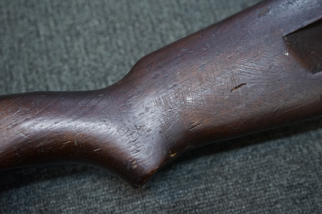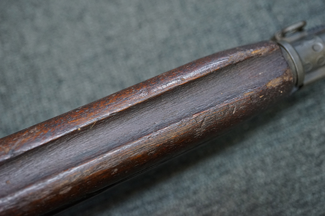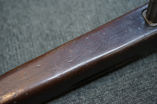 本品は全体に適度な使用感が付いた状態で、機関部や銃身といった金属部は再仕上の正面処理に若干の打ち傷や擦れ、経年による褪色の他、僅かな表面錆痕が見受けられるものの、全体としては目立った欠損等は見られず、概ねしっかりとした状態が保たれています。 銃床やハンドガードといった木部についても、やや打ち傷や線傷が見受けられるものの、こちらも現状大きな破損や欠損等は見受けられません。 アッパー・ハンドガードと銃床の色味は概ねマッチしています。 木部にはやや艶のある仕上げが施されています。 アッパー・ハンドガードの取り付けにほんのわずかに遊びが見られますが、固定自体はしっかりとしています。 傷み易いバット・プレート部については、機関部とコンディションが揃っており、現状大きな変形等は見受けられません。