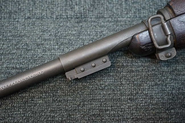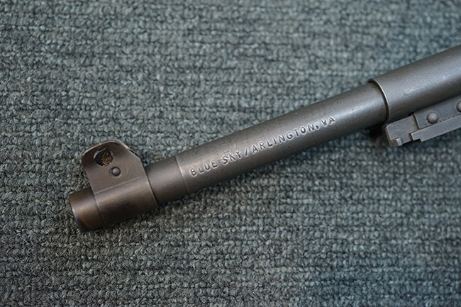 本品の銃身はINLANDで製造された事を示す刻印とBLUE SKY/ARLINGTON.VA」の刻印が見られます。 トリガー・ガードは削り出しタイプで、フロント・バンドは着剣ラグ付きの後期型、リア・サイトについても後期型となっています。 アッパー・ハンド・ガードは穴が4つのタイプ、銃床はオーバル・カットのロー・ウッド・タイプの物が取り付けられています。 セーフティはレバー・タイプです。