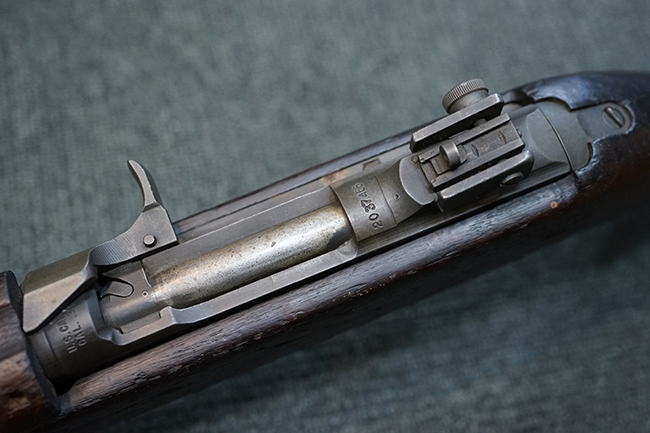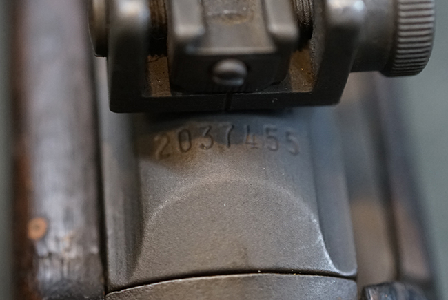 本品の薬室上面には「U.S.CARBINE CAL. .30 M1」のモデル名刻印が入っています。 レシーバー後端上面にはシリアルNo.2037455に加えて「STD.PRO.」のメーカー刻印が入っています。 またレシーバー・上面に、本来のシリアル刻印と同じ2037455が追加で打刻されています。
