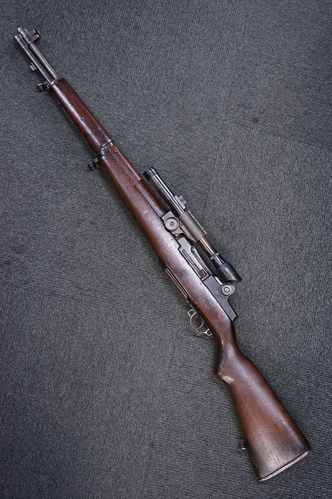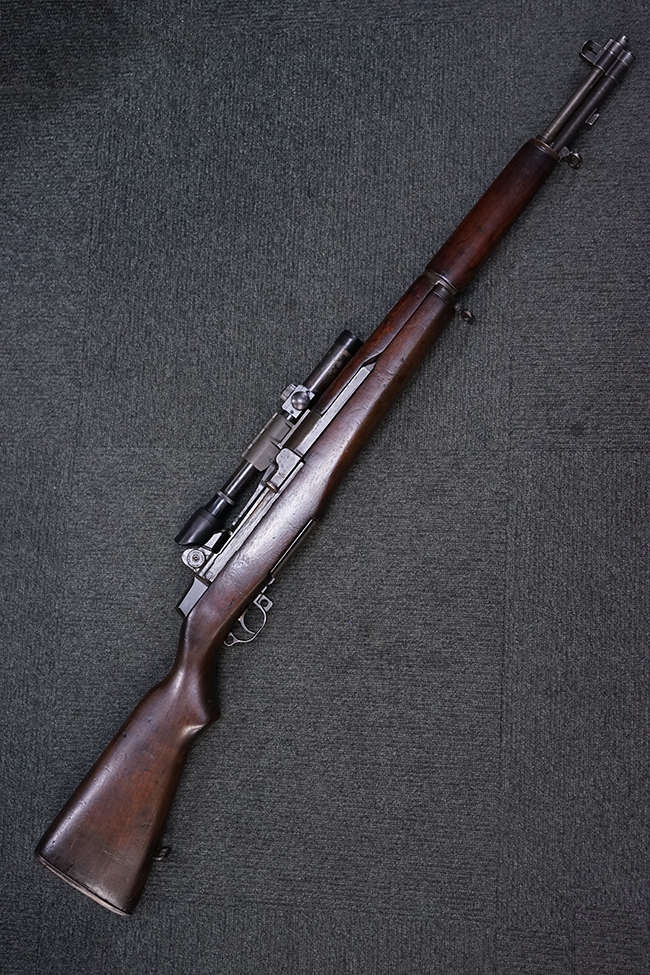 M1ガーランド ライフルにスコープを取り付けたスナイパー・モデルです。 ベースとなったM1ライフルは1936年にアメリカ軍に採用された自動小銃で、開発者ジョン・ガーランドの名前を取ってガーランド ライフルと呼ばれました。 M1ライフルの生産は1937年より始まりましたが、量産体制が整ったのは1940年頃からでした。 しかしながら、1945年の大戦終了までに400万挺以上作られ、その後朝鮮戦争で生産を再開し更に200万挺作られました。 特殊な装弾子 (クリップ) を使用するため弾の補充が難しいなどの欠点を指摘されますが、他国が主にボルトアクション式小銃を使用していた時代には画期的な自動小銃でした。