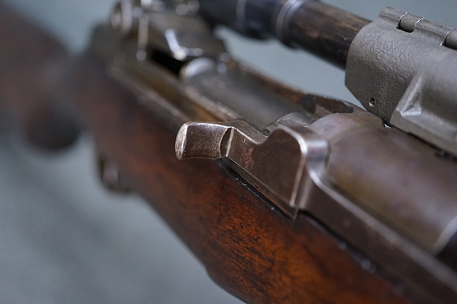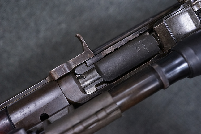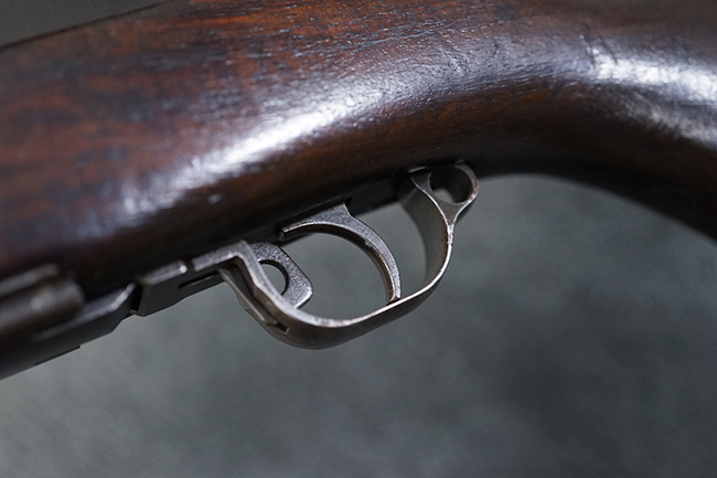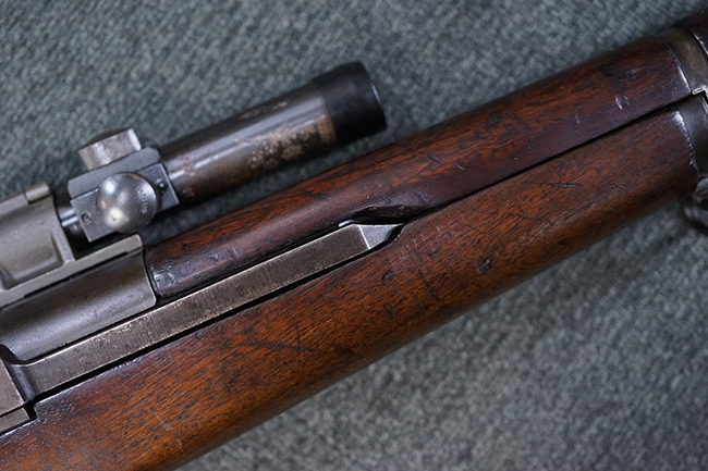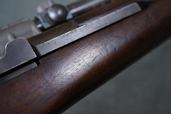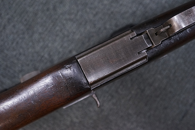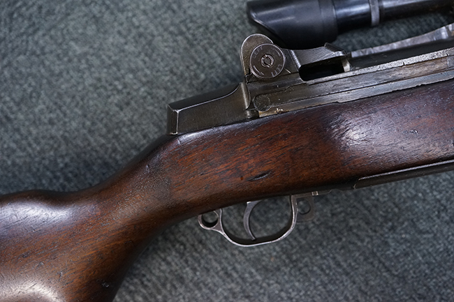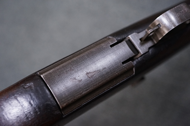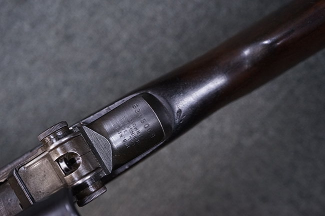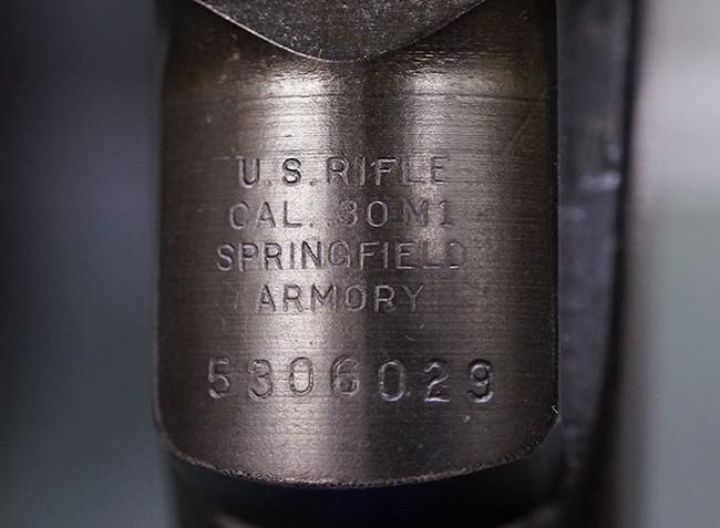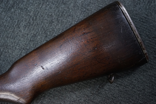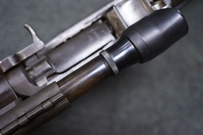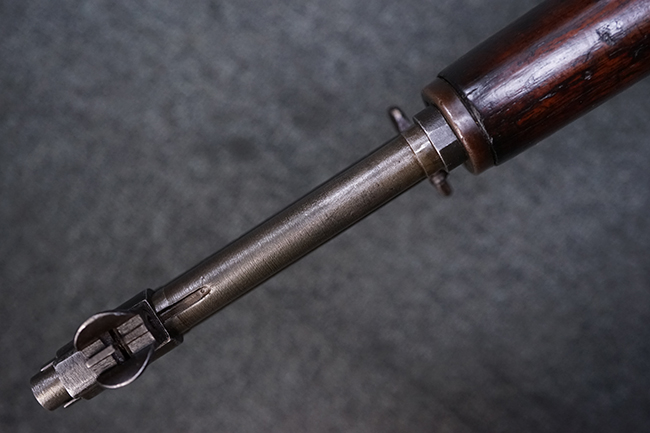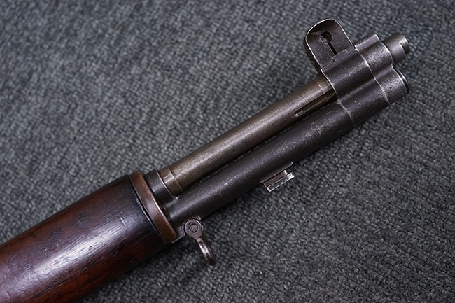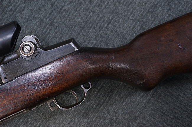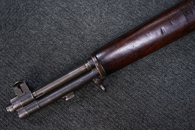 本品はスプリングフィールド造兵廠製で、レシーバー後端上面にはシリアルNo.の他、「U.S. RIFLE CAL. .30 M1」のモデル名刻印及び「SPRINGFIELD ARMORY」のメーカー刻印が入っています。 本品はシリアルNo.から1954年頃に製造された個体である事が窺えます。 トリガー・ハウジングは左側面の穴がクローバー型となった後期タイプのスプリングフィールド造兵廠戦中生産品で「D28290-14-SA」の刻印が入っており、ボルトは「D28287 J1」の刻印が入った大戦中のスプリングフィールド造兵廠製、オペレーティング・ロッドは「D35382 SA」の刻印が入った戦後のスプリングフィールド造兵廠製で、トリガー・ガードは削り出し製となっています。 ガス・シリンダーはワイド・ベース・タイプ、ガス・シリンダー・ロックは上部に膨らみのある戦後型、ガス・シリンダー・ロック・スクリューは溝が十字のポペット・タイプが付いています。 リア・サイトについては、T105と呼ばれる戦後タイプで、エレベーション・ノブは戦後製、ウィンデージ・ノブについても「DRC」の刻印が入ったDruge Brothers Manufacturing社製の戦後型となっています。 銃床の銃把前部には米軍の「P」のプルーフ刻印が確認出来ます。