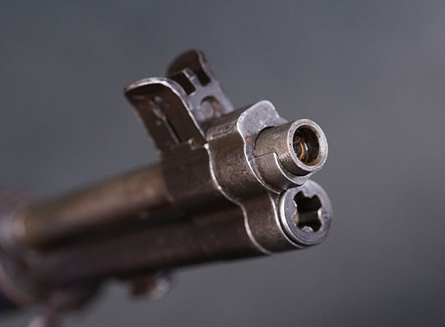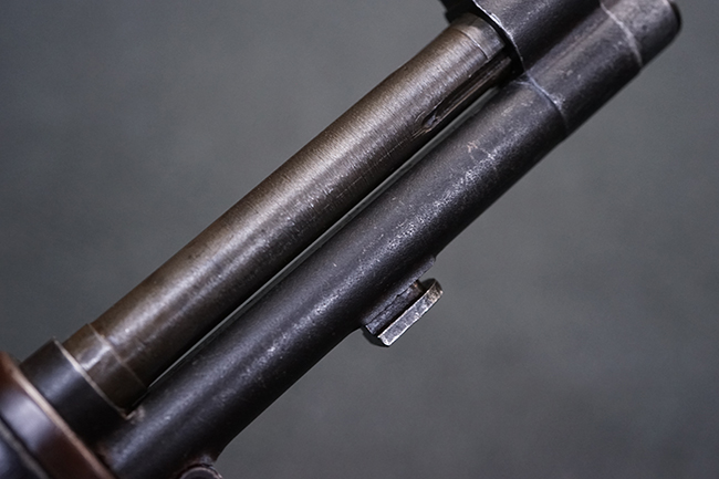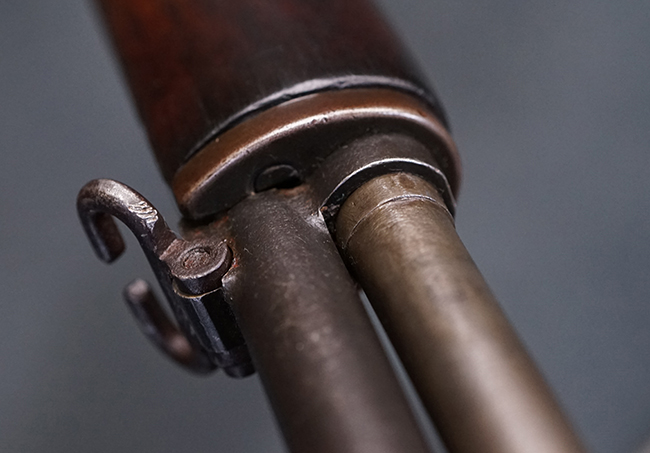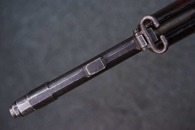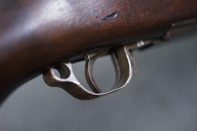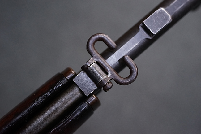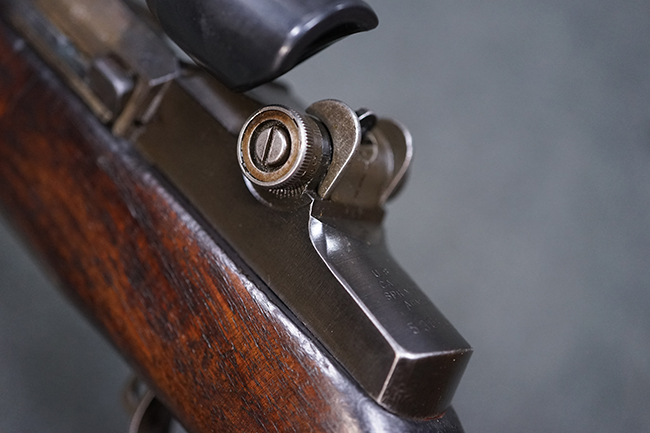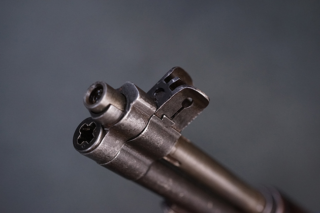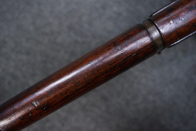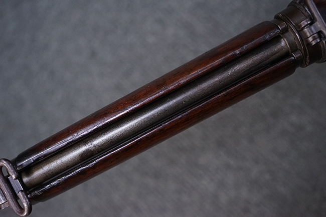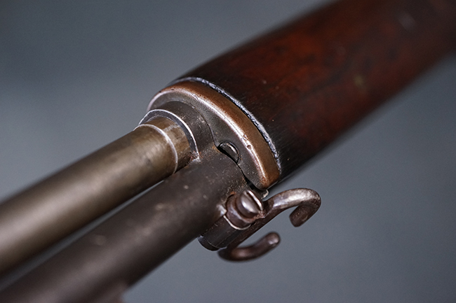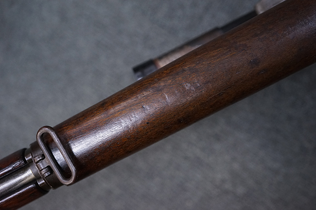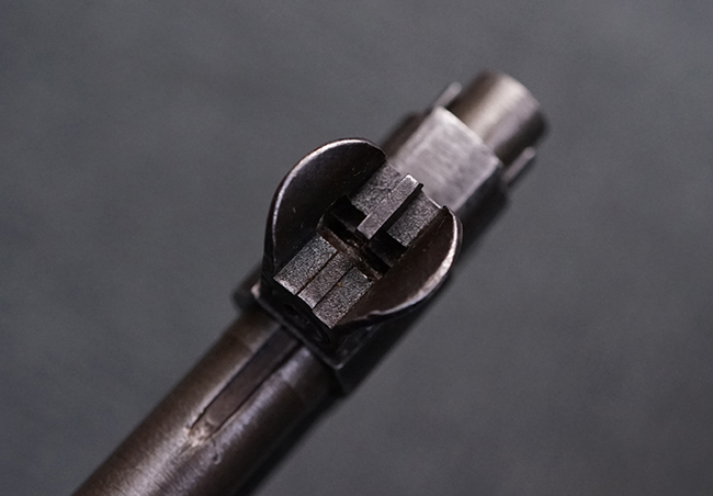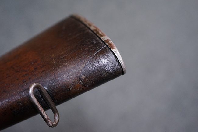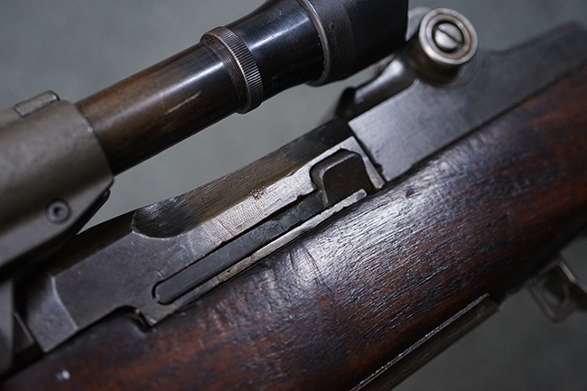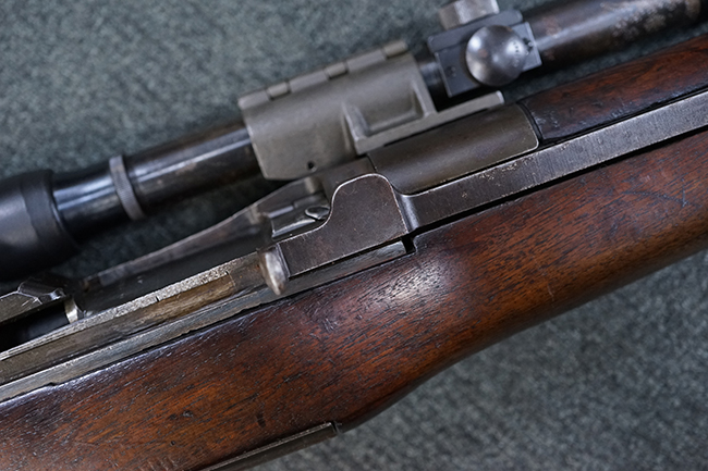 本品はスプリングフィールド造兵廠製で、レシーバー後端上面にはシリアルNo.の他、「U.S. RIFLE CAL. .30 M1」のモデル名刻印及び「SPRINGFIELD ARMORY」のメーカー刻印が入っています。 本品はシリアルNo.から1954年頃に製造された個体である事が窺えます。 トリガー・ハウジングは左側面の穴がクローバー型となった後期タイプのスプリングフィールド造兵廠戦中生産品で「D28290-14-SA」の刻印が入っており、ボルトは「D28287 J1」の刻印が入った大戦中のスプリングフィールド造兵廠製、オペレーティング・ロッドは「D35382 SA」の刻印が入った戦後のスプリングフィールド造兵廠製で、トリガー・ガードは削り出し製となっています。 ガス・シリンダーはワイド・ベース・タイプ、ガス・シリンダー・ロックは上部に膨らみのある戦後型、ガス・シリンダー・ロック・スクリューは溝が十字のポペット・タイプが付いています。 リア・サイトについては、T105と呼ばれる戦後タイプで、エレベーション・ノブは戦後製、ウィンデージ・ノブについても「DRC」の刻印が入ったDruge Brothers Manufacturing社製の戦後型となっています。 銃床の銃把前部には米軍の「P」のプルーフ刻印が確認出来ます。