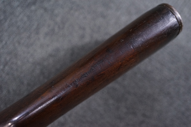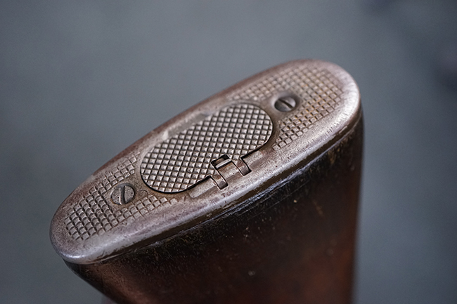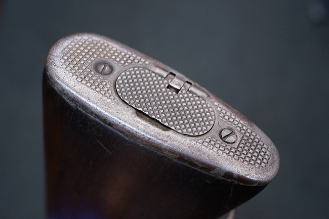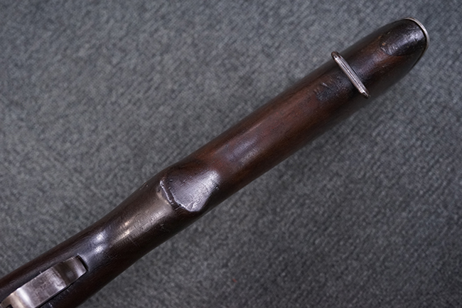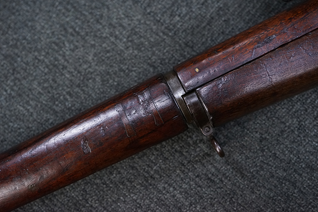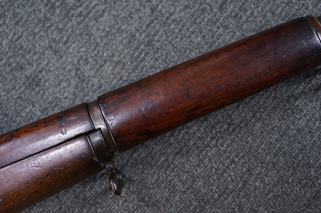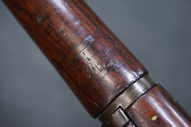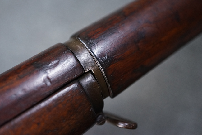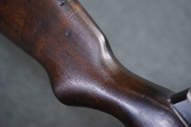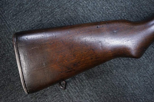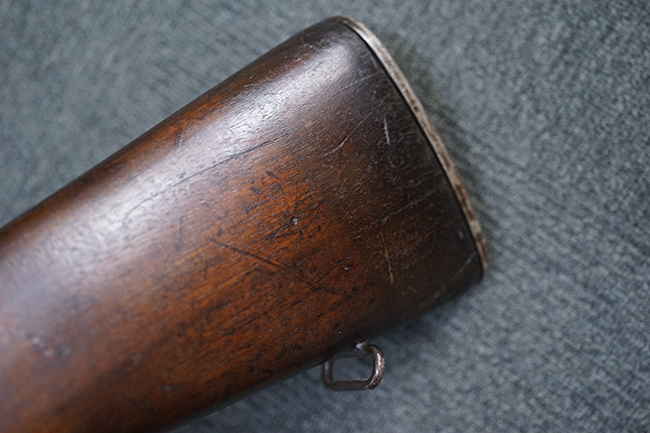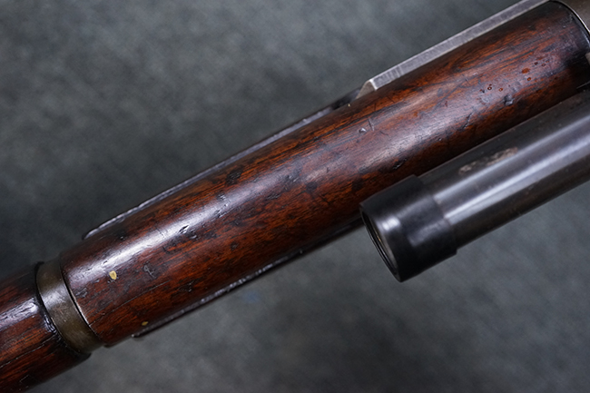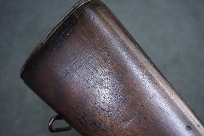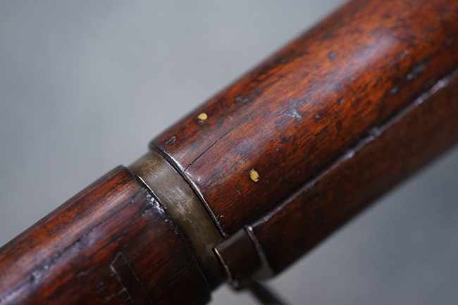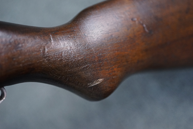 本品の銃身や機関部といった金属部は、やや打ち傷や擦れ、経年による褪色の他、一部表面錆痕が見受けられます。 レシーバーは一度切断された物を再生した品で、レシーバー中間部周辺やクリップ・ラッチにやや表面の荒れや一部仕上げが落ちて金属の地肌が表れている箇所が見られます。 木製銃床やハンドガードについても、やや打ち傷や線傷が見られる他、ハンドガードに一部ヘアライン・クラックや古い補修痕が見受けられますが、強度的には概ねしっかりとした状態が保たれています。 バット・プレート部については、全体に仕上げが薄くなり、やや打ち傷や時代錆は見られるものの、目立った変形等は見られません。 銃床とバット・プレートんぽ間にはやや隙間が見られるものの、バット・プレートの銃床への取り付けについてはがたつきもなくしっかりとしています。 ストック内コンパートメントの蓋の開閉やリア・サイトのウィンデージ及びエレベーション調整については問題なく行う事が可能です。 セーフティの切り替えについても可能ですが、トリガーとの連動はありません。