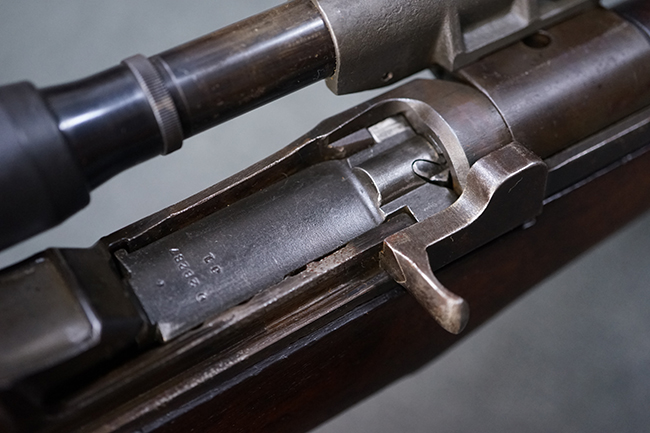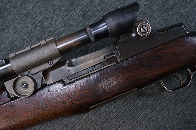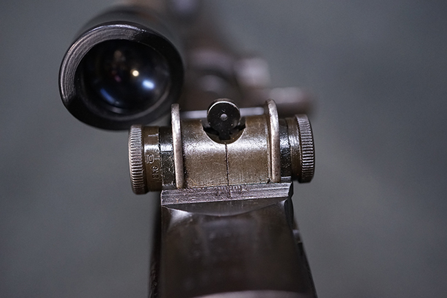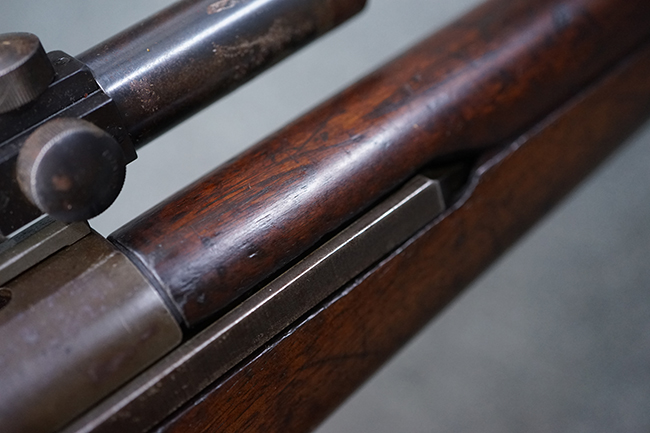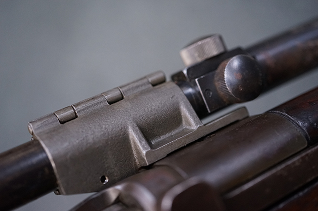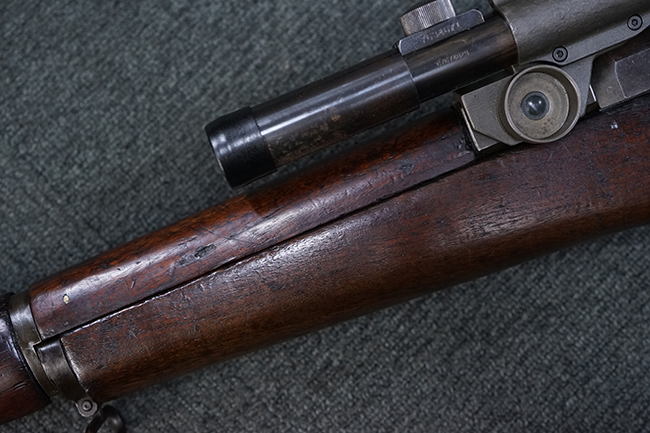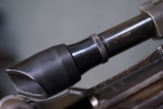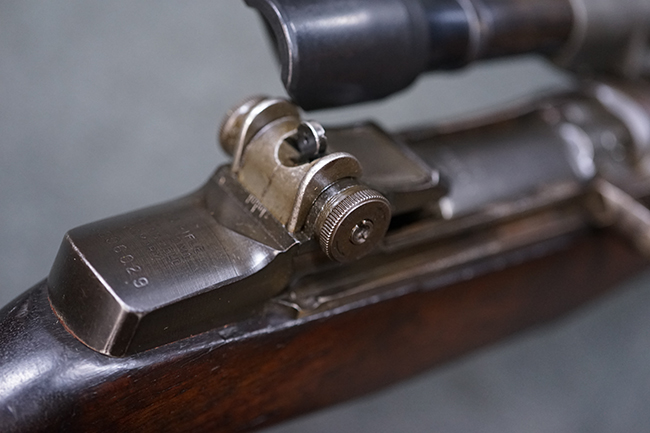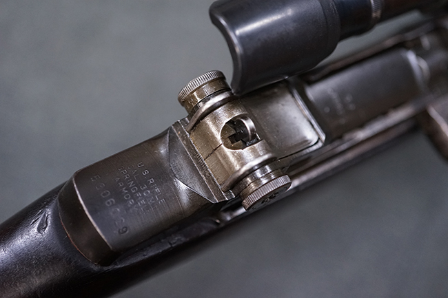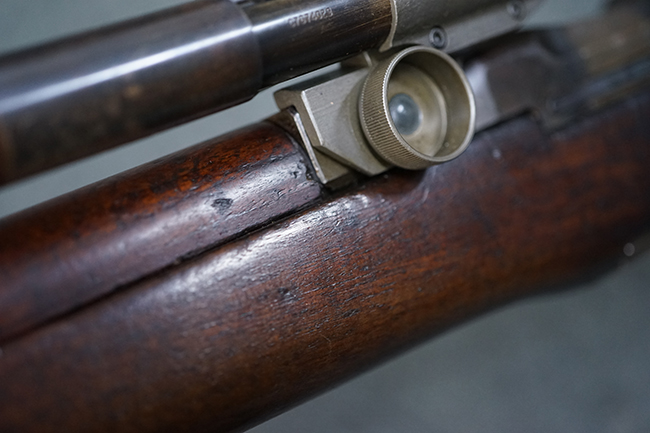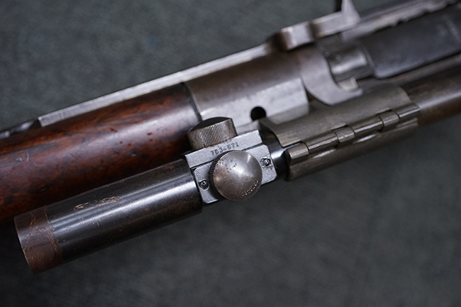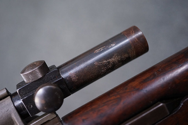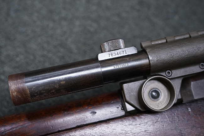付属のスコープはM82 スコープで、チューブ部分に「TELESCOPE M82 SERIAL NO.34681 STOCK NO. 84374」の刻印が入っています。 その他、スコープのチューブにC7674029、エレベーション/ウィンデージ・ノブの基部に7634671、ウィンデージ/エレベーション・ノブ・カバーに7575180の番号が打刻されています。 スコープの外装にはやや小傷や経年による褪色、一部表面錆痕が見られ、視野内にはやや曇りや若干の黴が見られますが、レティクルははっきりと確認出来ます。 各調整ノブのクリック感もしっかりと残っています。 ラバー・アイ・ピースについては、細かなヒビが見られるものの、大きな欠損もなく、概ね良好な状態が保たれています。 銃本体のマウントへのスコープの着脱についても問題なく行う事が可能です。