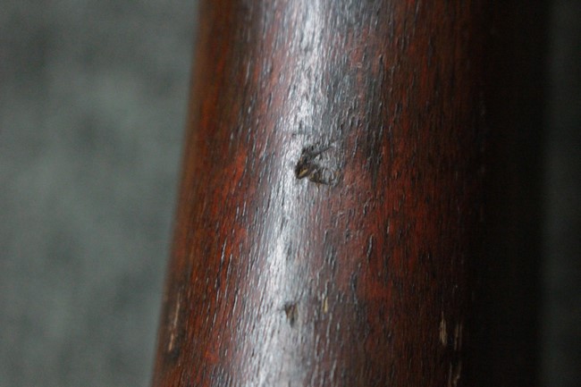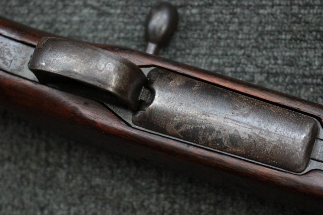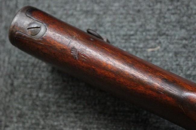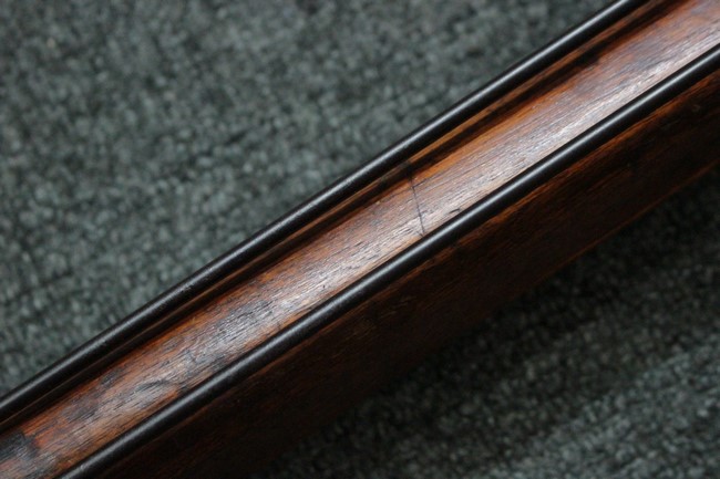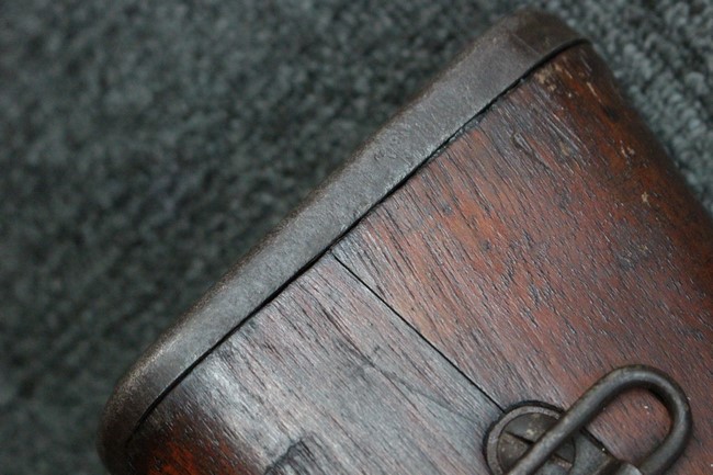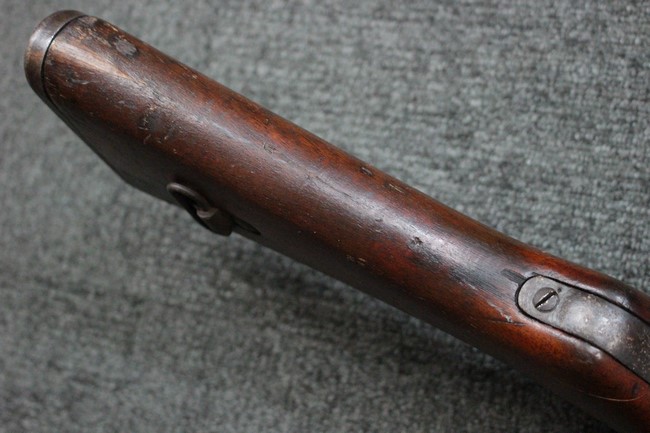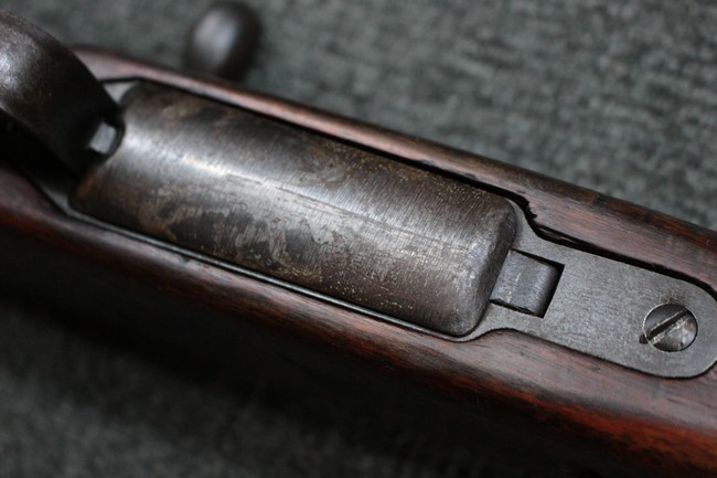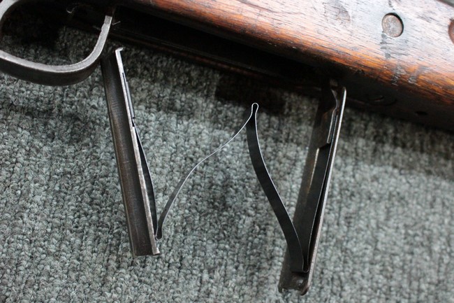 本品の銃身や機関部といった金属部は小傷や擦れ、薬室部分や弾倉底板、用心金などには朽ち込み痕や金属の地肌が出ている箇所は見受けられるものの、大きな欠損等は見受けられず、オリジナルの仕上げも比較的残っています。 木部については、やや打ち傷や線傷が見受けられるものの、全体としては大きな破損等は見られず、概ねしっかりとした状態が保たれています。 銃床と木被の色合いはほぼ揃っています。 旧軍小銃特有の銃床上下の継ぎ目については合わせ目の隙間はほぼ見られず、ガタつきも見られません。 前後の負革止については動きも比較的スムーズです。 傷み易い床尾板についても、擦れや表面錆痕が見られるものの、目立った凹みや大きな変形等は見られません。 床尾板と銃床の間にはわずかに隙間が見られますが、取り付け自体はがたつきもなくしっかりとしています。 単脚の起倒、表尺の起倒や調整、弾倉底板の開閉については問題なく行う事が可能です。 弾倉内の弾受 (フォロワー) 及びバネは入っています。 さく杖が付属致します。