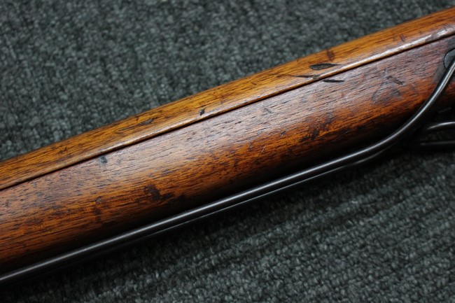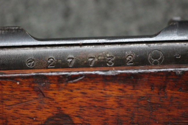 本品は名古屋製の初期型で、照尺にはオリジナルの高射表尺を備え、下帯には一脚が取り付けられています。 機関部左側面にはシリアルNo.27732の他、名古屋造兵廠を示す刻印や「イ」のシリーズ名が打刻されています。 シリーズ名から、本品が昭和17年4月~10月頃に製造された事が窺えます。 上帯には鮮明に末尾3桁の「732」の刻印が見られます。 安全子は細かなチェッカリングが入っている初期/中期型に見られる仕様となっています。 菊花紋章の刻印は削り取られていますが「九九式」の刻印ははっきりと残っています。 銃床についても名古屋工廠製で、銃床下部には名古屋工廠製を示す「名」及び「リ」の刻印が入っています。