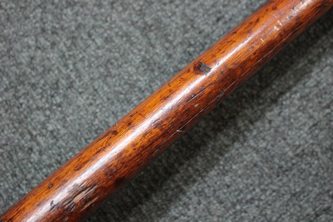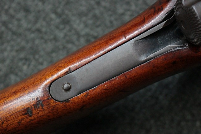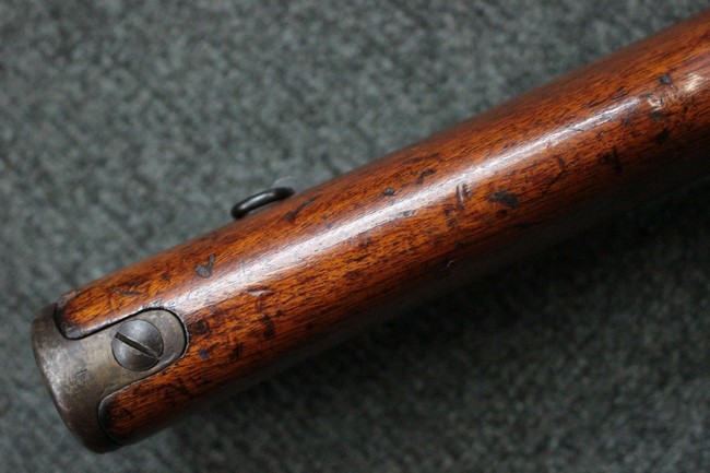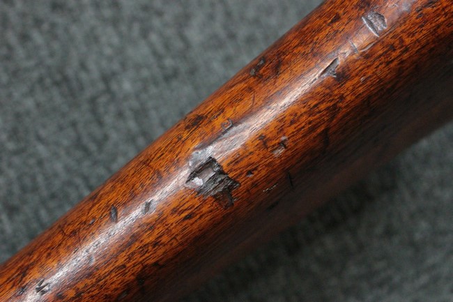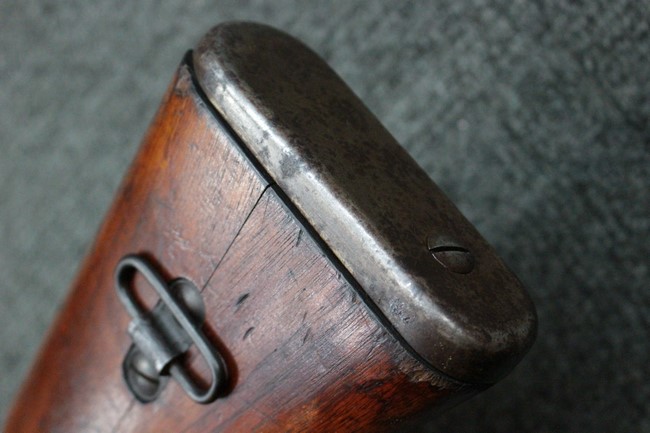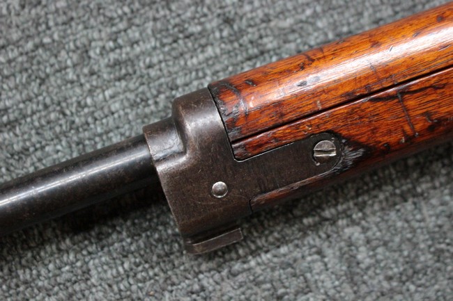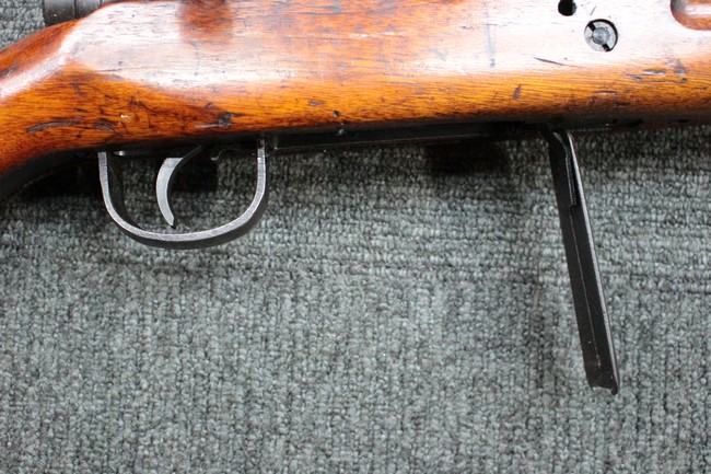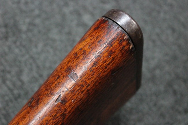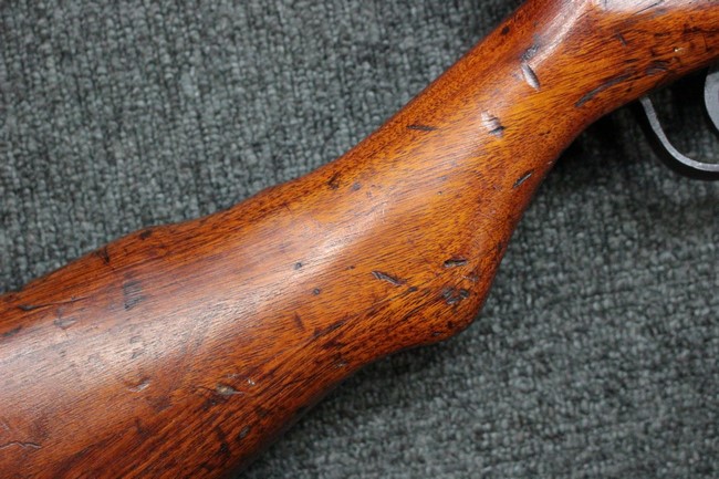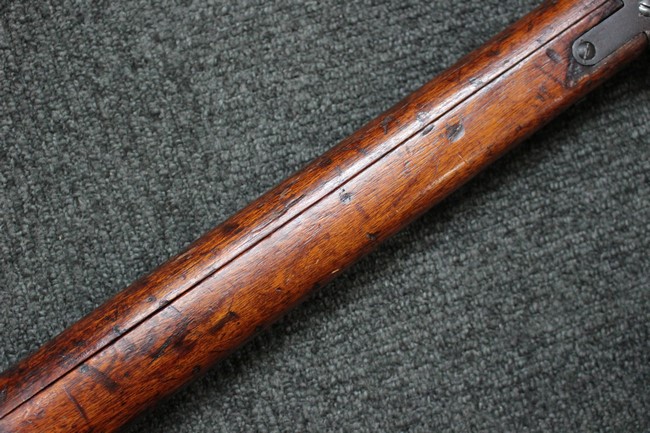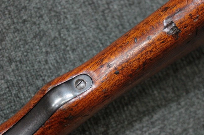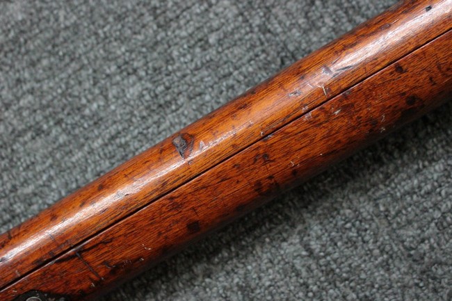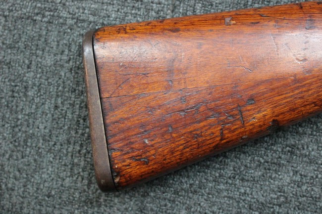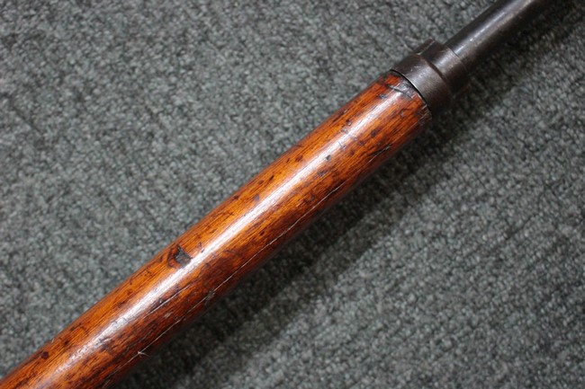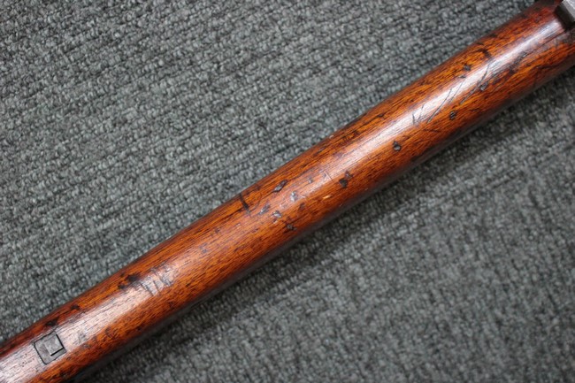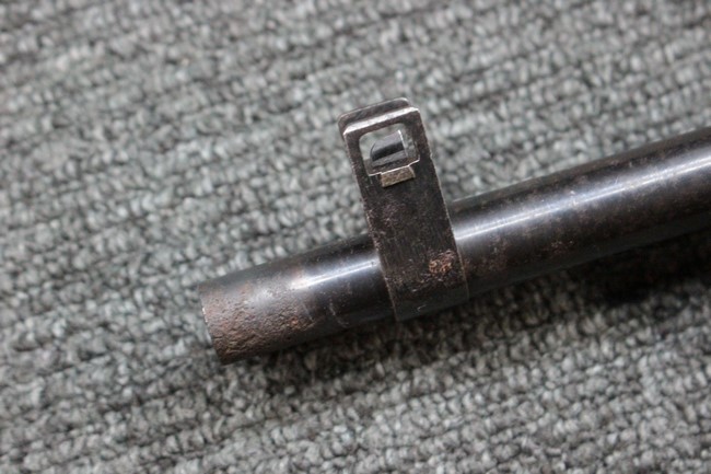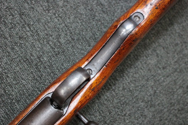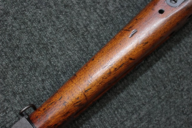 本品の金属部は、銃口下部付近に朽ち込みが見られ、他の部分には若干の小傷や擦れ、僅かな表面錆痕は見受けられるものの大きな欠損等は見受けられず、オリジナルのブルー仕上げも比較的残っています。 弾倉底板等にやや経年による褪色が見受けられますが、現状目立った朽ち込み等は見受けられません。 銃床については全体にやや打ち傷や線傷等が見受けられるものの、こちらも大きな破損等は見受けられず、概ねしっかりとした状態が保たれています。 木被 (ハンドガード) については、現状目立った割れやガタつき等は見られず色調もマッチしています。 旧軍小銃特有の銃床上下の継ぎ目については、ほぼ隙間が見受けられず、ガタつき等もは見られません。 傷み易い床尾板については、全体に仕上げが落ちて金属の地肌が表れており、やや表面錆痕が見られますが、目立った変形等は見られず、銃床への取り付けもガタつきもなくしっかりとしています。 表尺の起倒や調整、弾倉底板の開閉については問題なく行う事が可能です。 弾倉内の弾受 (フォロワー) 及びバネは入っていません。 さく杖は付属致しません。