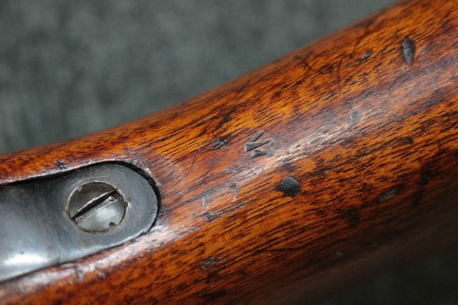 本品の機関部は小倉工廠製の初期型で、照尺には高射表尺が装備されており、下帯 (センター・バンド) は一脚取付基部のあるタイプとなっています。 本品の機関部左側面にはシリアルNo.の他、小倉工廠を示す刻印及び「ネ」のシリーズ刻印が入っている事から、昭和16年6月から昭和17年7月頃にかけて製造された事が窺えます。 安全子は細かなチェッカリングが入った初期/中期型に見られる仕様となっています。 薬室上面の菊花紋章は削られていますが、「九九式」の刻印についてははっきりと残っています。 銃床についても小倉工廠製で、銃床下部に小倉工廠製を示す「小」及び「セ」の刻印が入っています。 また、ボルト・ハンドルにも「セ」の刻印が小さく入っています。