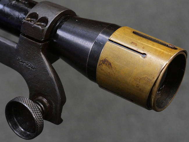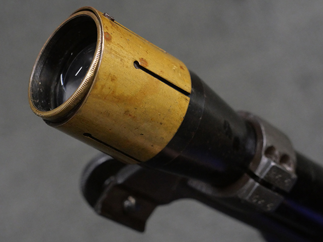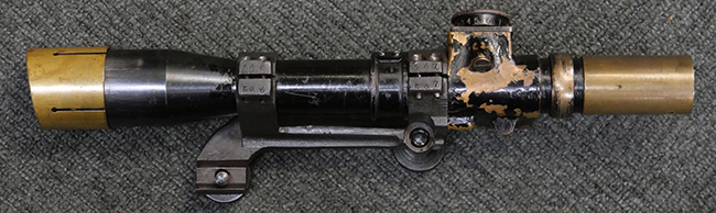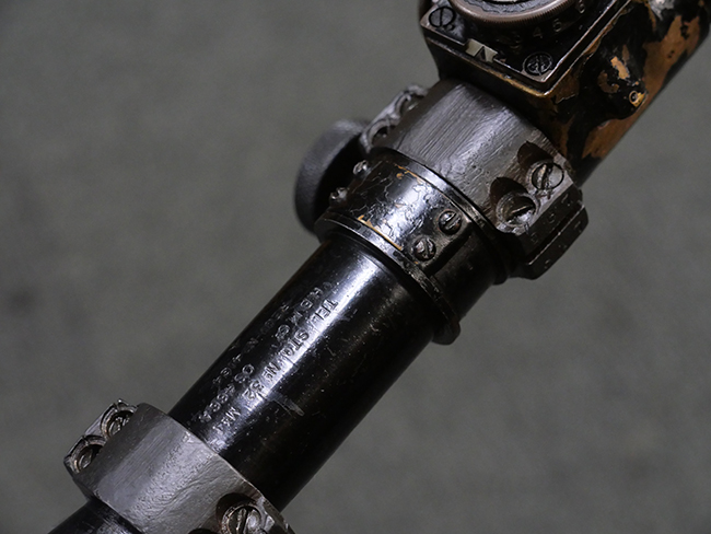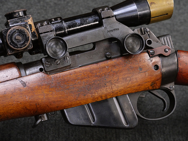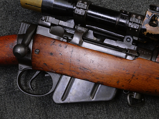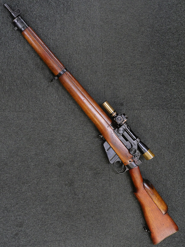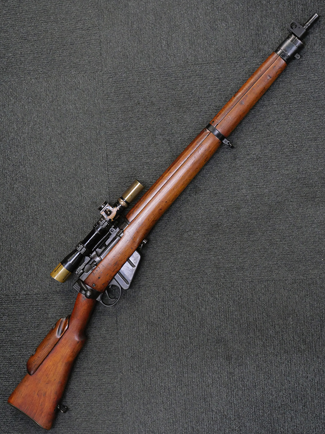 No.4 Mk 1 (T) は1942年に英軍に制式採用された狙撃銃で、No.4 Mk I小銃の中から精度の良い個体を選び、3.5倍率のNo.32スコープ及びその取り付け用ブラケットや木製チーク・ピースを取り付けたモデルです。 No.32スコープは、1942年に採用されたMk 1から1944年のMk 3まで各種バリエーションが存在します。 No.32 Mk 3はMk 1やMk 2と異なり、ウィンデージ・ノブ及びエレベーション・ノブの位置が前後にオフセットされていないのが外観上の特徴です。 尚、元々No.4 Mk I小銃のリア・サイトに設けられていたピープ・サイトは、スコープに干渉しないよう削り落とされています。 No.4 Mk I小銃から本銃への改修は、英国内では主にHolland & Holland社で行われた他、カナダのオンタリオ州ロング・ブランチにあったSmall Arms Limited及びCanadian Arsenals Limitedでも製造が行われ、それらの大半は英軍用として供給されました。 No.4 Mk I (T) 狙撃銃は、その後7,62mm×51 NATO弾を使用出来るように同銃を改修したL42A1狙撃銃が制式となった1970年代初頭まで第一線で使用されました。 約1,080挺のNo.4 Mk I (T) 及びNo. 4 Mk. I* (T) 狙撃銃がL42A1に改修されたと言われています。 (KK)
