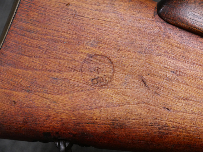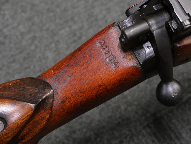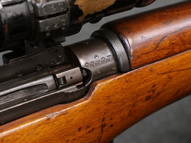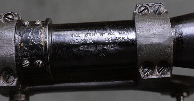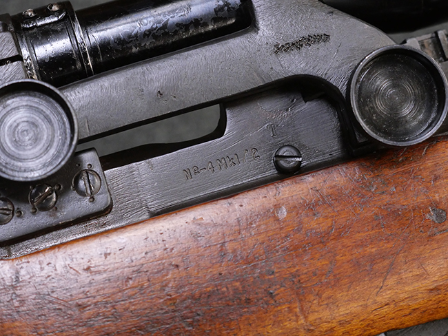 本品のバット・ソケット左側面には「F.R. 1962 R.F.I」の刻印が見られる事から、英国で製造されたNo.4 MkI (T) 狙撃銃の銃本体を1962年にインド イシャポール造兵廠にてNo.4 MKI/2仕様に改修した事が判ります。 薬室上部にはイシャポール造兵廠のプルーフ・マークが打刻されており、機関部左側面にはモデル名を示す「No4 MK.I/2」が打刻されています。 また、ストック基部やリア・サイトには米国サベージ社製を示す「S」の刻印が見られます。 その他の箇所のシリアルNo.はボルト・ハンドルがA0152T、マガジンがU15168となっています。 付属のNo.32サイト (スコープ) は初期型のNo.32 Mk.1で、接眼側に真鍮製の伸縮式アイ・カップ(レイン・シールド)が取り付けられているのが特徴となっています。 スコープには「TEL. STG. No.32 MK1 OS.466A REGo.No 4164」の刻印及び英国のHoughton Butcher Manufacturing Company製を示す「H.B.M.Co.」及びブロード・アロー刻印が入っています。