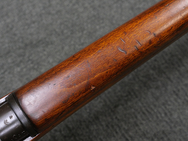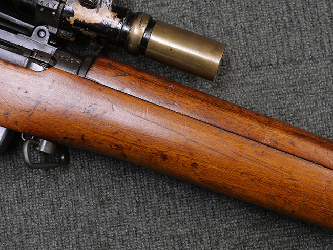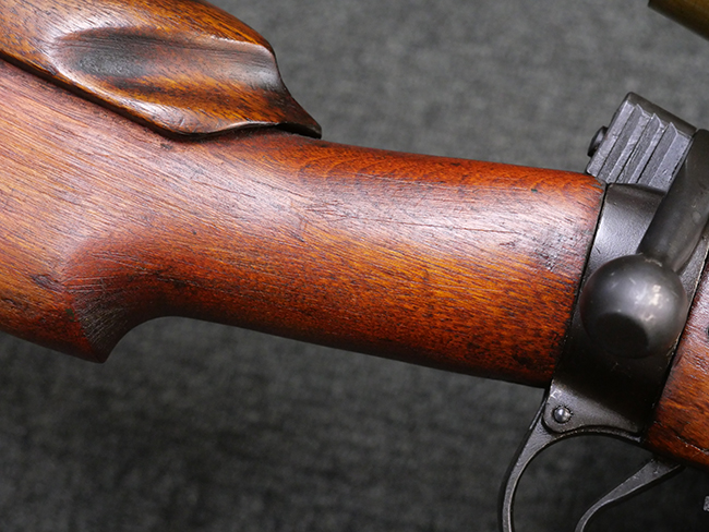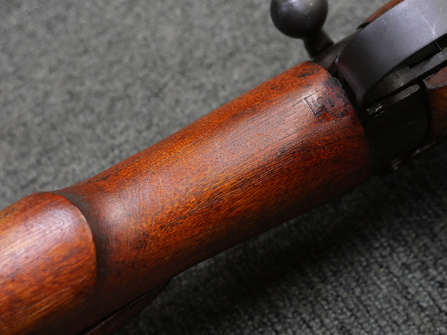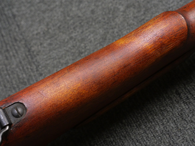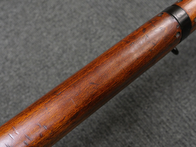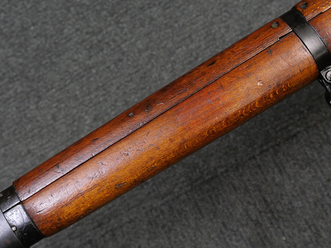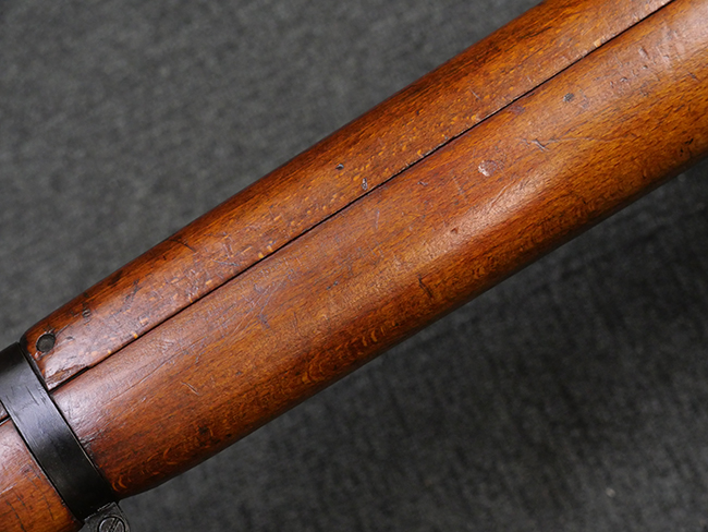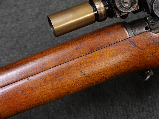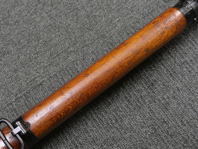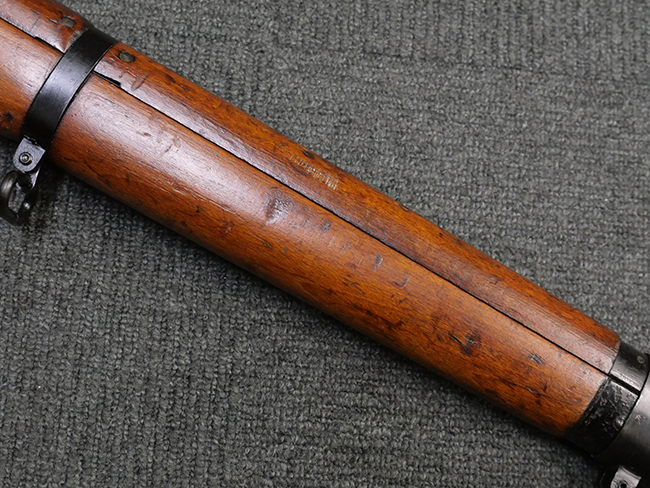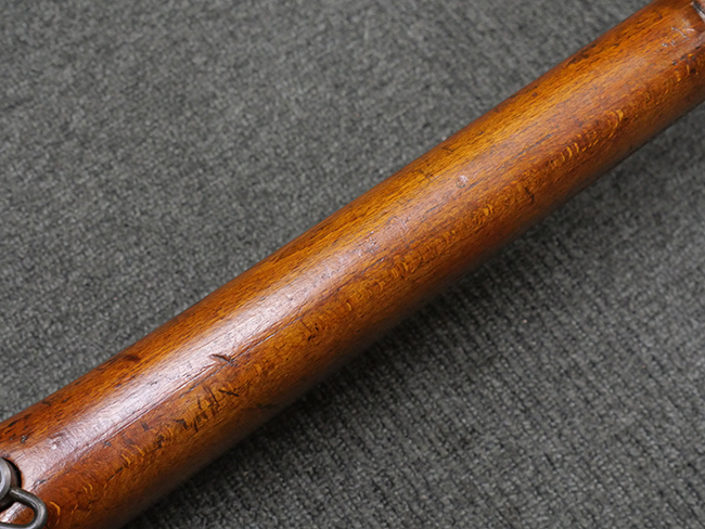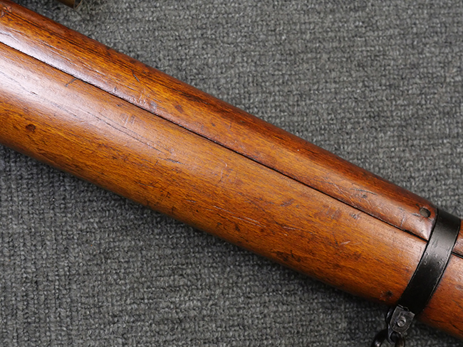 本品の金属部には角部を中心に若干の小傷や擦れの他、一部に塗装の剥落が見られるものの、目立った欠損等は見受けられず、大部分で表面仕上げが残った概ね良好な状態が保たれています。 木部については僅かな小傷や線傷が見られる程度で、大きな欠損や割れは見られません。 ストックの色味に関しては他の箇所に比べてバット・ストックの赤みが僅かに強い印象ですが、大きな違和感は見られません。 フォア・エンド(銃床前部)、ハンド・ガードといった各部の色合いはほぼ揃っています。 真鍮製のバット・プレートについても若干の打ち傷や摩耗が見られるものの、腐食等は見られず、ストック内コンパートメントの蓋の開閉も問題なく行う事が可能です。 付属のNo.32 Mk.1サイト(スコープ)は艶のある黒色焼付塗装となっており、真鍮製ウィンデージ/エレベーション・ノブ及び調整ノブ基部ユニット部には塗膜の剥落が見られます。 スコープの視野内はやや曇りや塵の混入が見られるものの、視界は比較的クリアで概ね良好なコンディションが保たれています。 真鍮製アイ・カップについても問題無く展開・収納を行うことが可能です。 スコープマウントの元のシリアルNo.は打ち消されています。 スコープの銃本体への取り付けもスムーズで、ガタつき無くタイトに固定されます。 リア・サイトの起倒・調整やセーフティー・レバーの操作、マガジンの着脱については問題なく行う事が可能です。 付属のマガジンについては若干の小傷や擦れは見られますが、目立った凹みや変形も見られず、比較的しっかりとした状態が保たれています。 尚、マガジン・スプリングは入っています。