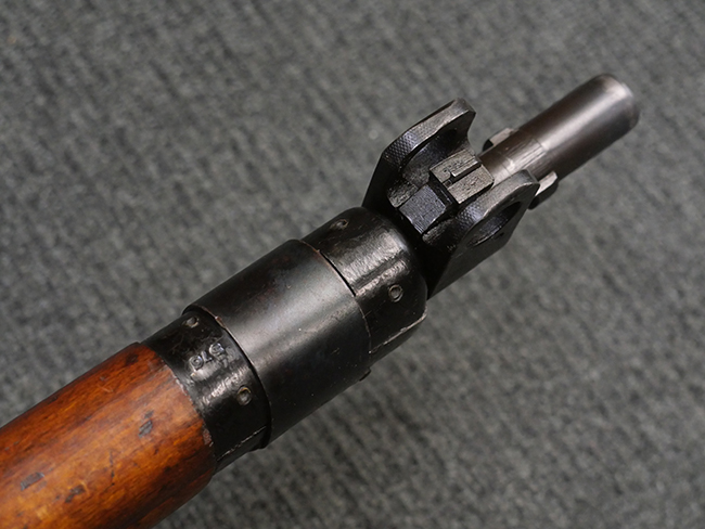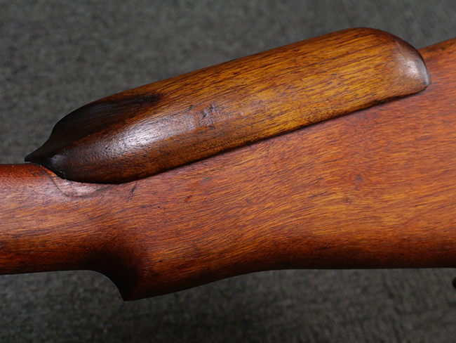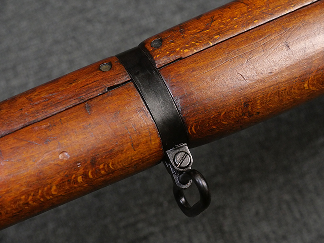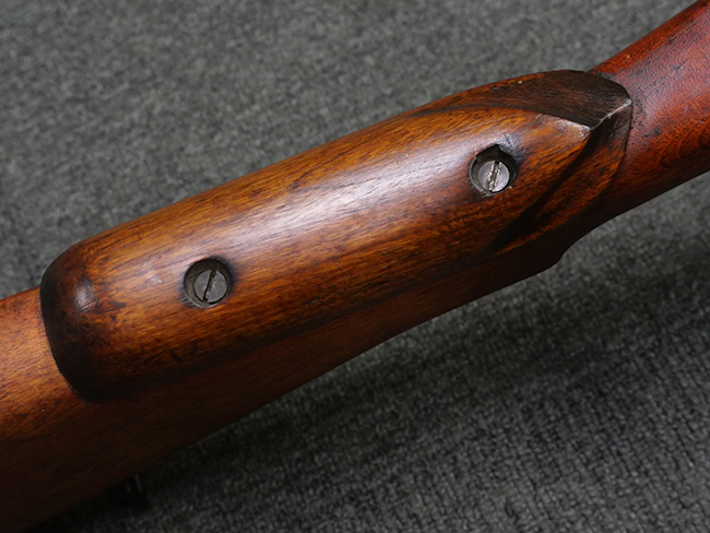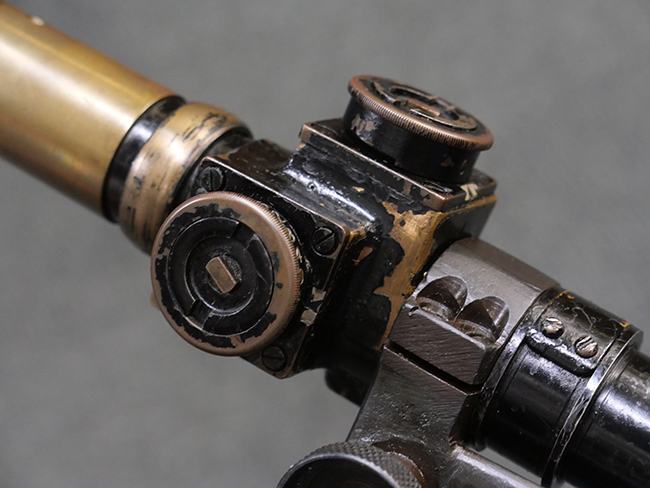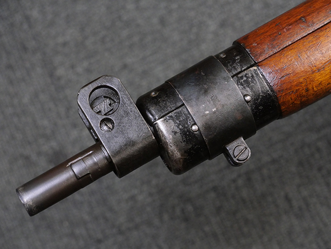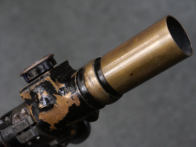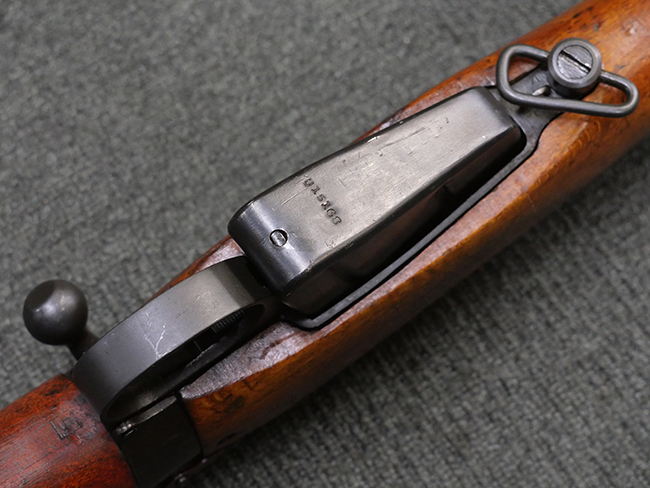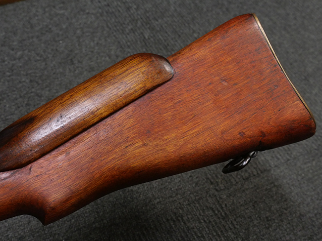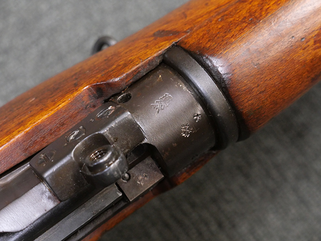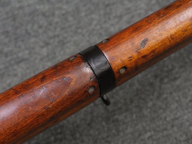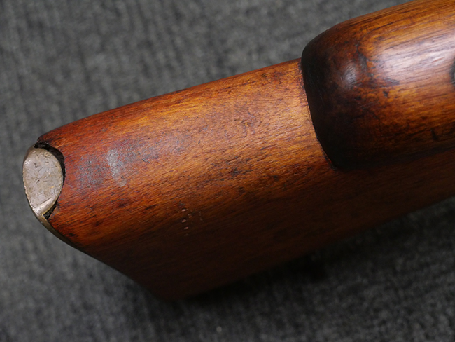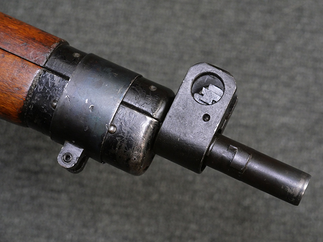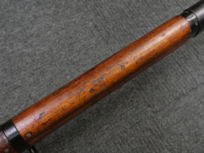 本品の金属部には角部を中心に若干の小傷や擦れの他、一部に塗装の剥落が見られるものの、目立った欠損等は見受けられず、大部分で表面仕上げが残った概ね良好な状態が保たれています。 木部については僅かな小傷や線傷が見られる程度で、大きな欠損や割れは見られません。 ストックの色味に関しては他の箇所に比べてバット・ストックの赤みが僅かに強い印象ですが、大きな違和感は見られません。 フォア・エンド(銃床前部)、ハンド・ガードといった各部の色合いはほぼ揃っています。 真鍮製のバット・プレートについても若干の打ち傷や摩耗が見られるものの、腐食等は見られず、ストック内コンパートメントの蓋の開閉も問題なく行う事が可能です。 付属のNo.32 Mk.1サイト(スコープ)は艶のある黒色焼付塗装となっており、真鍮製ウィンデージ/エレベーション・ノブ及び調整ノブ基部ユニット部には塗膜の剥落が見られます。 スコープの視野内はやや曇りや塵の混入が見られるものの、視界は比較的クリアで概ね良好なコンディションが保たれています。 真鍮製アイ・カップについても問題無く展開・収納を行うことが可能です。 スコープマウントの元のシリアルNo.は打ち消されています。 スコープの銃本体への取り付けもスムーズで、ガタつき無くタイトに固定されます。 リア・サイトの起倒・調整やセーフティー・レバーの操作、マガジンの着脱については問題なく行う事が可能です。 付属のマガジンについては若干の小傷や擦れは見られますが、目立った凹みや変形も見られず、比較的しっかりとした状態が保たれています。 尚、マガジン・スプリングは入っています。