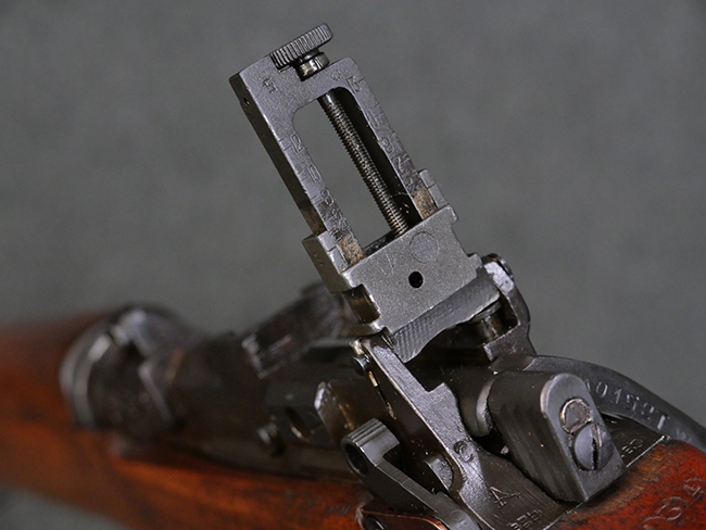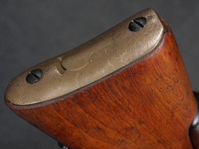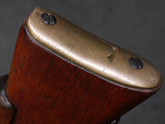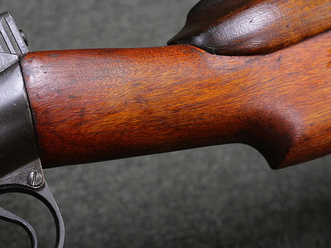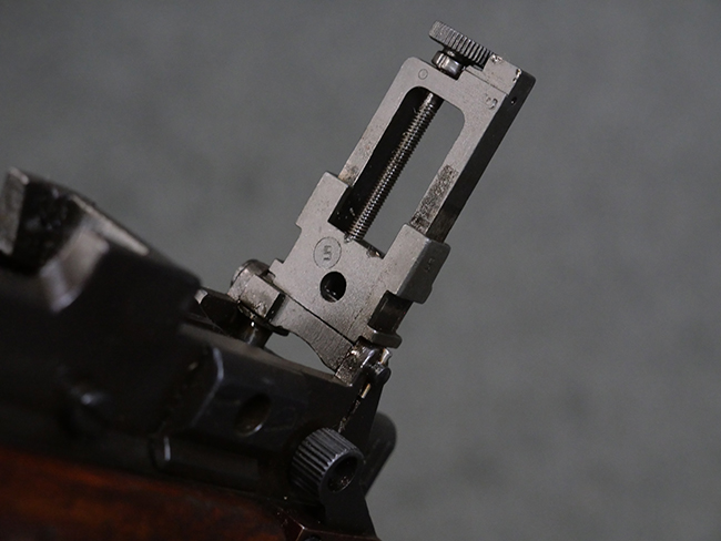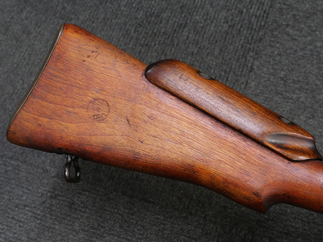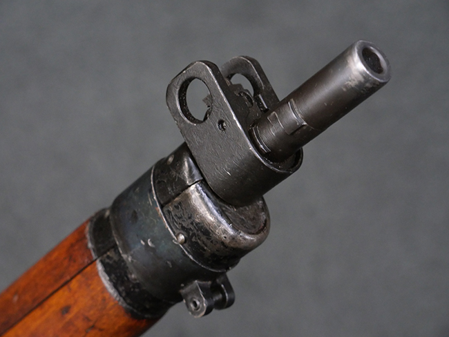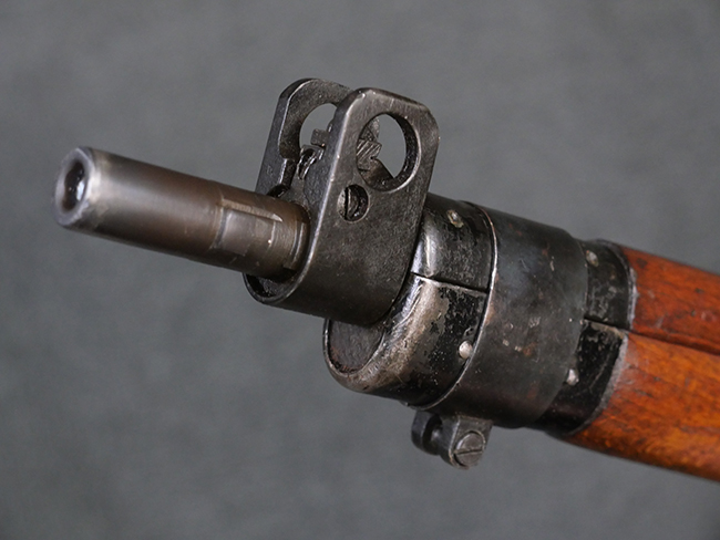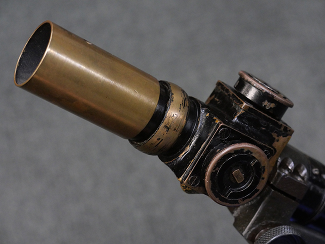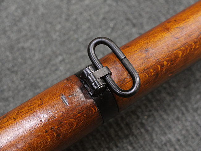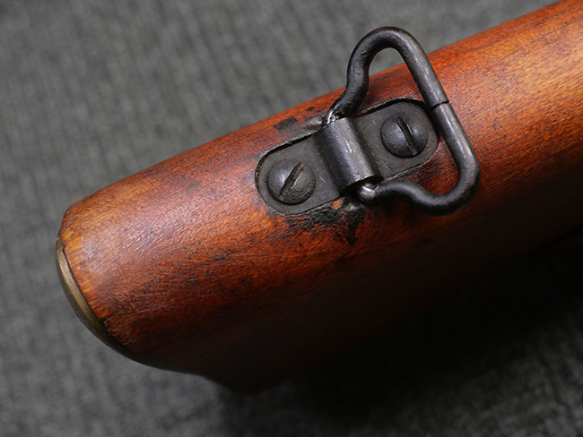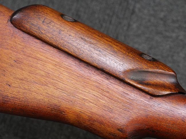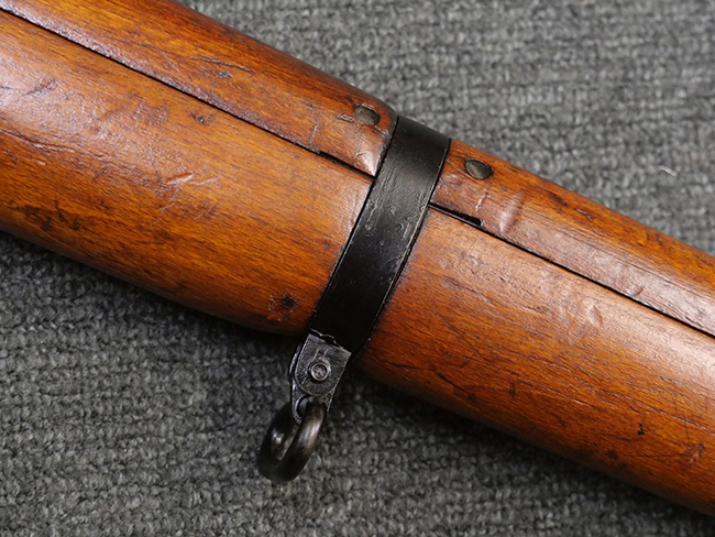 本品の金属部には角部を中心に若干の小傷や擦れの他、一部に塗装の剥落が見られるものの、目立った欠損等は見受けられず、大部分で表面仕上げが残った概ね良好な状態が保たれています。 木部については僅かな小傷や線傷が見られる程度で、大きな欠損や割れは見られません。 ストックの色味に関しては他の箇所に比べてバット・ストックの赤みが僅かに強い印象ですが、大きな違和感は見られません。 フォア・エンド(銃床前部)、ハンド・ガードといった各部の色合いはほぼ揃っています。 真鍮製のバット・プレートについても若干の打ち傷や摩耗が見られるものの、腐食等は見られず、ストック内コンパートメントの蓋の開閉も問題なく行う事が可能です。 付属のNo.32 Mk.1サイト(スコープ)は艶のある黒色焼付塗装となっており、真鍮製ウィンデージ/エレベーション・ノブ及び調整ノブ基部ユニット部には塗膜の剥落が見られます。 スコープの視野内はやや曇りや塵の混入が見られるものの、視界は比較的クリアで概ね良好なコンディションが保たれています。 真鍮製アイ・カップについても問題無く展開・収納を行うことが可能です。 スコープマウントの元のシリアルNo.は打ち消されています。 スコープの銃本体への取り付けもスムーズで、ガタつき無くタイトに固定されます。 リア・サイトの起倒・調整やセーフティー・レバーの操作、マガジンの着脱については問題なく行う事が可能です。 付属のマガジンについては若干の小傷や擦れは見られますが、目立った凹みや変形も見られず、比較的しっかりとした状態が保たれています。 尚、マガジン・スプリングは入っています。