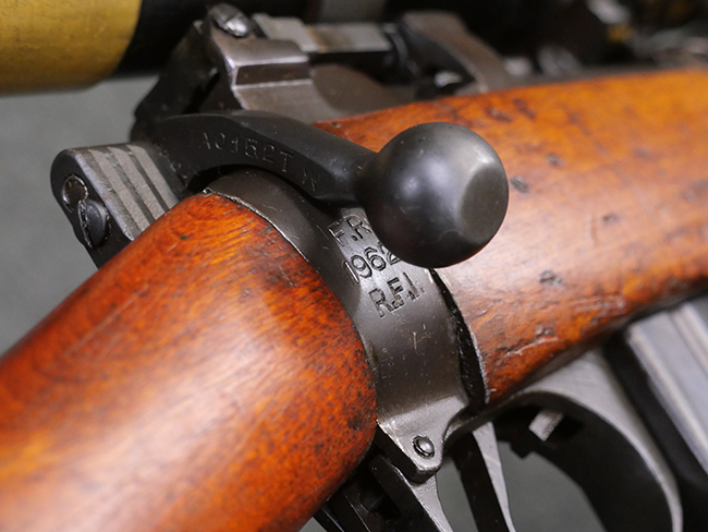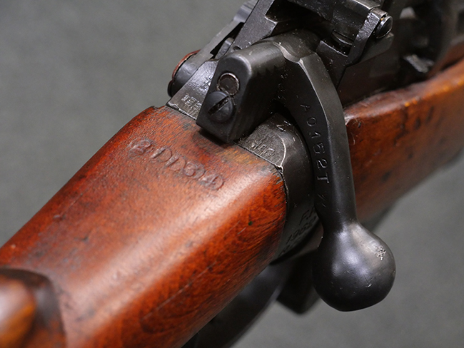リー・エンフィールド No.4 小銃は、SMLE No.1小銃の改良型で、第二次世界大戦中期以降のイギリス軍主力小銃です。 ダンケルク撤退で小銃不足となった1941年から大量生産が開始されました。 リー・エンフィールド小銃はボルトのロッキング・ラグが同時期の他のボルト・アクション・ライフルと比較して後部に配置されていた為、ボルト・ストロークが短くなり、より短時間で連射する事が可能でした。 No.4 小銃のSMLE No.1小銃からの大きな改良点は、リア・サイトが機関部後部に移り、ストックより僅かに突出した銃身先端にスパイク・バヨネットを取り付けるようになった点です。