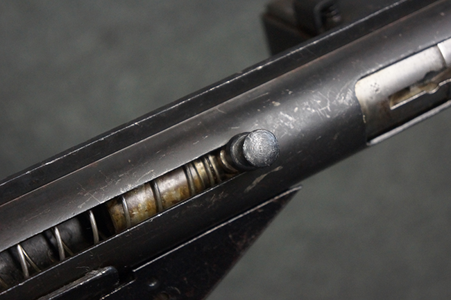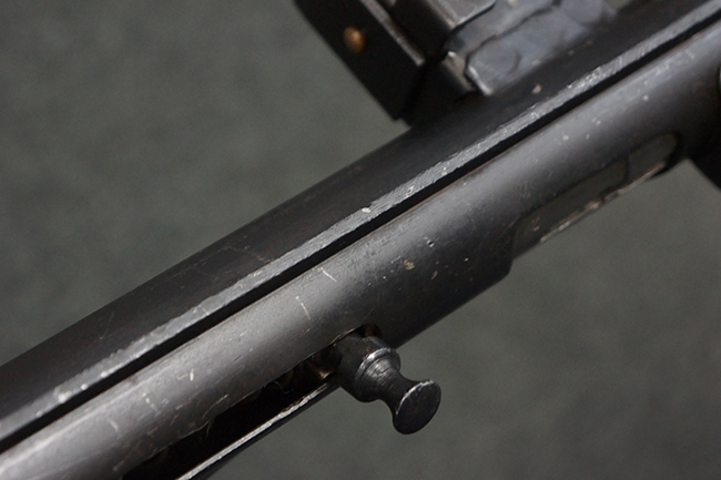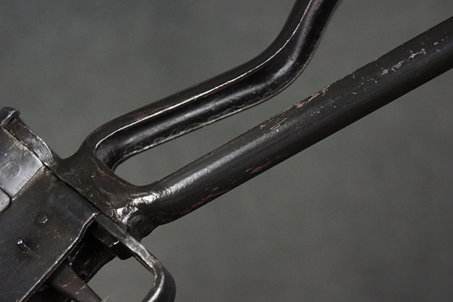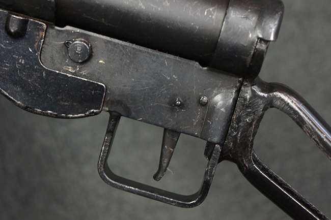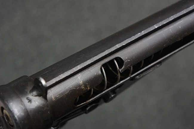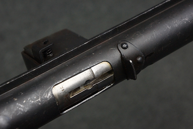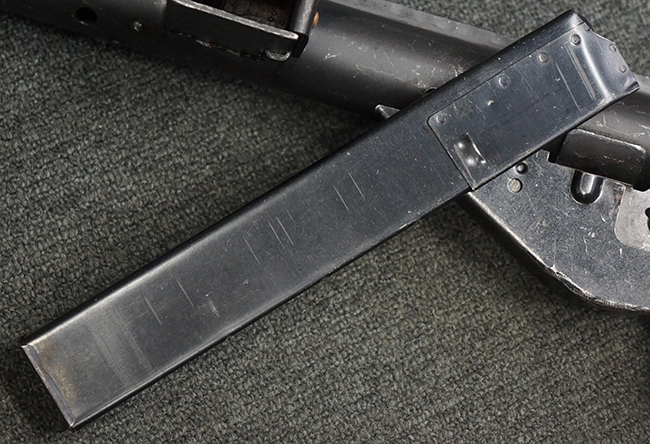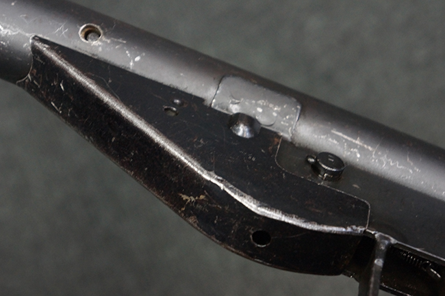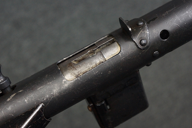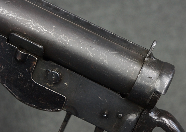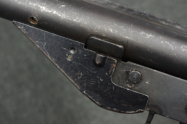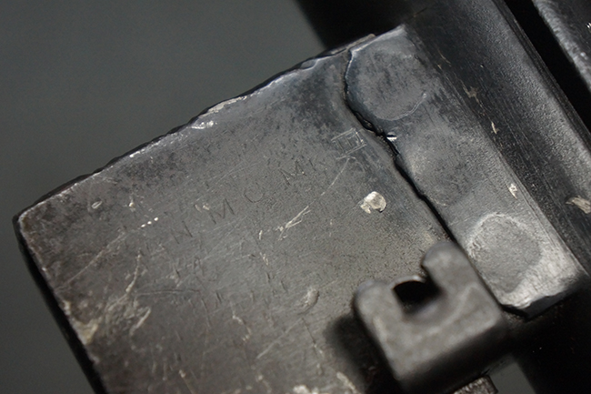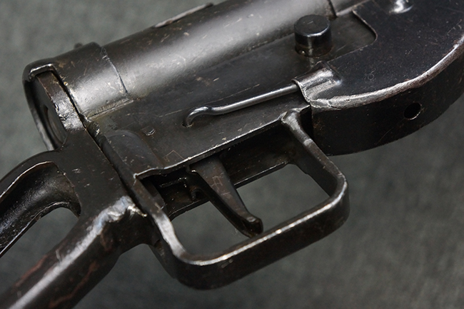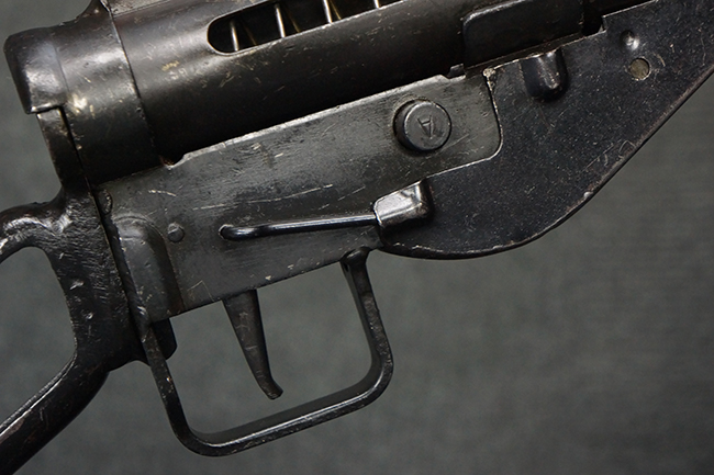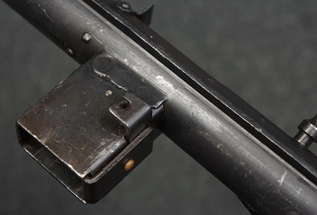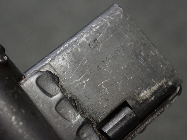 本品のマガジン・ハウジング上面には一部薄くなり判読が難しいものの「STEN. M. C. MK III」のモデル名刻印が入っており、マガジン・ハウジング下面にはシリアルNo.A24192に加えて、ラインズ・ブラザーズ社を示す「L. B.」のメーカー刻印が確認出来ます。 ストックはループ・タイプが取り付けられています。