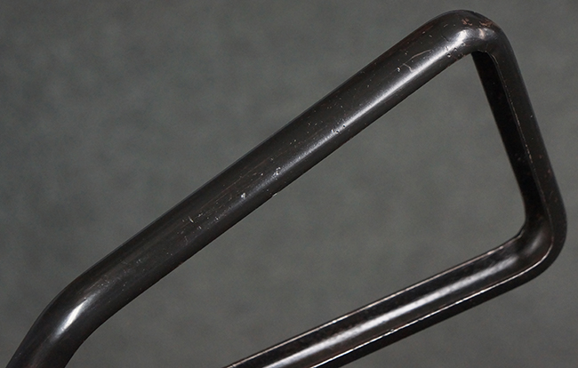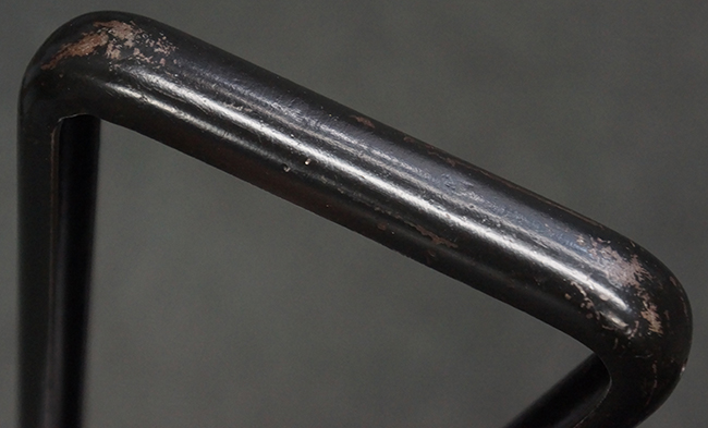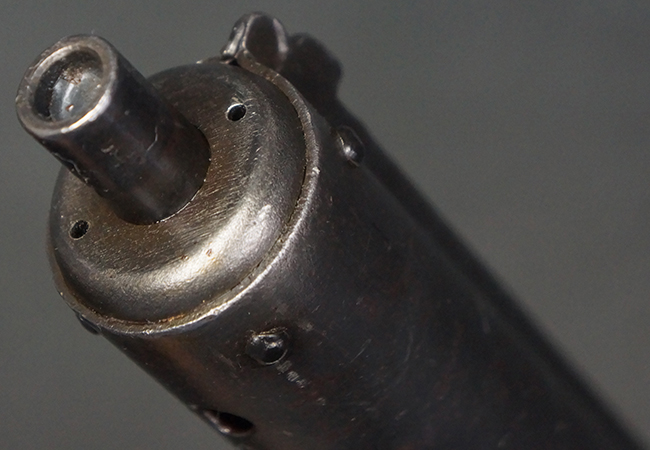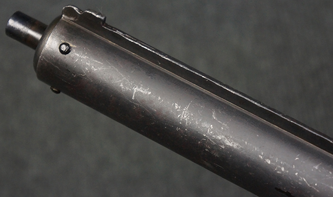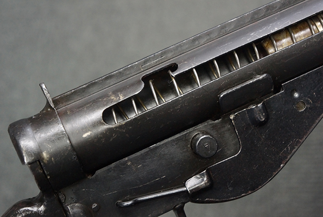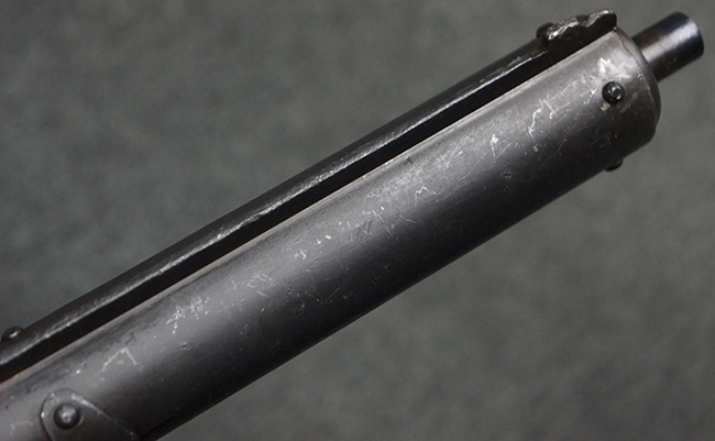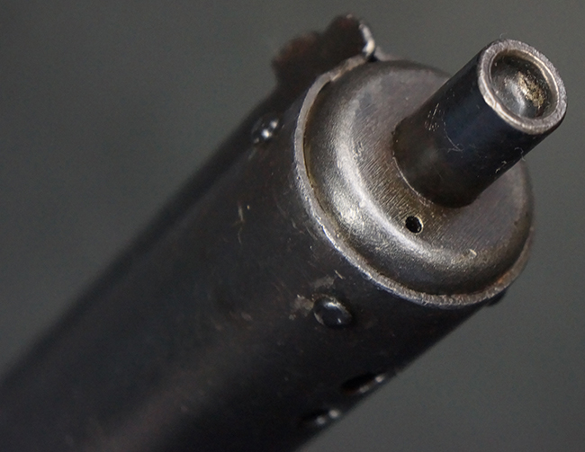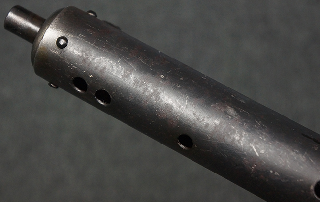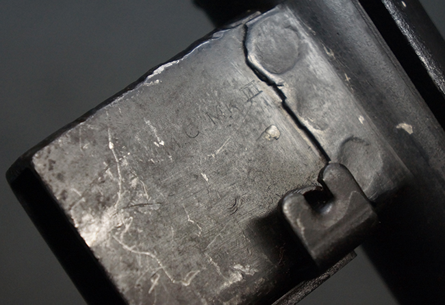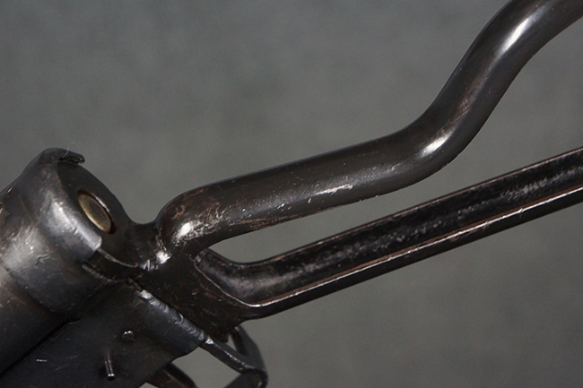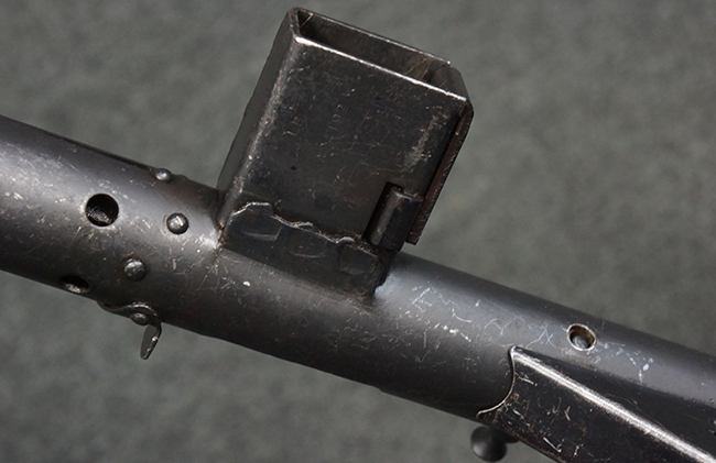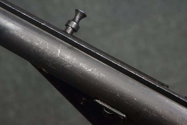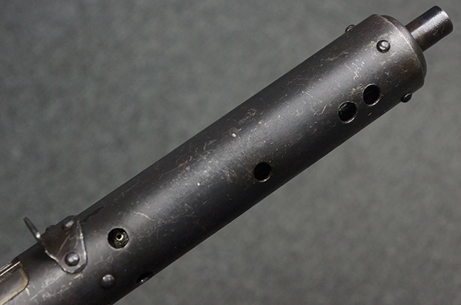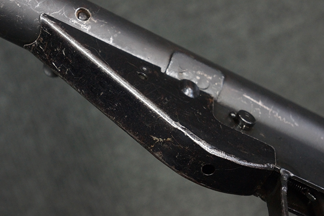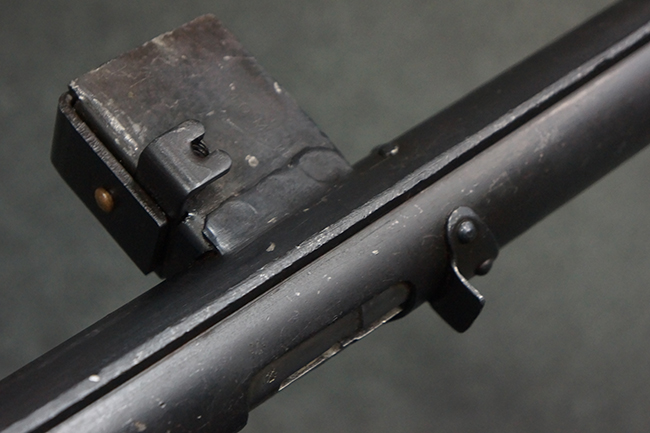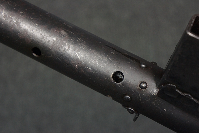 本品のマガジン・ハウジング上面には一部薄くなり判読が難しいものの「STEN. M. C. MK III」のモデル名刻印が入っており、マガジン・ハウジング下面にはシリアルNo.A24192に加えて、ラインズ・ブラザーズ社を示す「L. B.」のメーカー刻印が確認出来ます。 ストックはループ・タイプが取り付けられています。