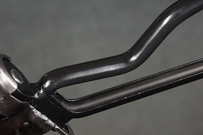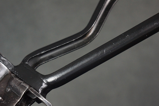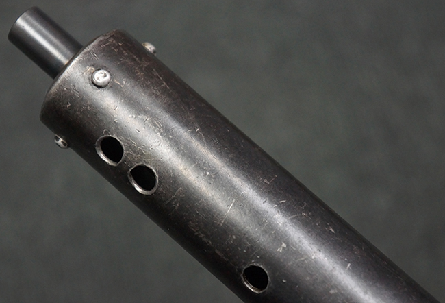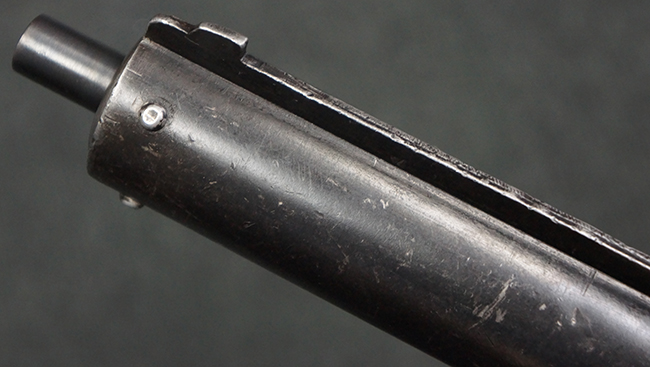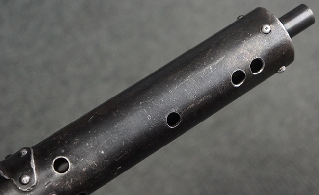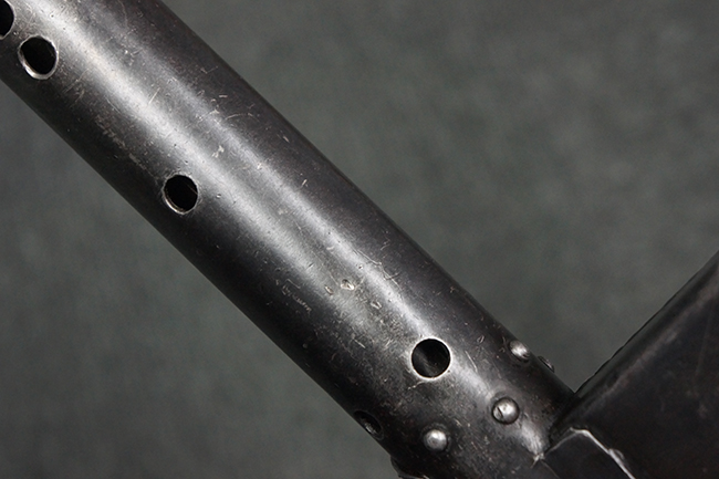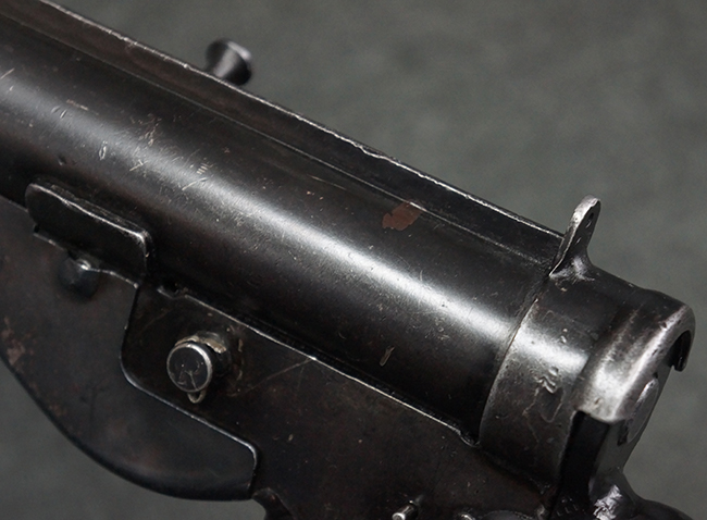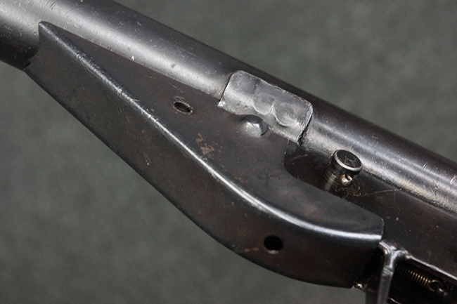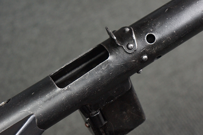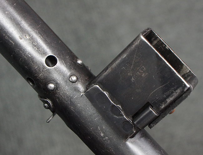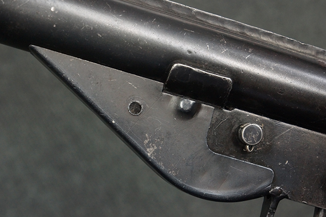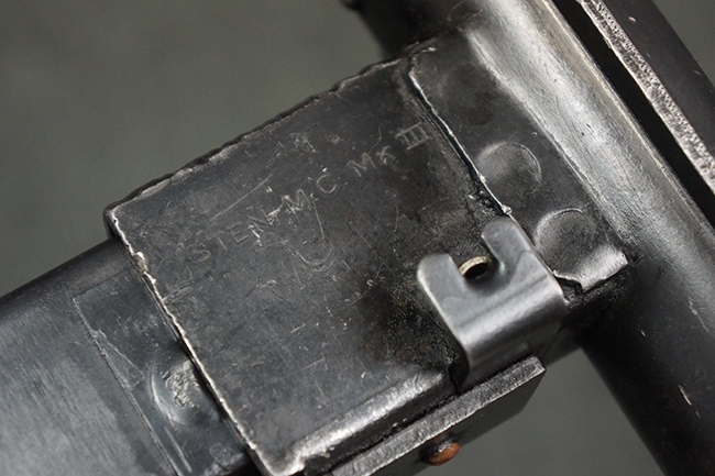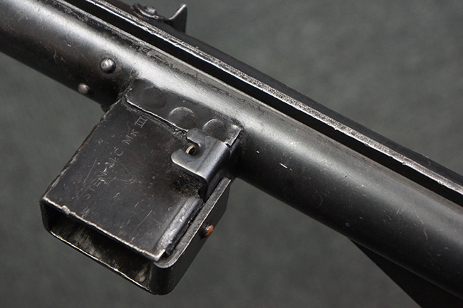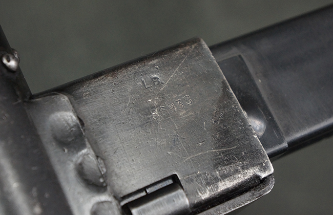 本品のマガジン・ハウジング上面には「STEN. M. C. MK III」のモデル名刻印が入っており、マガジン・ハウジング下面にはシリアルNo.86938に加えて、ラインズ・ブラザーズ社を示す「L. B.」のメーカー刻印が確認出来ます。 ストックはループ・タイプが取り付けられています。