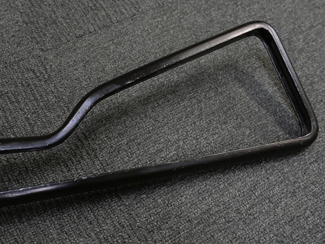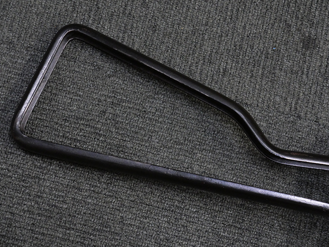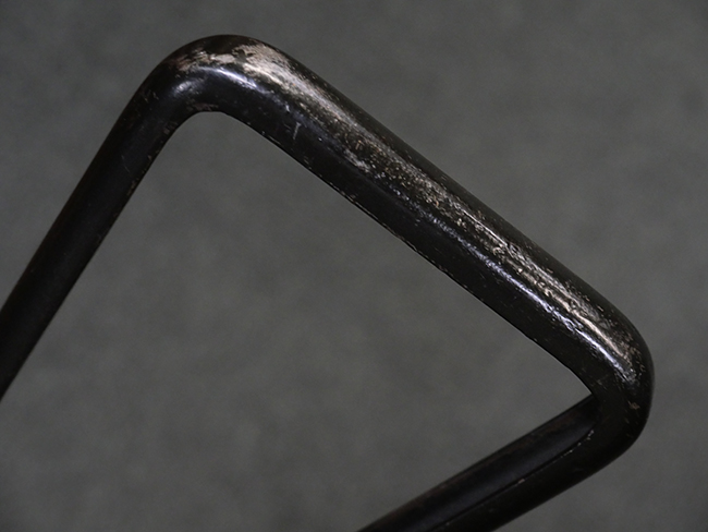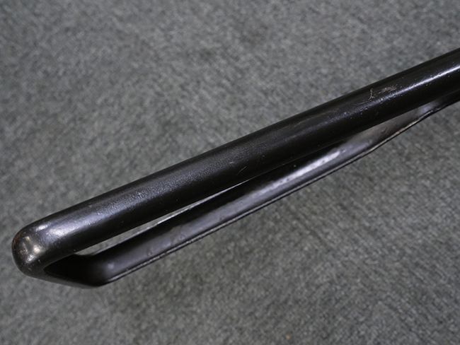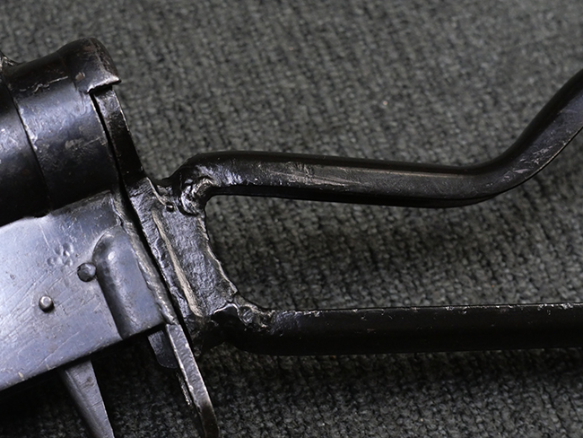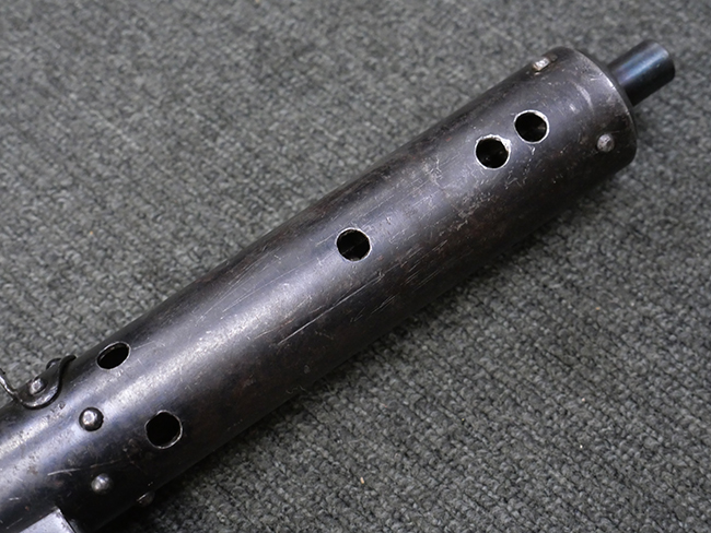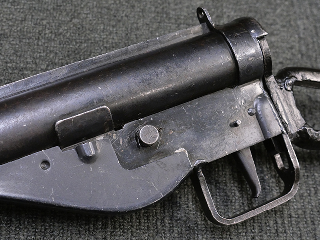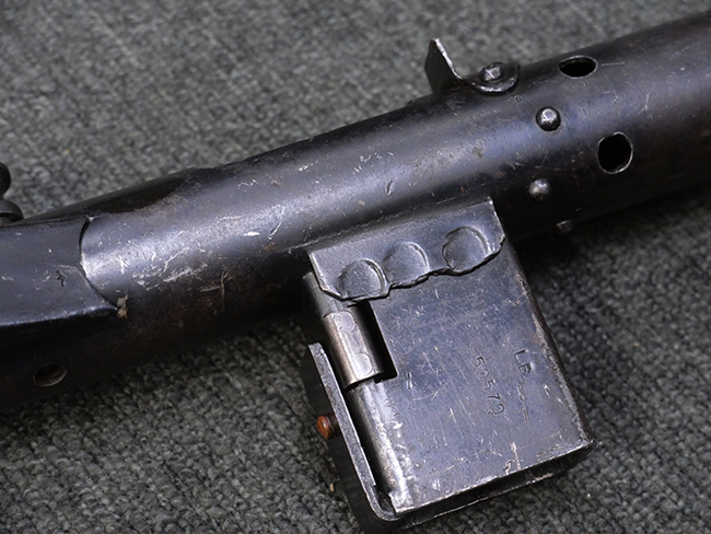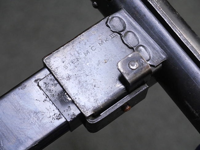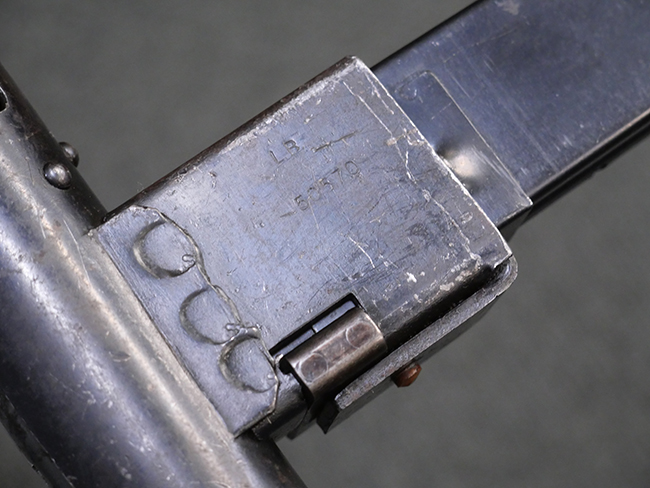 本品のマガジン・ハウジング上面には「STEN. M. C. MK III」のモデル名刻印が入っており、マガジン・ハウジング下面にはシリアルNo.50570に加えて、ラインズ・ブラザーズ社を示す「L. B.」のメーカー刻印が確認出来ます。 ストックは黒い焼付塗装のループ・タイプが取り付けられています。