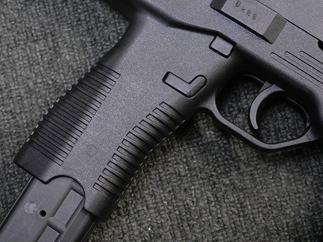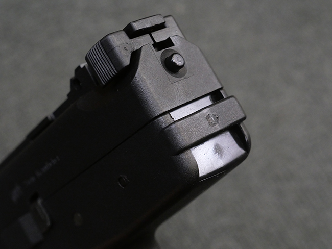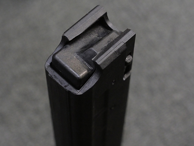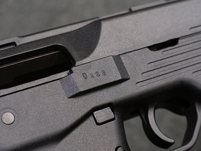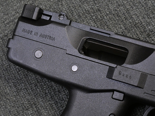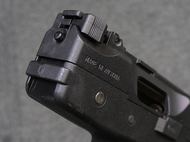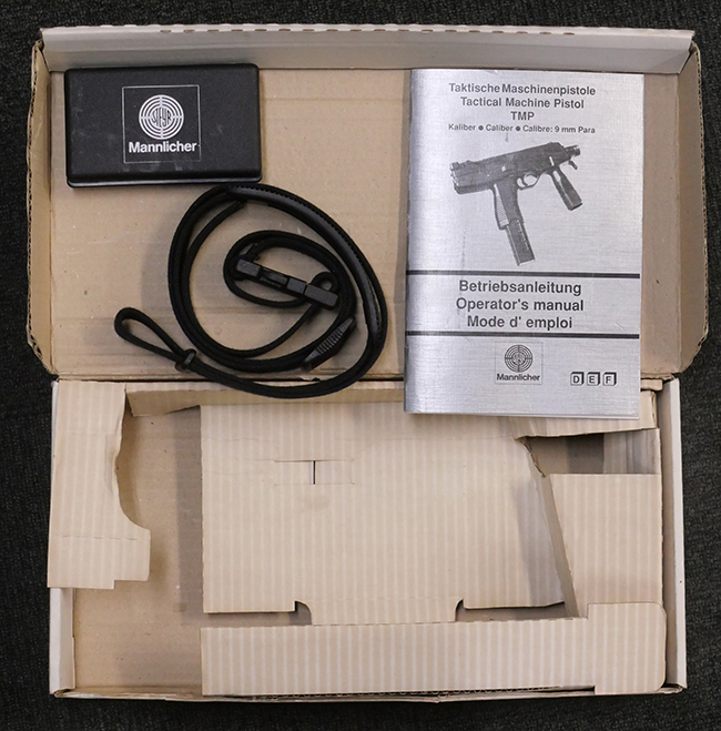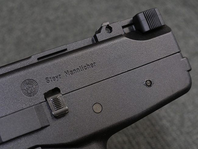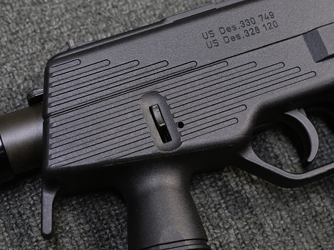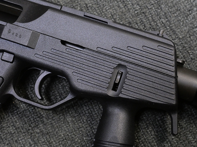 本品はフォア・グリップとセレクティブ・ファイア機能を備えたステアー TMP 短機関銃で、アッパー・フレーム左側面にステアー社のロゴ及び「Steyr Mannlicher」のメーカー刻印が入っている他、「US Des.330 749 US Des.328 120」のモールドが入っています。 アッパー・フレーム右側面には「MADE IN AUSTRIA」の刻印、エジェクション・ポート付近にはシリアルNo.D228の打刻が見られます。