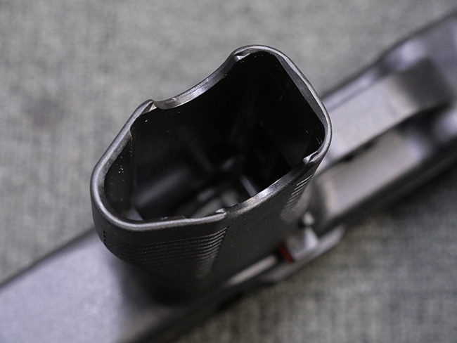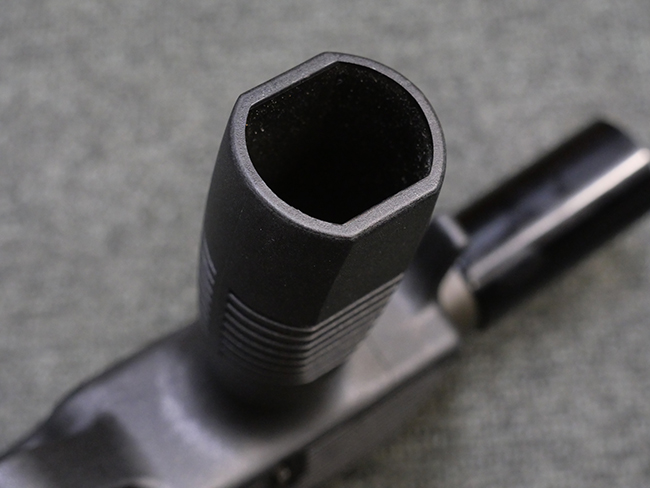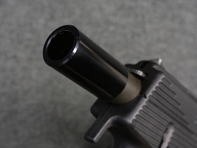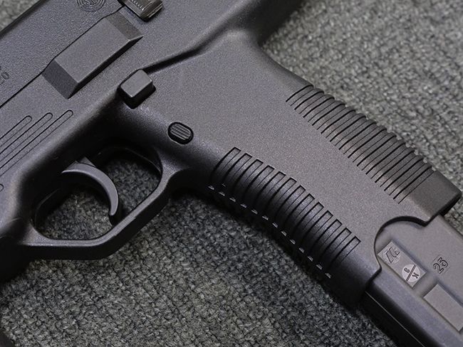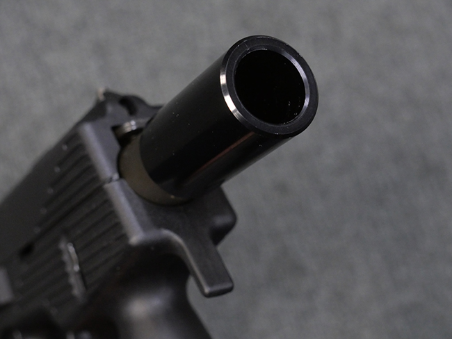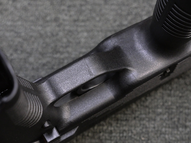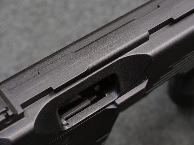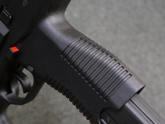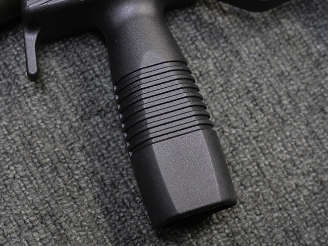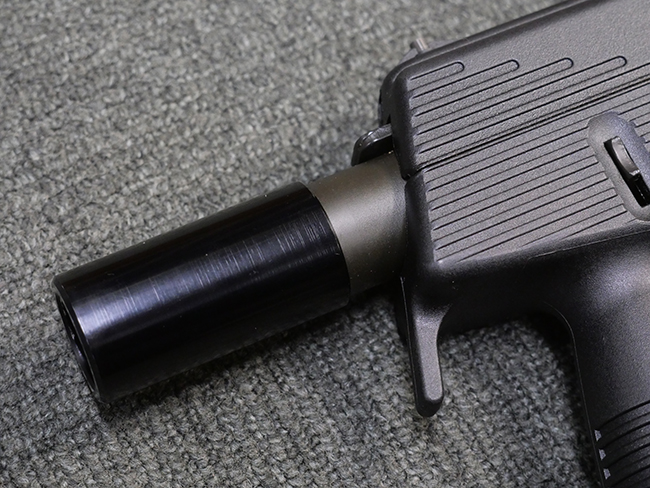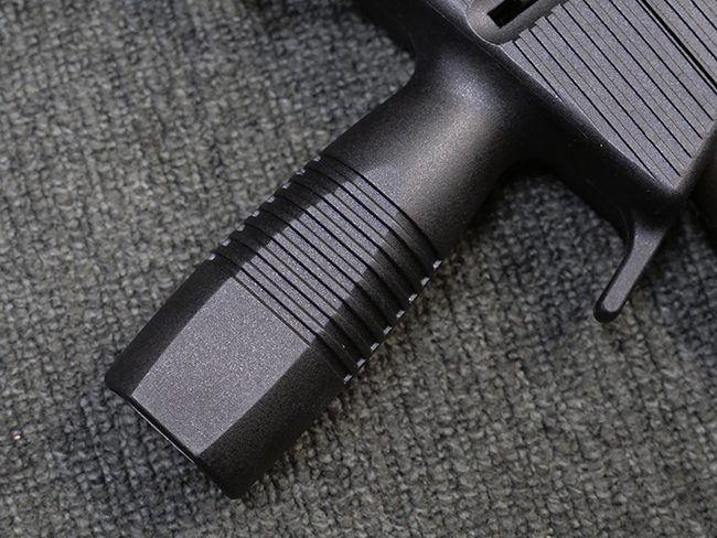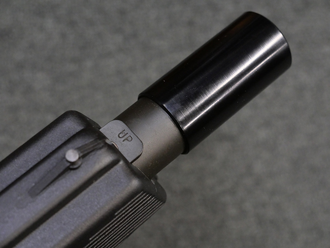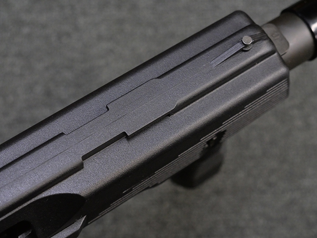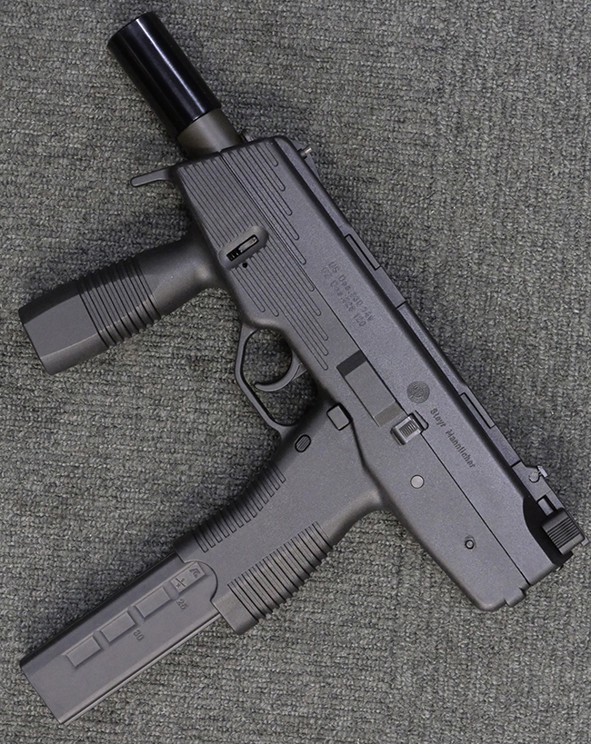 作動方式はローテイティング・バレルを備えたショート・リコイル式で、発射直後に銃身がボルトと共に僅かに交代し、その後レシーバー内の溝と銃身側のカムの働きにより銃身が僅かに回転してボルトとの閉鎖が解かれる構造となっています。 フル・オートマチック射撃時のコントロール性向上のため、本体前方下部にフォア・グリップを備えている他、着脱式のストックも用意されました。 グリップ基部にはクロス・ボルト式のセレクターが設けられており、左側もしくは右側からの押し込み量に応じて安全位置/セミ・オートマチック射撃/フル・オートマチック射撃の切り替えを行います。 バレル・ジャケット先端にはネジが切られており、サイレンサーの取り付けが可能となっています。