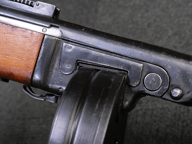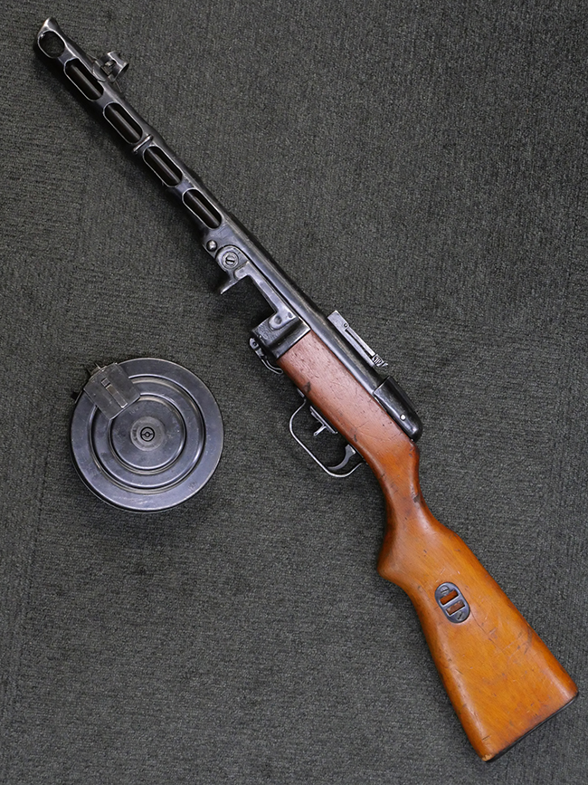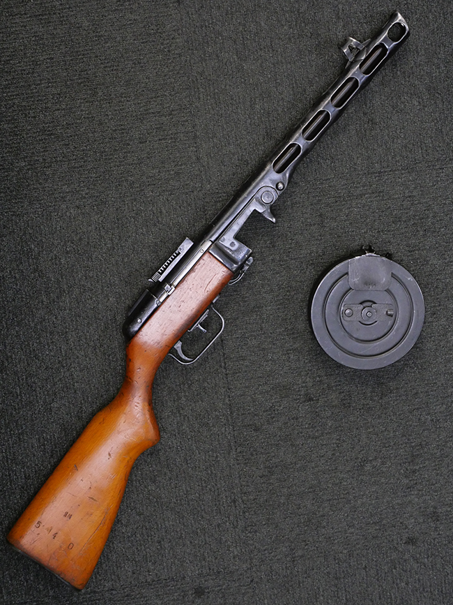 フィンランドとの冬戦争でゲリラ戦と短機関銃の有効性を思い知らされたソ連が短機関銃の増産を決定し、さらに新たに採用したのがこのPPSh41短機関銃です。ロシアでは1945年まで生産された第二次世界大戦時のソ連軍を代表する短機関銃で、また戦後も東側各国でライセンス生産や改良型が作られた息の長い銃でもあります。このためかリア・サイトの簡略化や専用のボックス・マガジンの採用の他、内部部品の仕様変更などマイナーチェンジを含めると、本銃はかなり細かい改良が続けられた経緯もあります。