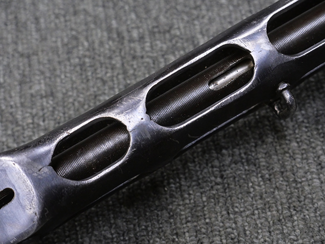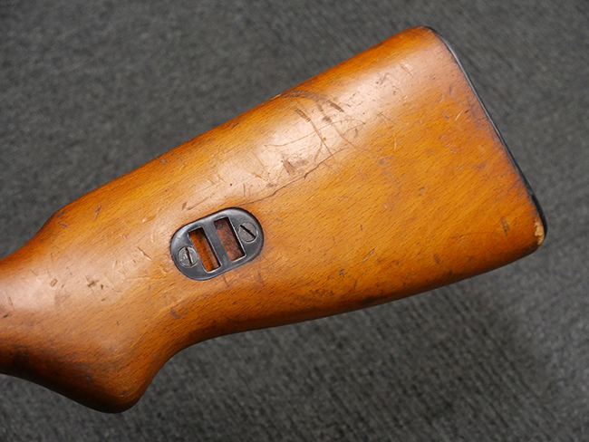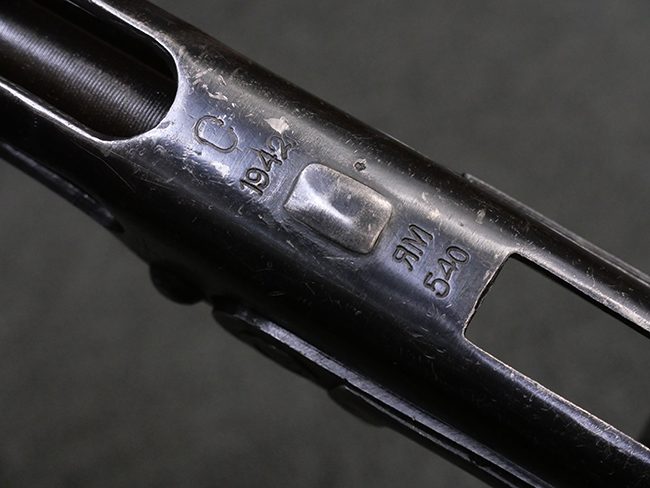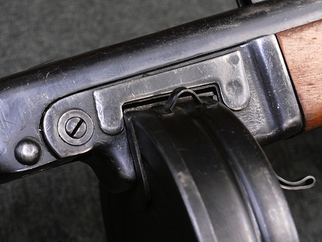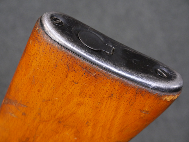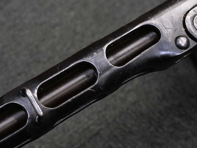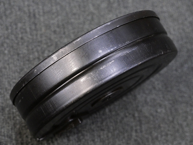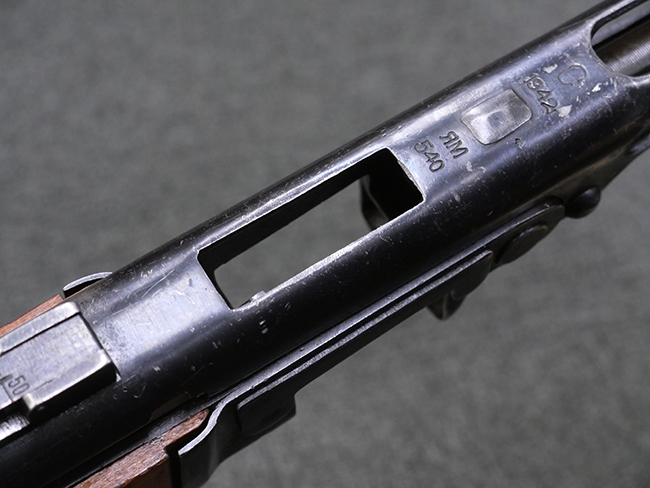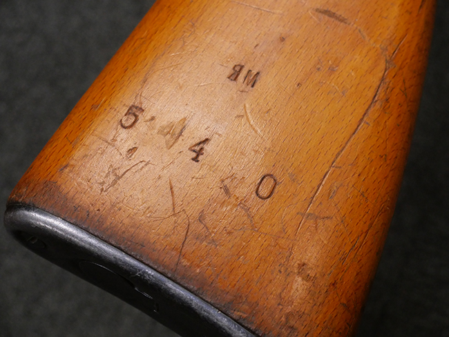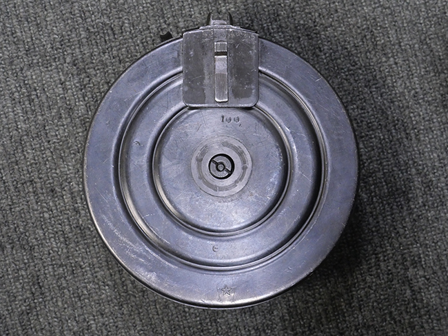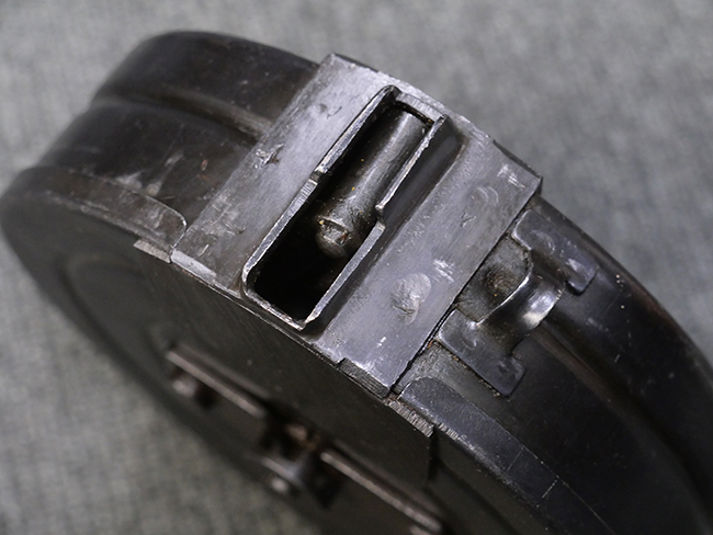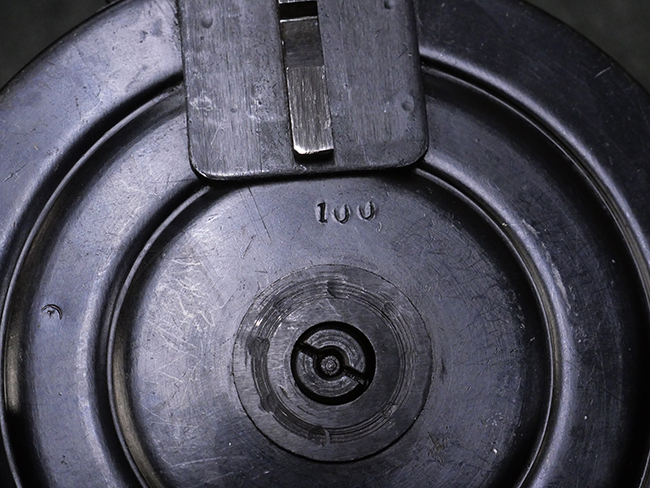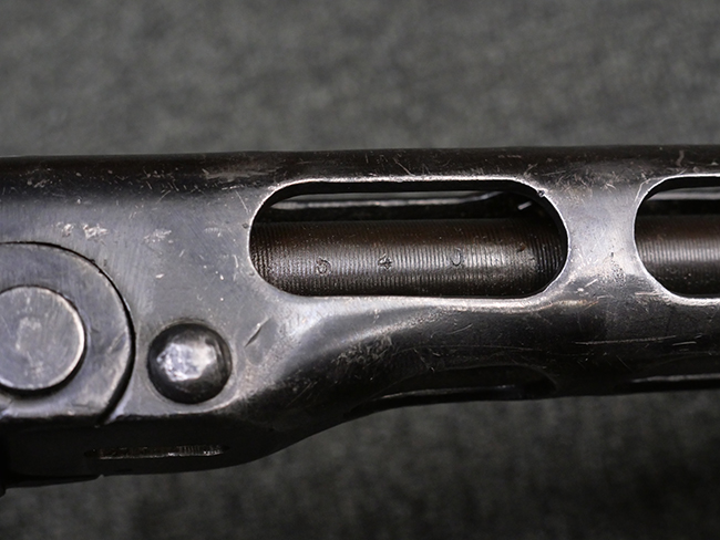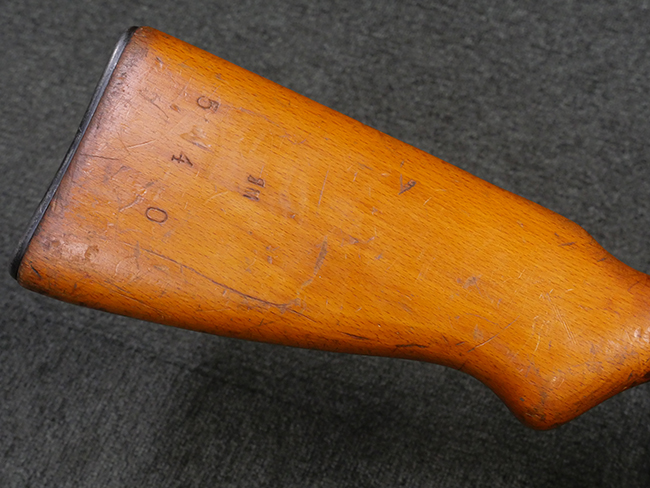 本品はリア・サイトがタンジェント式の初期型で、ロア・レシーバーのマガジン・ハウジング上部には補強板が溶接されている仕様です。 バレル・ジャケット上面には製造年ヲ示す「1942」とモスクワ第828工場製を示す「S」の刻印、レシーバー上部にはシリアルNo.540の刻印が見られます。 シリアルNo.はバレル、トリガー・ガード、ストックでマッチしています。 本品の金属部には小傷や擦れ、一部に表面仕上げが薄くなり地の金属色が覗ている箇所が見られるものの、全体的に大きな腐食や欠損は見られず、概ね良好な状態が保たれています。 木製ストックについては小傷や打ち傷が見られるものの、こちらも割れ等の破損は見られず、しっかりとした状態が保たれています。 傷みやすいバット・プレート部に関しては若干の打ち傷や擦れ、角部に表面仕上げの褪色が見られますが、錆等の腐食は見られず、ストックへの取り付けにガタつきは見られません。 付属のドラム・マガジンは若干の擦れや小傷が見られるものの、腐食や大きな変形のないしっかりした状態が保たれています。 マガジンの取り付けには若干のガタつきが見られますが、マガジン・キャッチの機能に問題はなく、ガタつきの出やすいPPSh41としては十分許容範囲内といった程度です。 リア・サイトの調整、セレクターの切り替え、レシーバーのテイクダウン操作、マガジンの着脱、ストックのコンパートメント蓋の開閉は問題無く行うことが可能です。