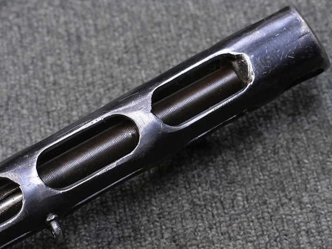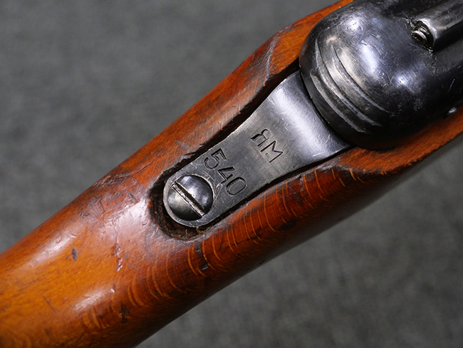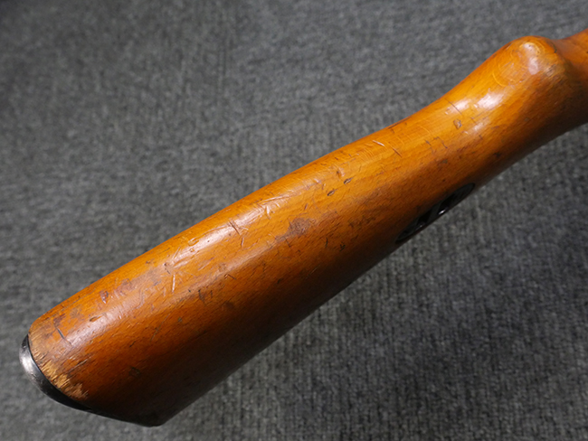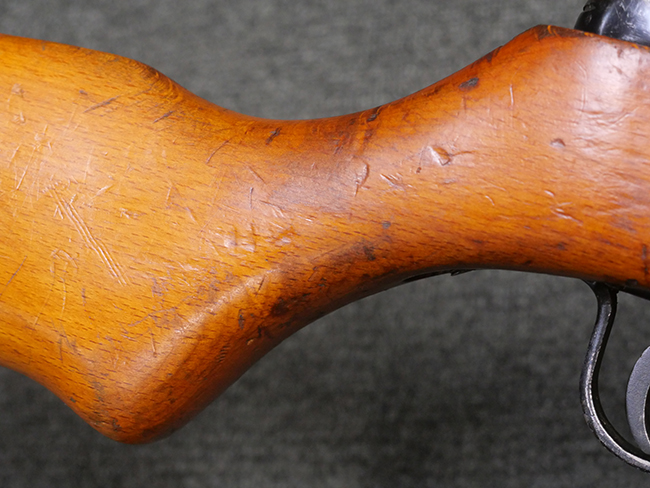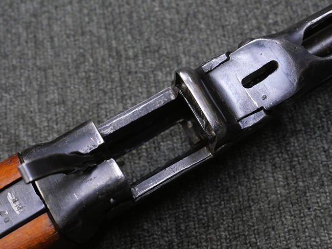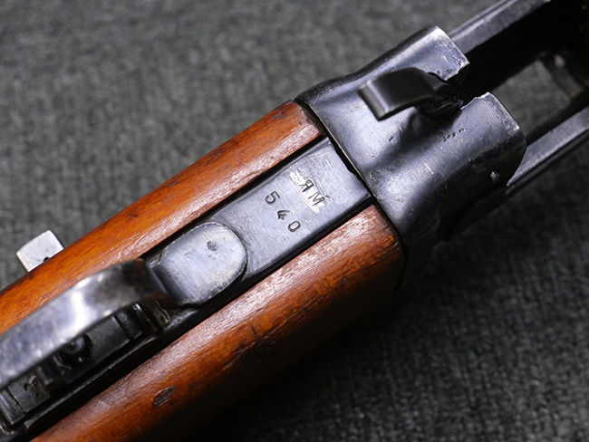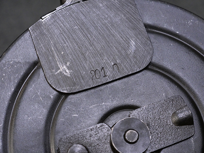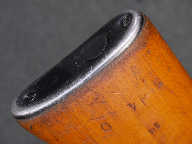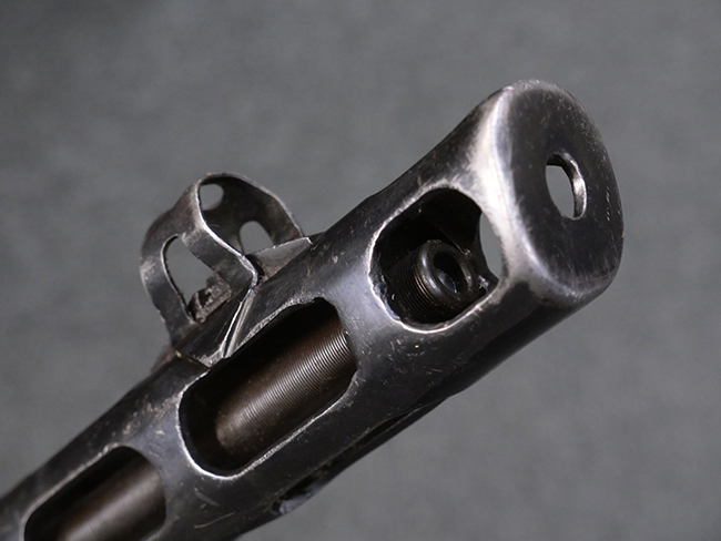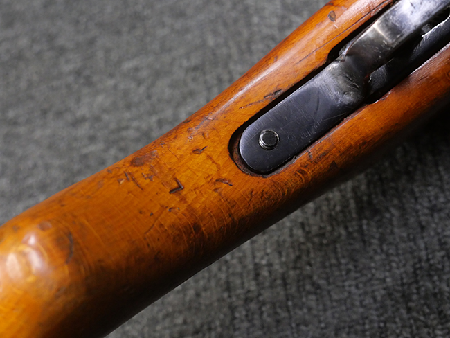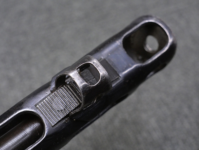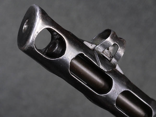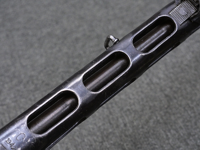 本品はリア・サイトがタンジェント式の初期型で、ロア・レシーバーのマガジン・ハウジング上部には補強板が溶接されている仕様です。 バレル・ジャケット上面には製造年ヲ示す「1942」とモスクワ第828工場製を示す「S」の刻印、レシーバー上部にはシリアルNo.540の刻印が見られます。 シリアルNo.はバレル、トリガー・ガード、ストックでマッチしています。 本品の金属部には小傷や擦れ、一部に表面仕上げが薄くなり地の金属色が覗ている箇所が見られるものの、全体的に大きな腐食や欠損は見られず、概ね良好な状態が保たれています。 木製ストックについては小傷や打ち傷が見られるものの、こちらも割れ等の破損は見られず、しっかりとした状態が保たれています。 傷みやすいバット・プレート部に関しては若干の打ち傷や擦れ、角部に表面仕上げの褪色が見られますが、錆等の腐食は見られず、ストックへの取り付けにガタつきは見られません。 付属のドラム・マガジンは若干の擦れや小傷が見られるものの、腐食や大きな変形のないしっかりした状態が保たれています。 マガジンの取り付けには若干のガタつきが見られますが、マガジン・キャッチの機能に問題はなく、ガタつきの出やすいPPSh41としては十分許容範囲内といった程度です。 リア・サイトの調整、セレクターの切り替え、レシーバーのテイクダウン操作、マガジンの着脱、ストックのコンパートメント蓋の開閉は問題無く行うことが可能です。