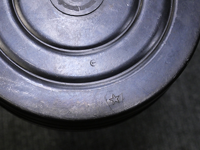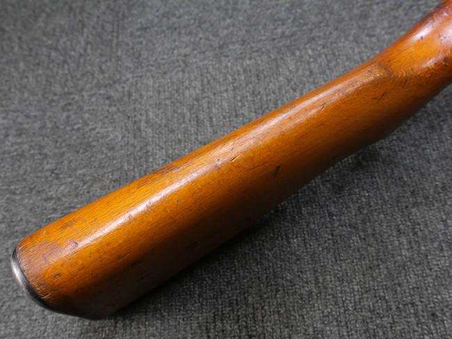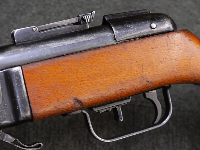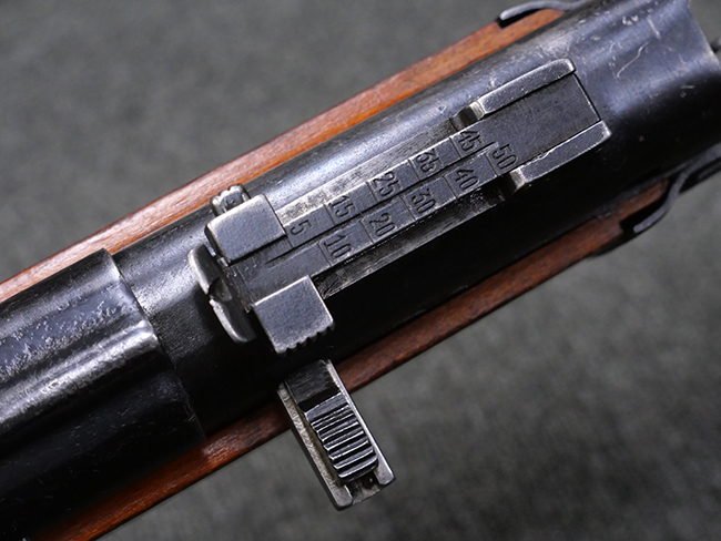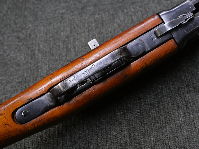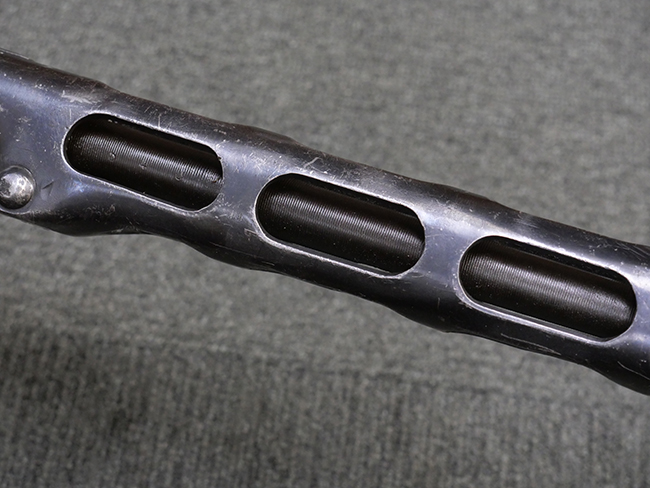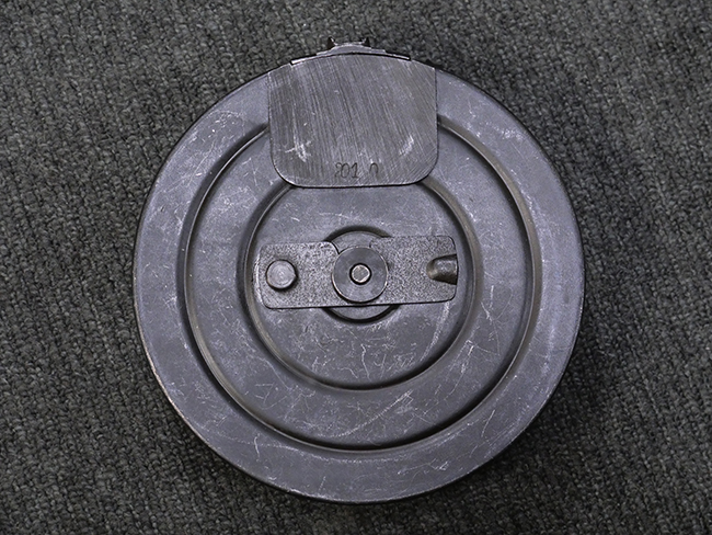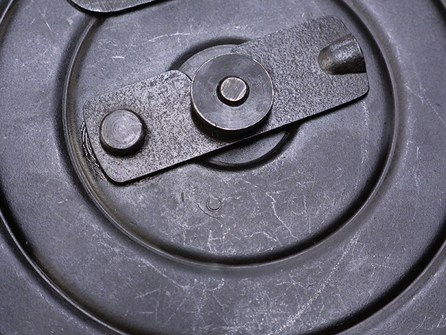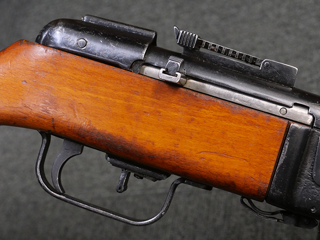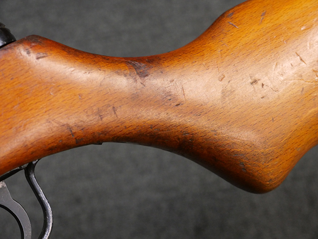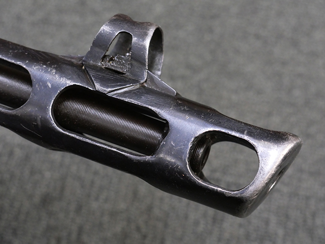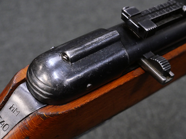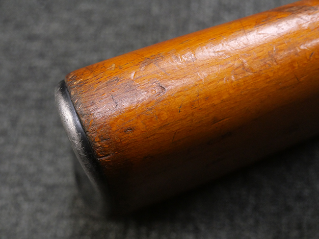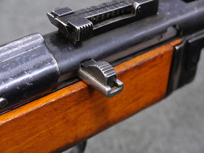 本品はリア・サイトがタンジェント式の初期型で、ロア・レシーバーのマガジン・ハウジング上部には補強板が溶接されている仕様です。 バレル・ジャケット上面には製造年ヲ示す「1942」とモスクワ第828工場製を示す「S」の刻印、レシーバー上部にはシリアルNo.540の刻印が見られます。 シリアルNo.はバレル、トリガー・ガード、ストックでマッチしています。 本品の金属部には小傷や擦れ、一部に表面仕上げが薄くなり地の金属色が覗ている箇所が見られるものの、全体的に大きな腐食や欠損は見られず、概ね良好な状態が保たれています。 木製ストックについては小傷や打ち傷が見られるものの、こちらも割れ等の破損は見られず、しっかりとした状態が保たれています。 傷みやすいバット・プレート部に関しては若干の打ち傷や擦れ、角部に表面仕上げの褪色が見られますが、錆等の腐食は見られず、ストックへの取り付けにガタつきは見られません。 付属のドラム・マガジンは若干の擦れや小傷が見られるものの、腐食や大きな変形のないしっかりした状態が保たれています。 マガジンの取り付けには若干のガタつきが見られますが、マガジン・キャッチの機能に問題はなく、ガタつきの出やすいPPSh41としては十分許容範囲内といった程度です。 リア・サイトの調整、セレクターの切り替え、レシーバーのテイクダウン操作、マガジンの着脱、ストックのコンパートメント蓋の開閉は問題無く行うことが可能です。