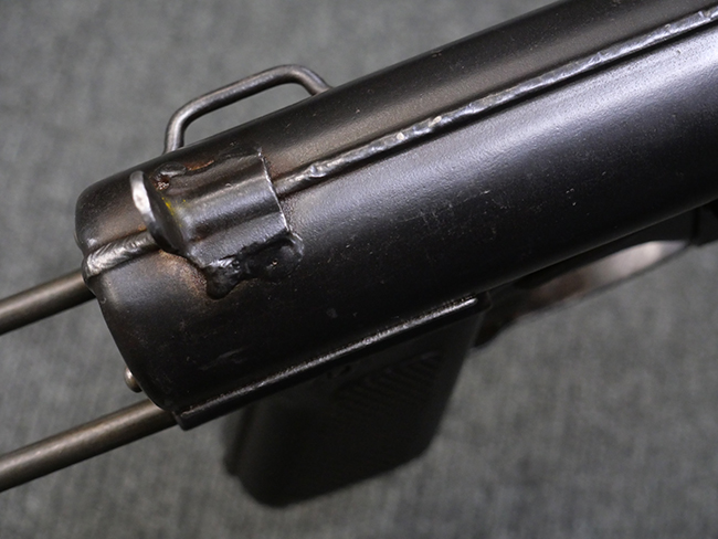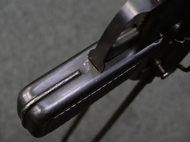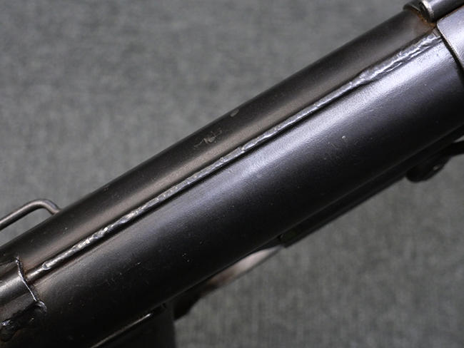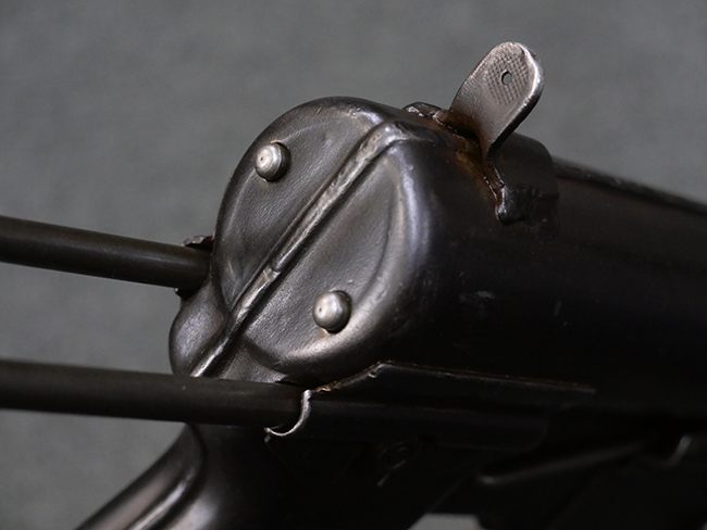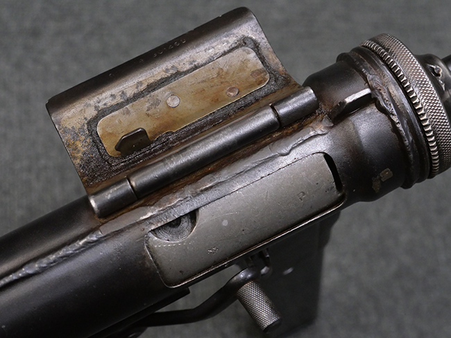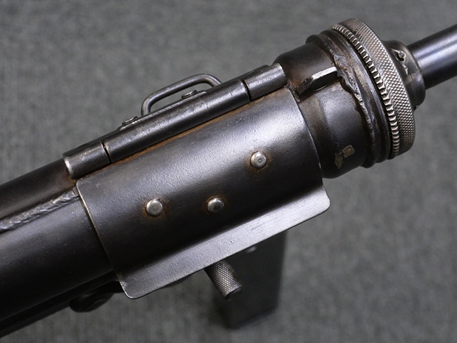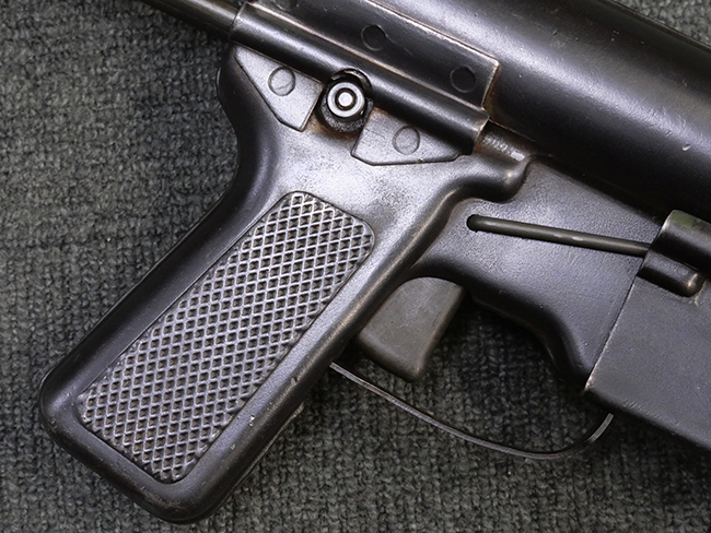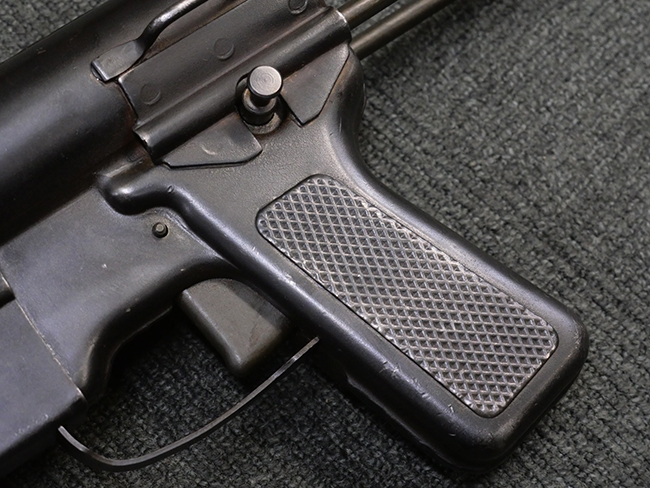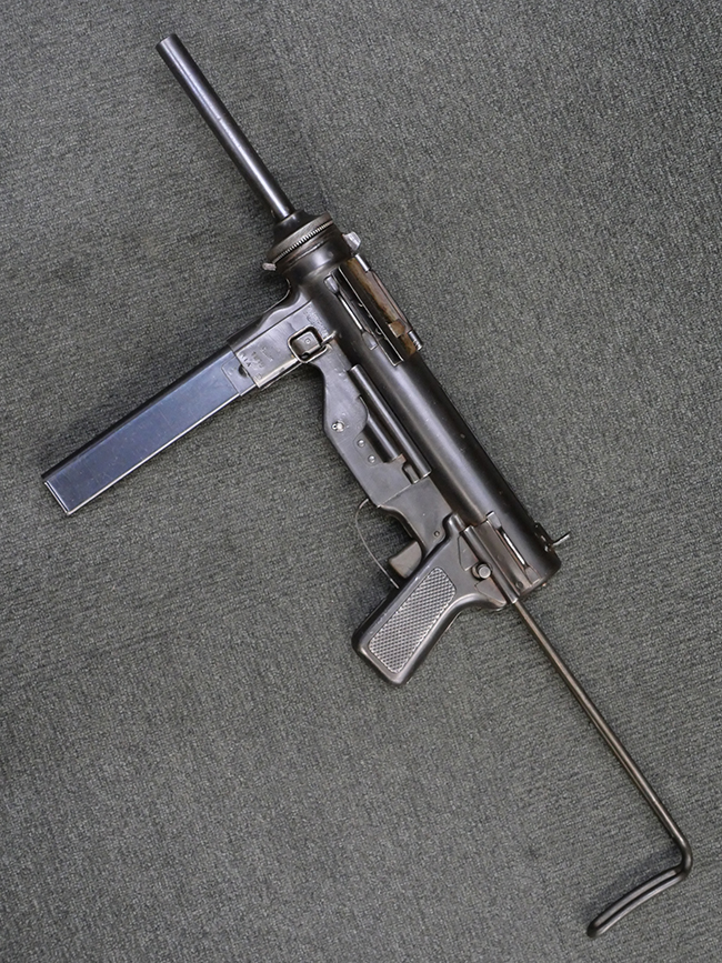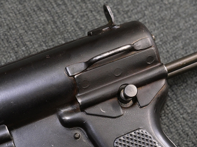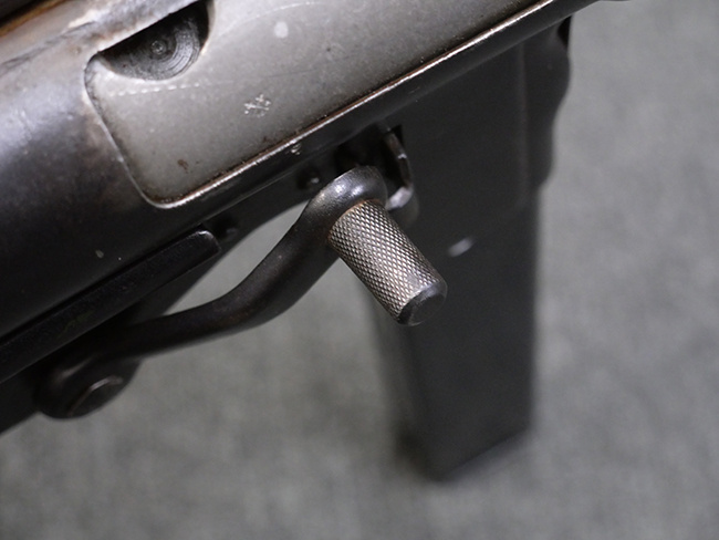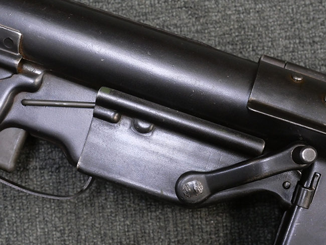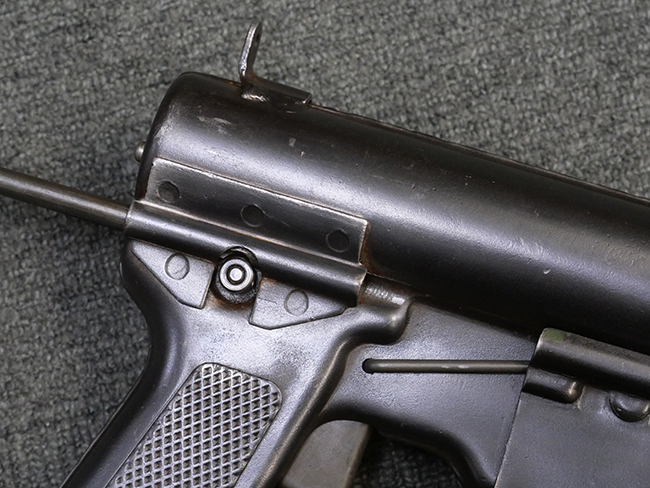M3短機関銃は元々生産性が高く単純な構造の短機関銃として設計されましたが、その後さらなる構造の簡略化を目指して、改良型が開発される事となりました。 1944年4月に改良型のプロトタイプであるM3E1と呼ばれるモデルがテストされ、同年の12月21日にM3A1短機関銃として採用されました。 M3A1短機関銃では、コッキング方式がクランク式からボルトに直接指をかけて行う方式に変更されました。 その為、エジェクション・ポートがM3に比べ1.5倍ほど長くなり、容易に判別が可能です。 またM1カービンと共用の筒型オイラーの使用を廃し、グリップ内にオイラーを内蔵しています。 ワイヤー・ストックについても改良が行われ、銃身取り外し時のレンチやマガジン・ローダーとして使用する事が可能となりました。 合計606,694挺が生産されたM3短機関銃に比べ、改良型のM3A1短機関銃は第二次世界大戦中にガイドランプで15,469挺、朝鮮戦争中にIthaca Gun Coで33,200挺が生産されたのみで、現存品は非常に少なくなっています。 (KK)